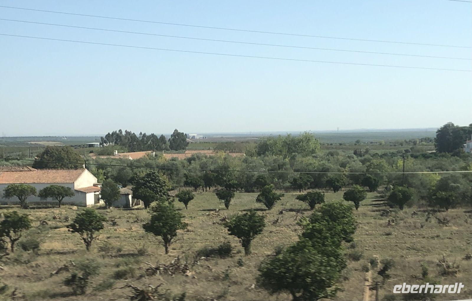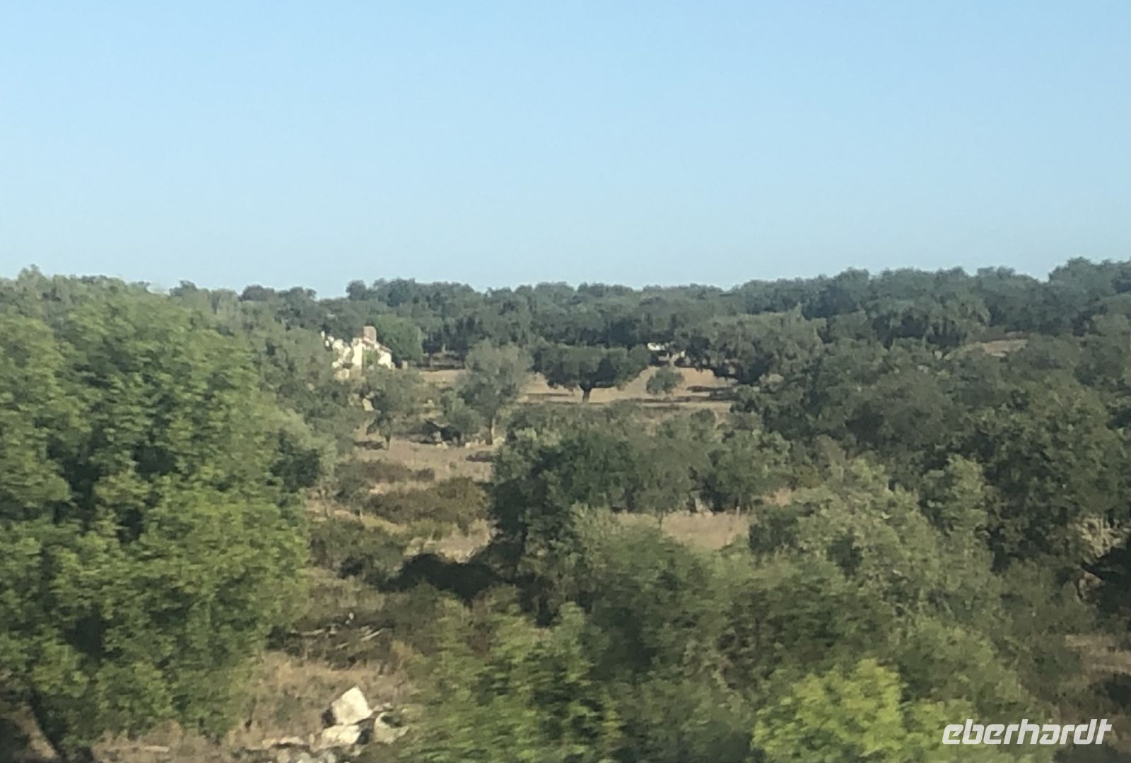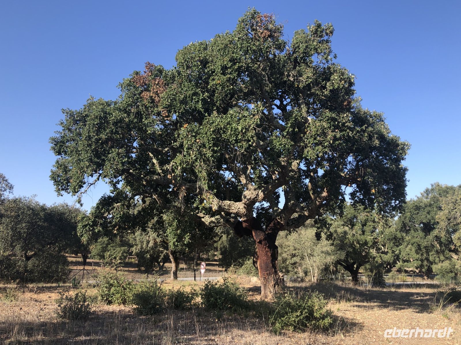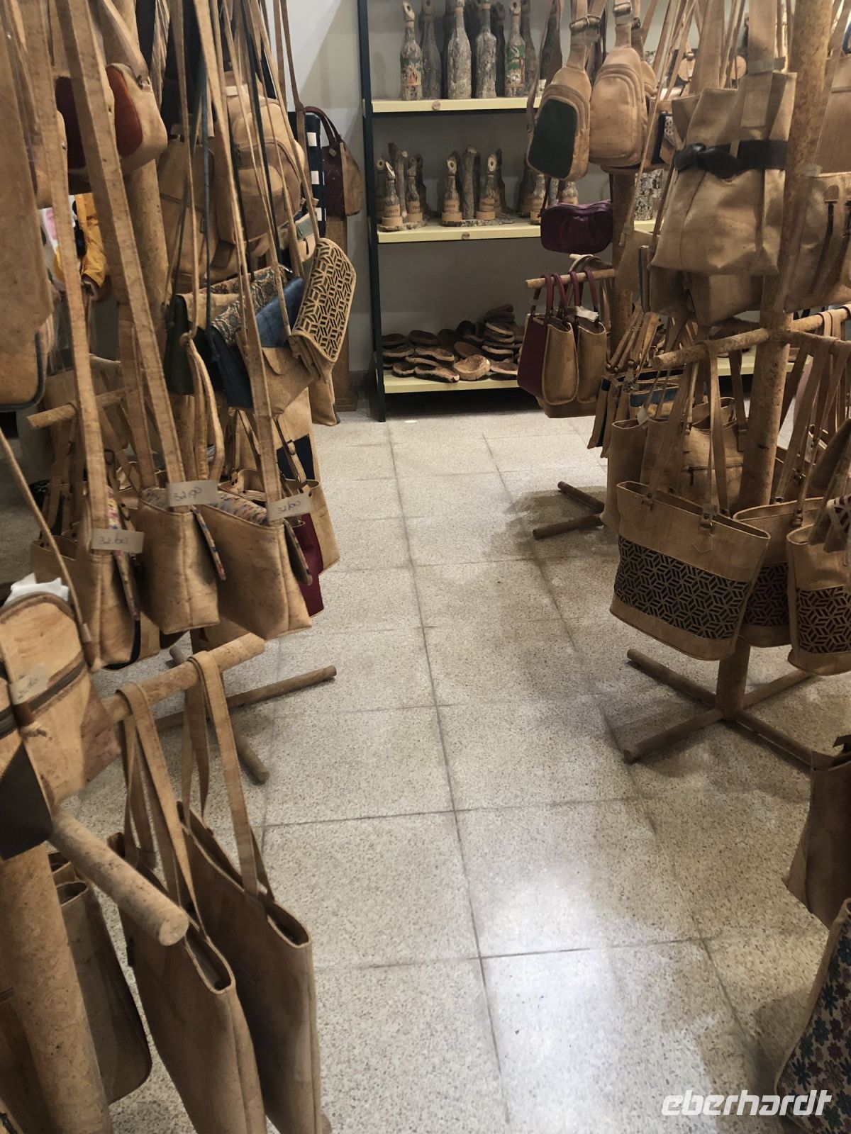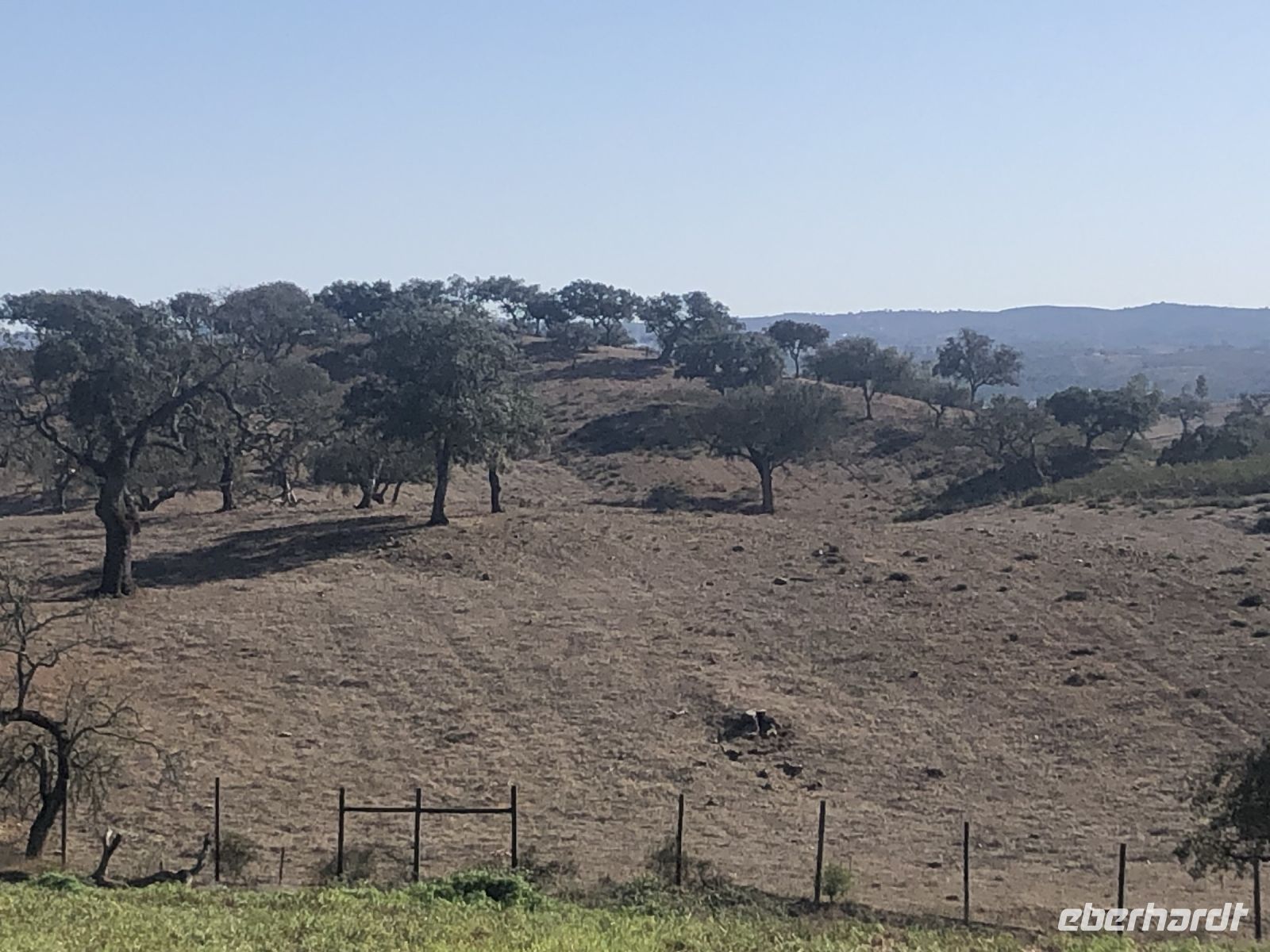 Das Alentejo-Gebiet, in dem wir uns nun befinden, ist eine sehr weitläufige eher flache und spärlich besiedelte Landschaft mit ländlichem Charakter. Großflächige Felder mit Olivenbäumen wechseln sich ab mit Pinien- und Korkeichenwäldern. Die Korkeiche ist gewissermaßen der Nationalbaum Portugals, denn das Land ist der weltgrößte Korkexporteur, vor allem von Flaschenkorken. Was alles aus Kork noch hergestellt werden kann, bestaunen wir beim Besuch einer Korkfabrik in Azaruja, wo wir viele Informationen über die Korkproduktion bekommen.