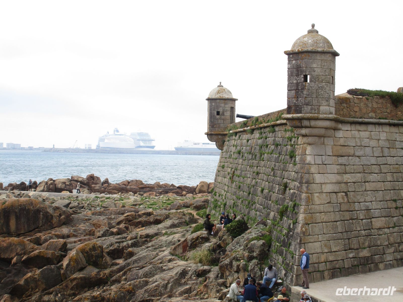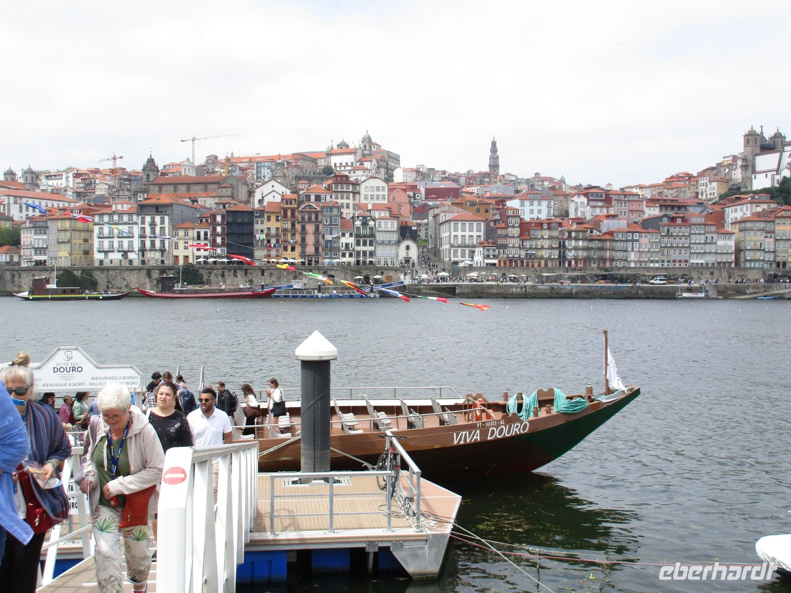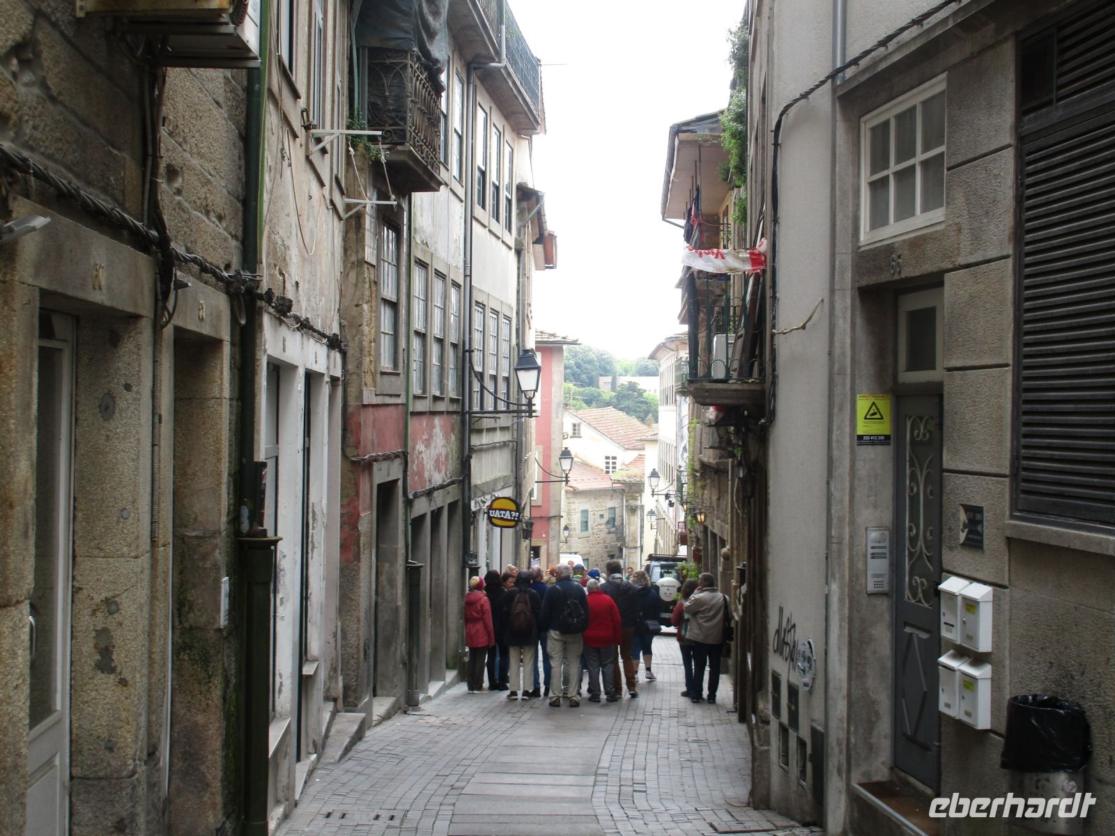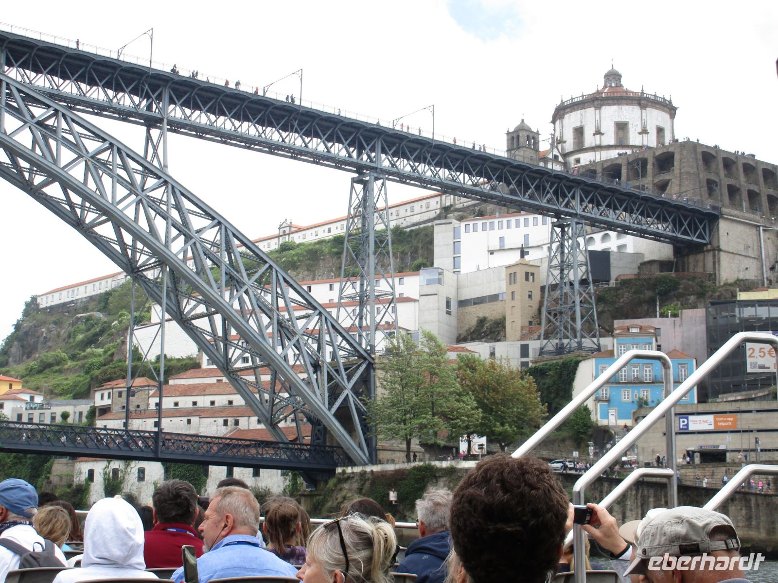 Als erstes begegnet uns das Denkmal von Vimara Peres, der im 9. Jahrhundert den Norden Portugals von den Mauren befreite. Daneben erstrahlt die Kathedrale, auch Sé genannt. Obwohl ihr Bau schon 1110 begann, wurde sie erst im 18. Jhd. eröffnet. Der Kirchenbau vereint romanische, barocke und gotische Baustile und besticht durch die edle Innengestaltung des italienischen Baumeisters Nicolao Nasoni. Der prägt übrigens das Stadtbild von Porto. Weiter geht es zur Börse, auch als Handelskammer Portos bezeichnet, die von der Königin Maria II. finanziert wurde. Die Stadt hatte nie einen Königspalast, aber hier gibt es einen Saal der Könige. Wir besichtigen alle Säle und bewundern die Porträts der Könige und jetzigen Bürgermeister Portos. Auch Gustave Eiffel hatte hier ein Arbeitszimmer. Teófilo Seyrig und Gustave Eiffel gründeten 1869 ein gemeinsames Unternehmen. Sie trennten sich nach 10 Jahren wieder, aber Ihre Brücken können wir heute noch bewundern. Wir begeben uns nun zur Ribeira, dem beliebten Ufer am Goldenen Fluss, wie der Douro auch genannt wird. Nach unserer Mittagspause unternehmen wir eine Bootsfahrt und durchqueren die berühmte Brücke Ponte Dom Luis I. von Seyrig, die Ponte Infante Dom Henrique und die Brücke Maria Pia, die Gustave Eiffel gebaut hat. Sie wird allerdings seit 30 Jahren nicht mehr benutzt, dafür gibt es aber dahinter eine neue Autobahnbrücke. Alle Brücken verbinden Porto und Vila Nova de Gaia. Wir sehen die Liegeplätze der Flusskreuzfahrtschiffe und fahren zurück Richtung Atlantik zur Mündung des Douro ins Meer. Am Ufer angekommen, erwartet uns der Bus und bringt uns zur Weinkellerei „Rozés“. Hier verkosten wir leckeren weißen und roten Portwein. Danach überraschen uns Isabel und José noch mit einer wunderschönen Tour entlang der Uferstraße bis Matosinhos, wo wir an der „Käseburg“ noch einige Schnappschüsse mitnehmen können. Durch die mondäne Wohngegend Portos geht es zurück zu unserem Hotel. Nach einer Stunde Ruhezeit stehen wir schon wieder bereit, denn wir fahren zum Ufer Ribeira, wo sich unser nettes Lokal „Chez Lapin“ befindet, in dem wir heute Abend verwöhnt werden. Anschließend bringt uns José zum Hotel zurück und so endet der erste Tag mit vielen neuen Bildern im Kopf.
