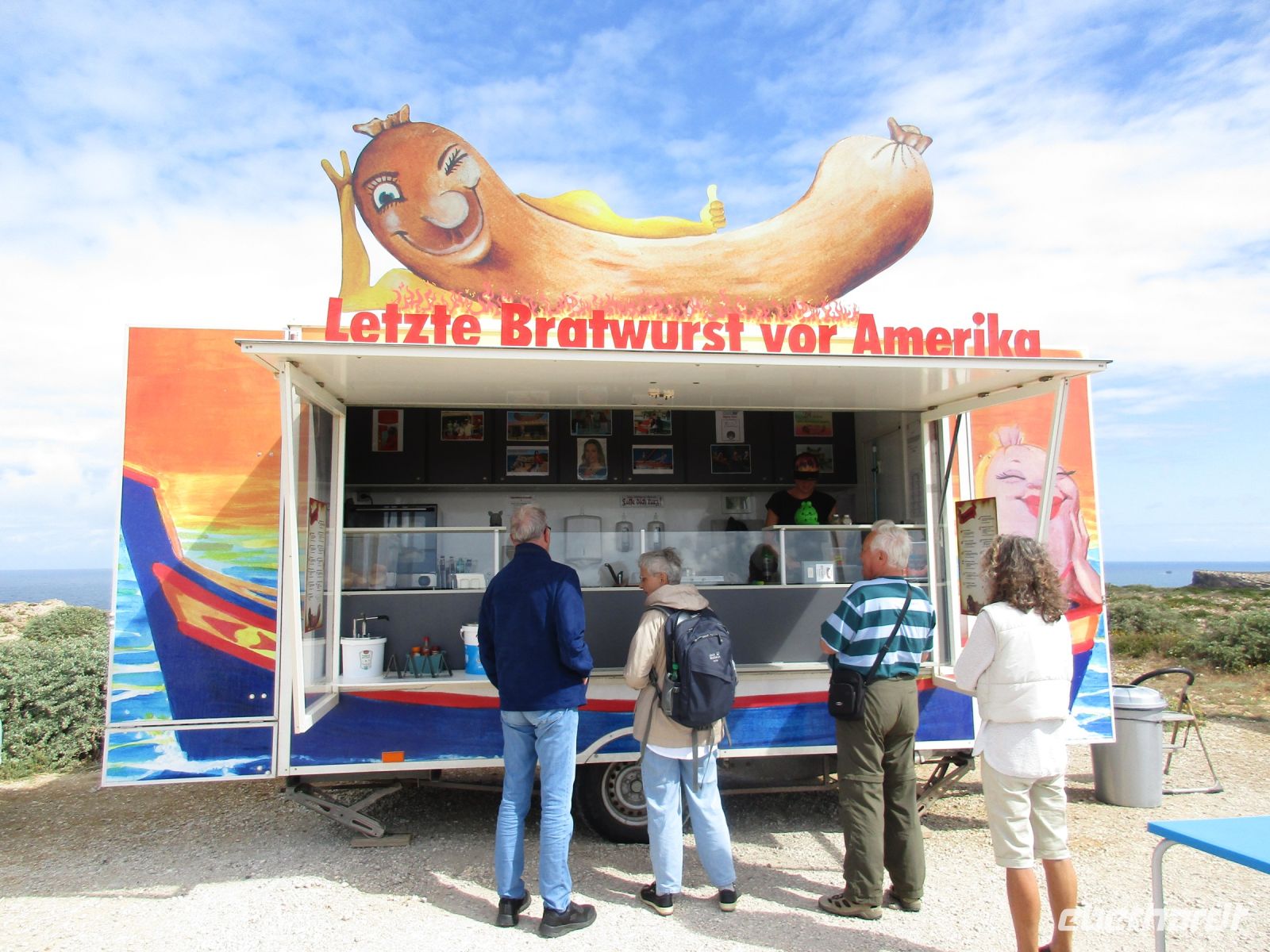 Das Tor zum Leuchtturm ist heute verschlossen, aber es gibt genügend andere lohnende Motive. Neben dem Leuchtturm schießen wir unsere persönlichen Fotos vom südwestlichsten Punkt des Europäischen Festlandes. Der Bratwurst-Stand mit der „Letzten Bratwurst vor Amerika“ öffnet gerade, als wir ihn fotografieren wollen. Thüringer Bratwurst am südwestlichsten Zipfel Portugals. Was für eine geniale Idee!