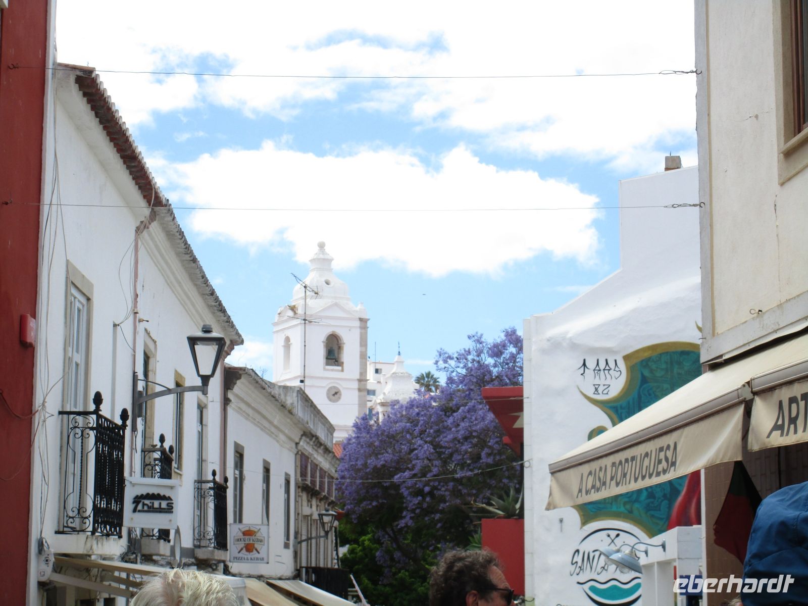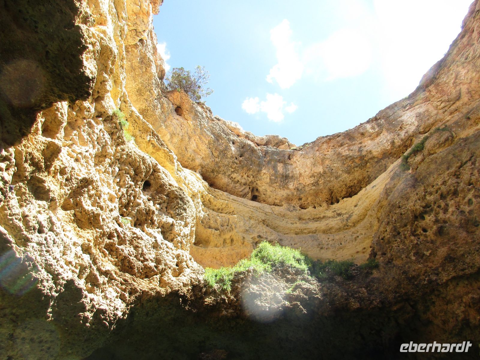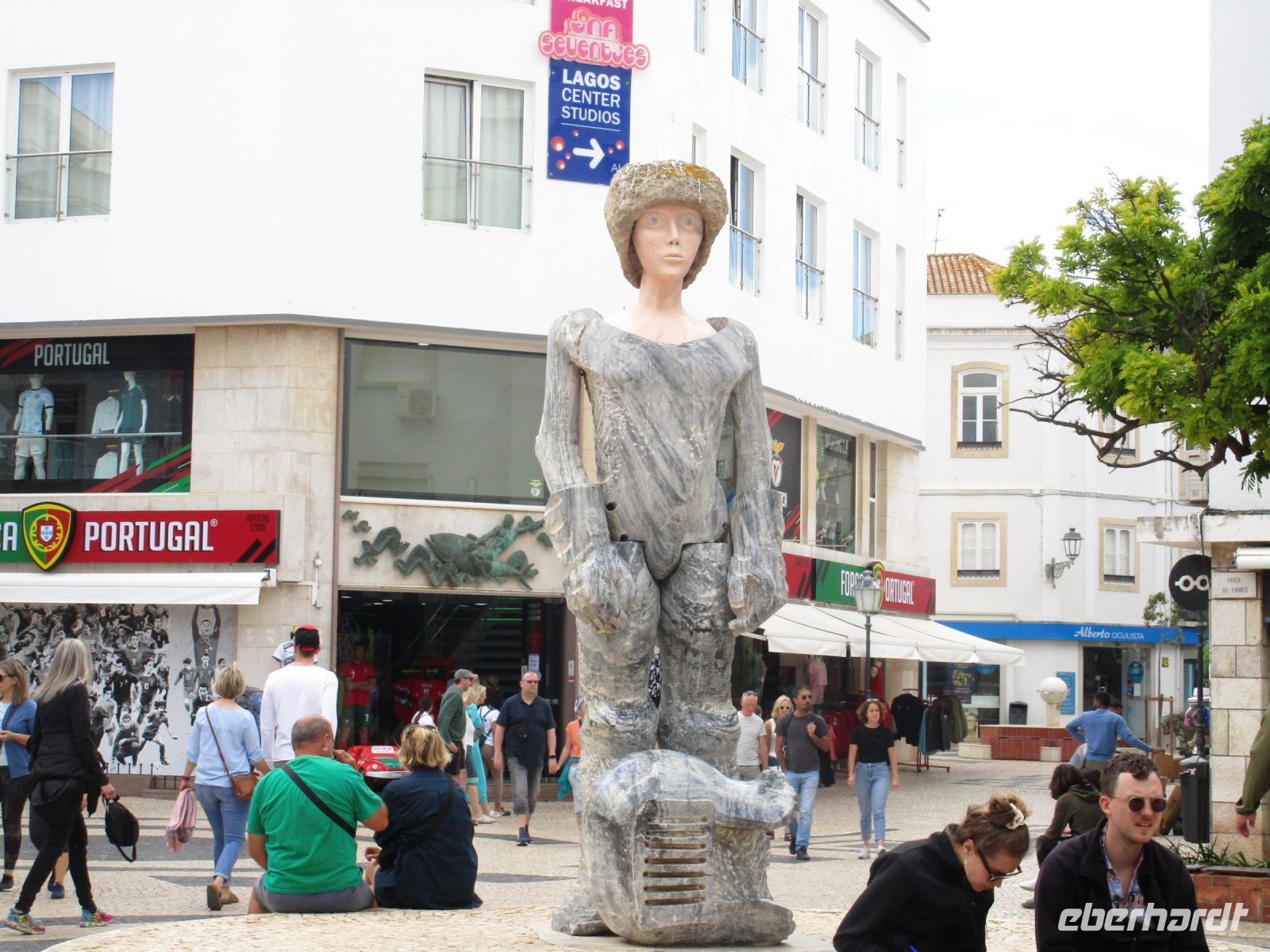 Die kraftvolle Natur ringsum ist beeindruckend. Weiter geht es nach Lagos. Die Stadt lädt zum Urlaub machen ein. Vom Denkmal König Sebastians aus erkunden wir den Ort, sehen den Umschlagplatz, wo der Sklavenhandel stattfand, und treffen wieder auf Heinrich den Seefahrer, der als Denkmal auf seinem Sockel thront, umgeben von blühenden blauen Yacarandas. Natürlich gibt es in Lagos auch hübsche Kirchen, wie die des Sao Sebastiao. Die Festung ist geöffnet, was wir noch ausnutzen, um den traumhaften Ausblick zu genießen. Auf dem Rückweg zum Bus reift in uns die Idee, noch eine Grottenfahrt zu unternehmen. Das geht am besten ab Armacao de Pera, Benagil. Elisabeth telefoniert sofort mit dem Anbieter „Sétima Ondas“ und wir finden sofort 9 Teilnehmer aus der Gruppe und lassen reservieren. Der Busfahrer ist so nett und setzt uns dort am Strand ab. Die anderen fahren zurück zum Hotel. Unsere Bootsfahrt ist ein großartiges Abenteuer für uns und macht viel Spaß. Ein schönes Erlebnis zum Abschluss, das man nur empfehlen kann. Beim Abendessen im Hotel gibt es viel zu berichten. Ein weiter schöner und erlebnisreicher Tag geht zu Ende.