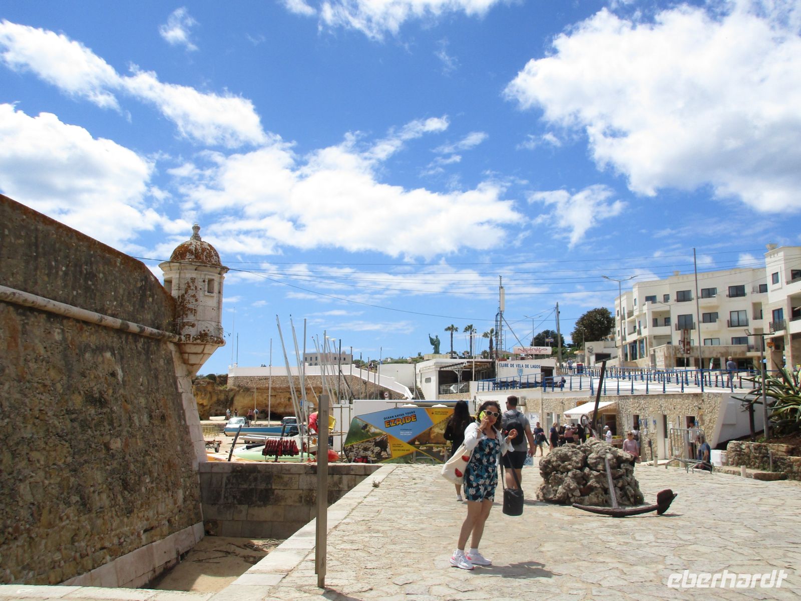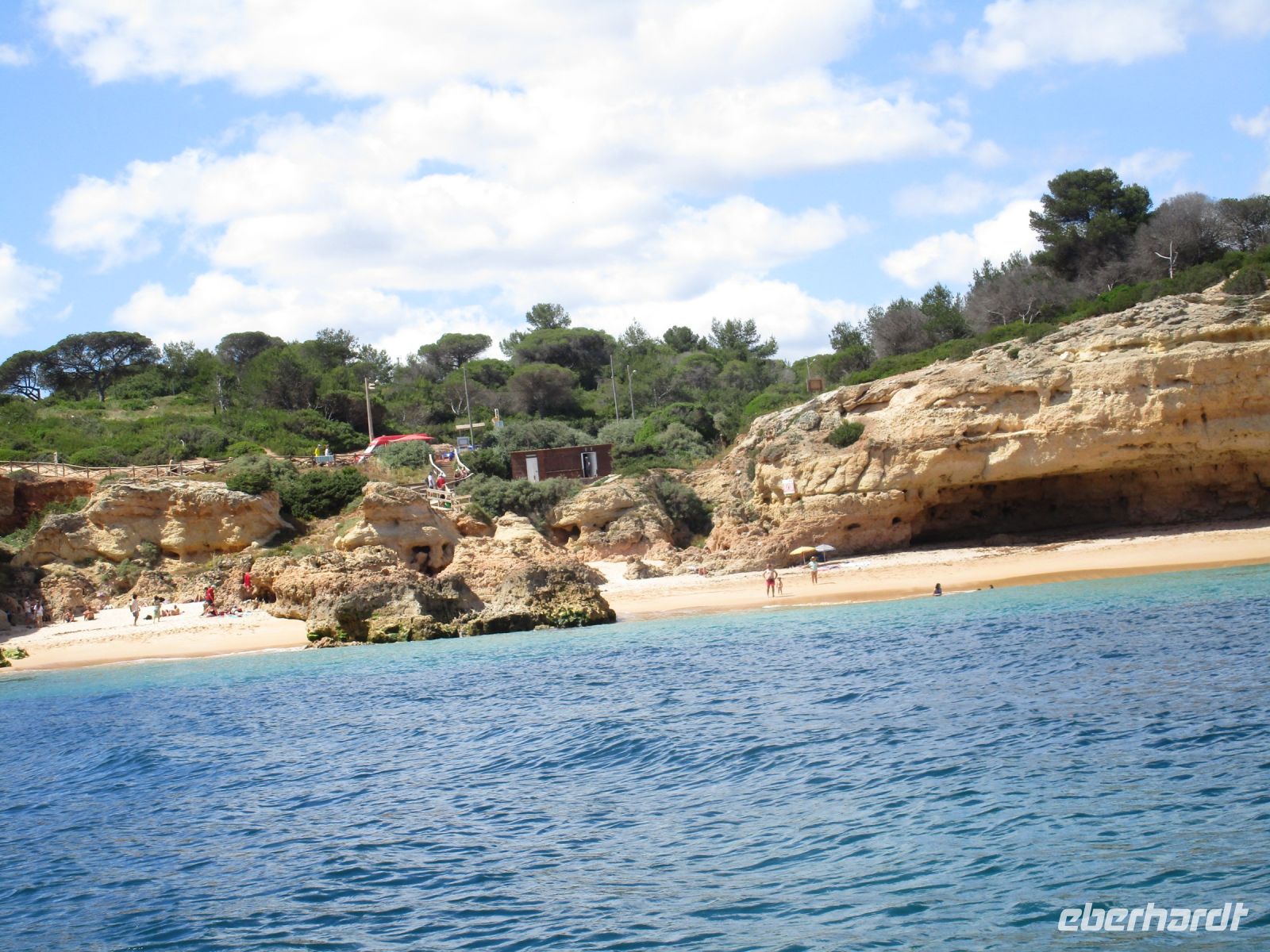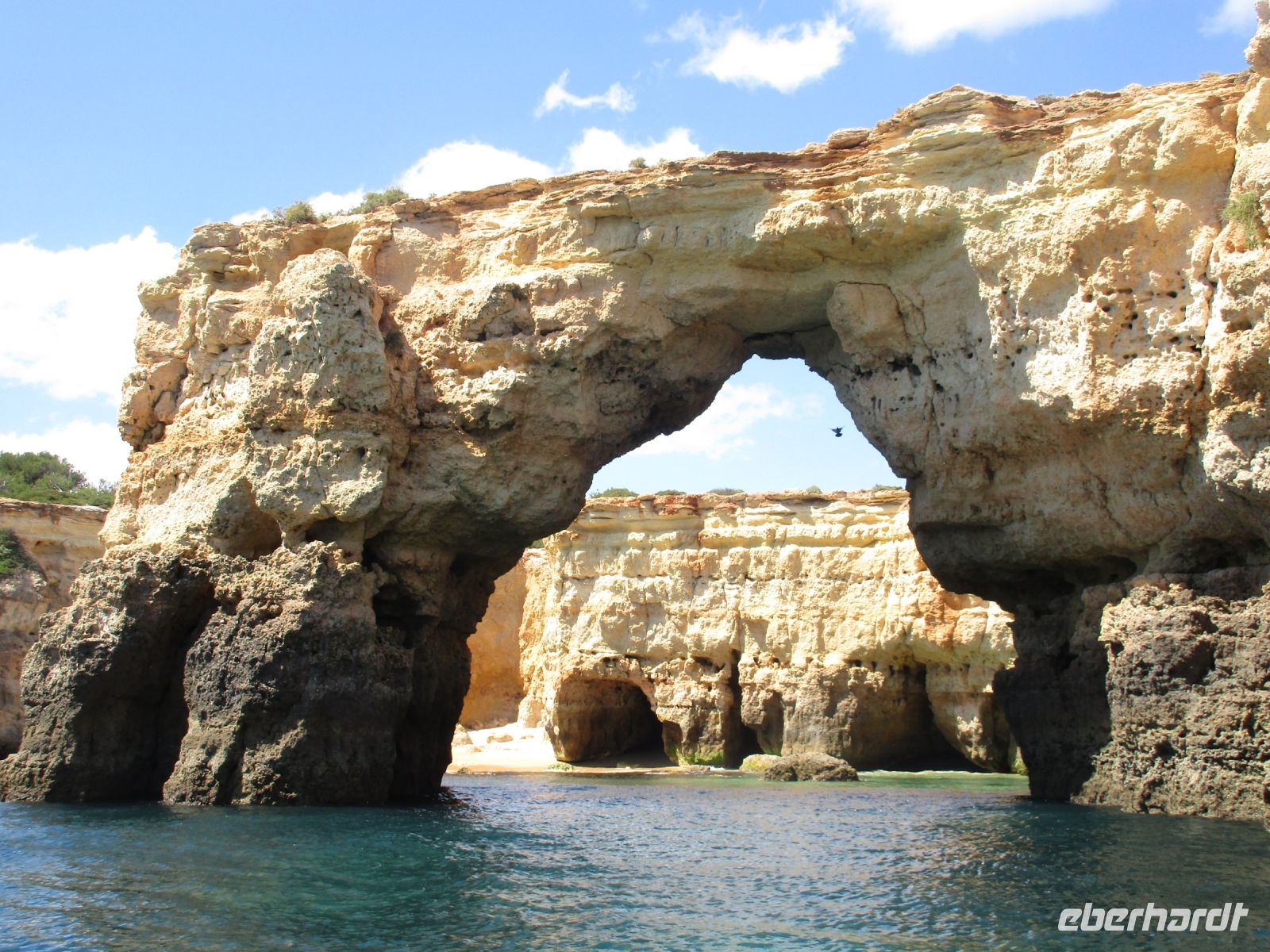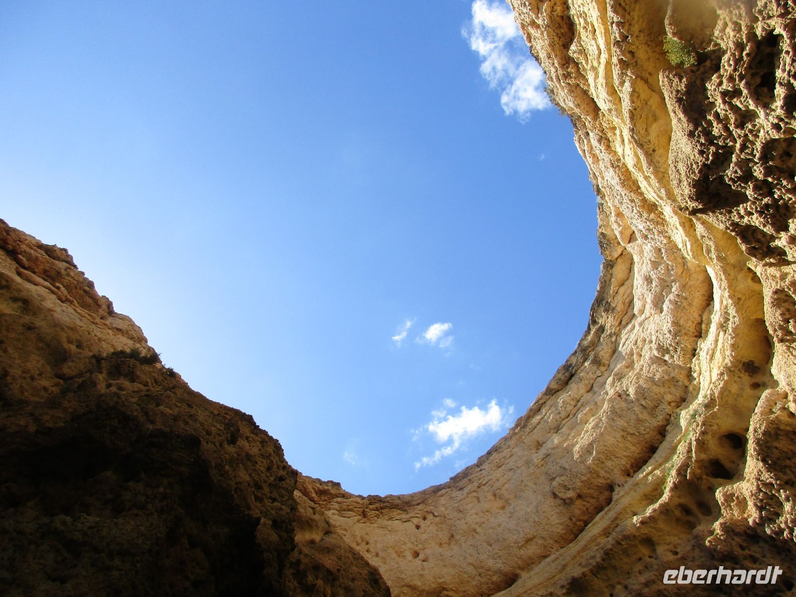Die kraftvolle Natur ringsum ist beeindruckend. Weiter geht es nach Lagos. Die Stadt lädt zum Urlaub machen ein. Vom Denkmal König Sebastians aus erkunden wir den Ort, sehen den Umschlagplatz, wo der Sklavenhandel stattfand, und treffen wieder auf Heinrich den Seefahrer, der als Denkmal auf seinem Sockel thront, umgeben von blühenden blauen Yacarandas. Natürlich gibt es in Lagos auch hübsche Kirchen, wie die des Sao Sebastiao. Die Festung ist geöffnet, was wir noch ausnutzen, um den traumhaften Ausblick zu genießen. Auf dem Rückweg zum Bus reift in uns die Idee, noch eine Grottenfahrt zu unternehmen. Das geht am besten ab Armacao de Pera, Benagil. Elisabeth telefoniert sofort mit dem Anbieter „Sétima Ondas“ und wir finden sofort 9 Teilnehmer aus der Gruppe und lassen reservieren. Der Busfahrer ist so nett und setzt uns dort am Strand ab. Die anderen fahren zurück zum Hotel. Unsere Bootsfahrt ist ein großartiges Abenteuer für uns und macht viel Spaß. Ein schönes Erlebnis zum Abschluss, das man nur empfehlen kann. Beim Abendessen im Hotel gibt es viel zu berichten. Ein weiter schöner und erlebnisreicher Tag geht zu Ende.