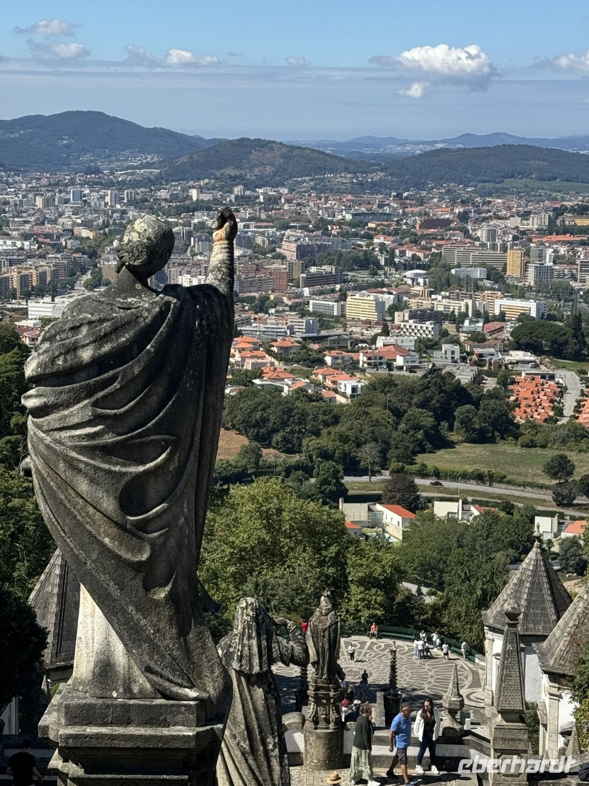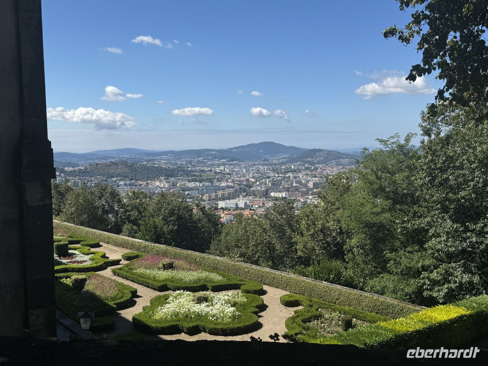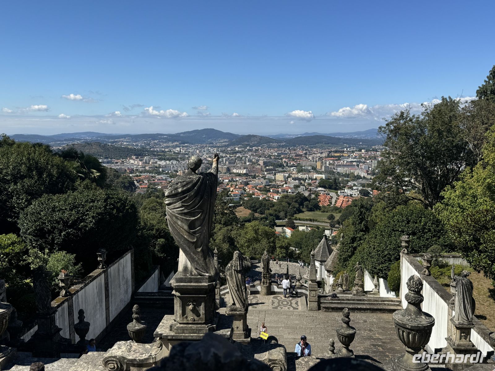 Beim Besuch des Wallfahrtsortes Bom Jesus do Monte (Guter Jesus vom Berge) bei sommerlichen 25°, dessen markanteste Merkmal die barocken Monumentaltreppen sind, die über einen Höhenunterschied von 116 Metern über mehr als 600 Stufen führen können wir einen herrlichen Ausblick auf Braga, die drittgrößte Stadt Portugals erleben. Diese wichtige Wallfahrtsstätte ist seit 1970 Nationaldenkmal und stand seit 2017 auf der Tentativliste zum Welterbe in Portugal. Im Juli 2019 wurde sie dann von der UNESCO zum Weltkulturerbe erklärt.