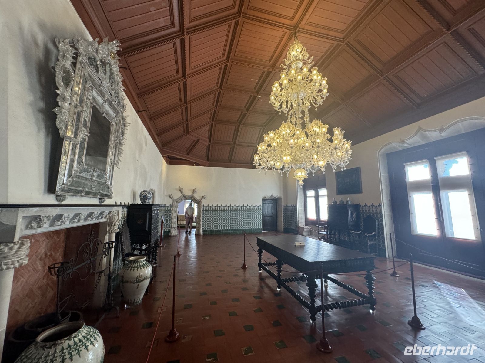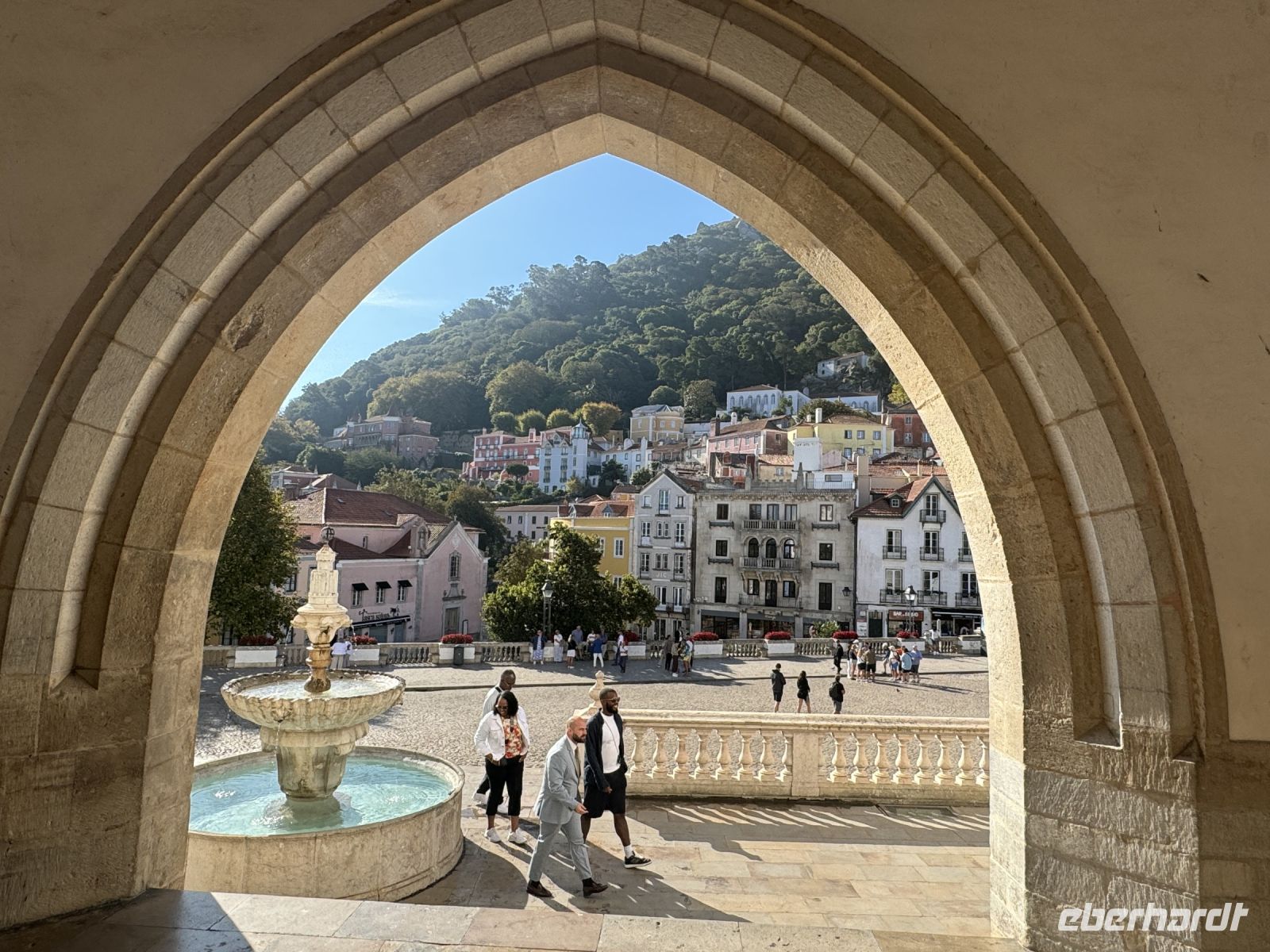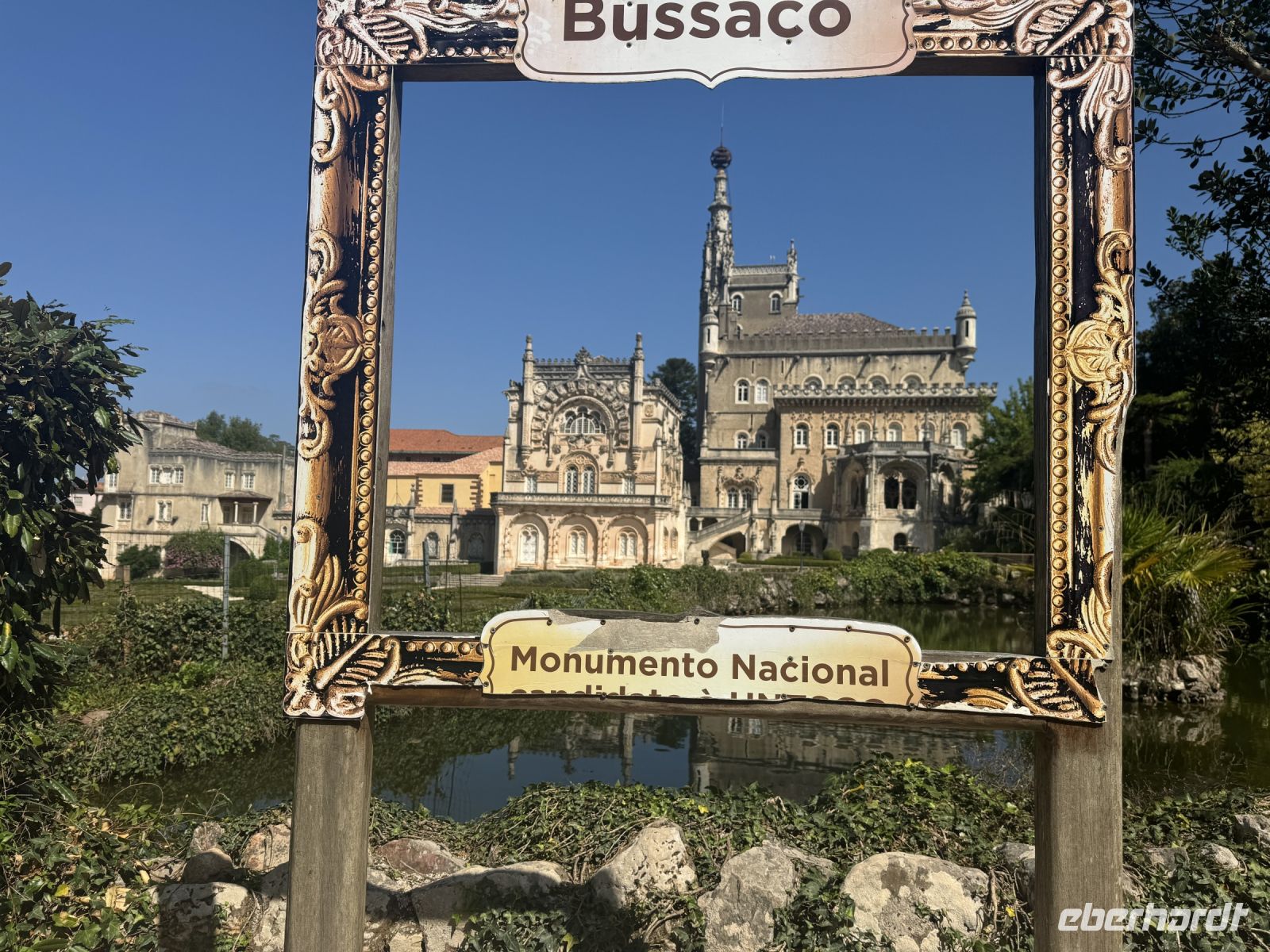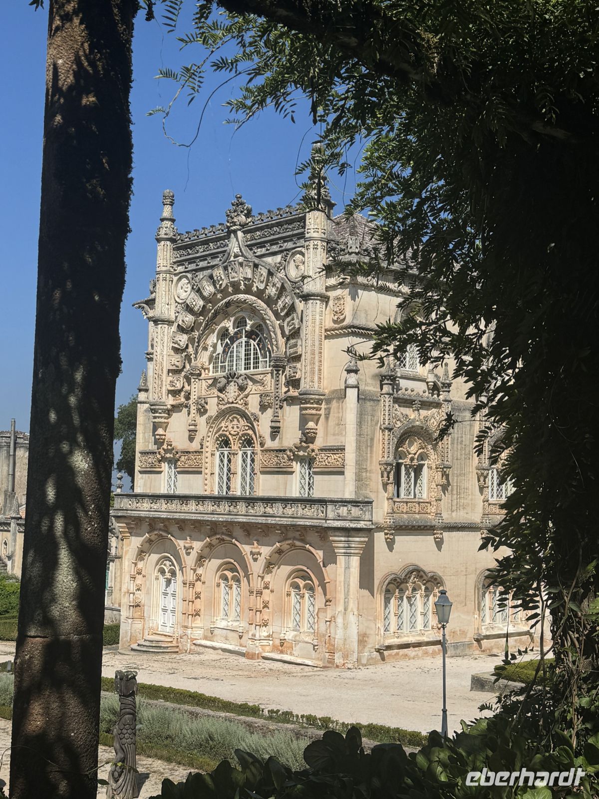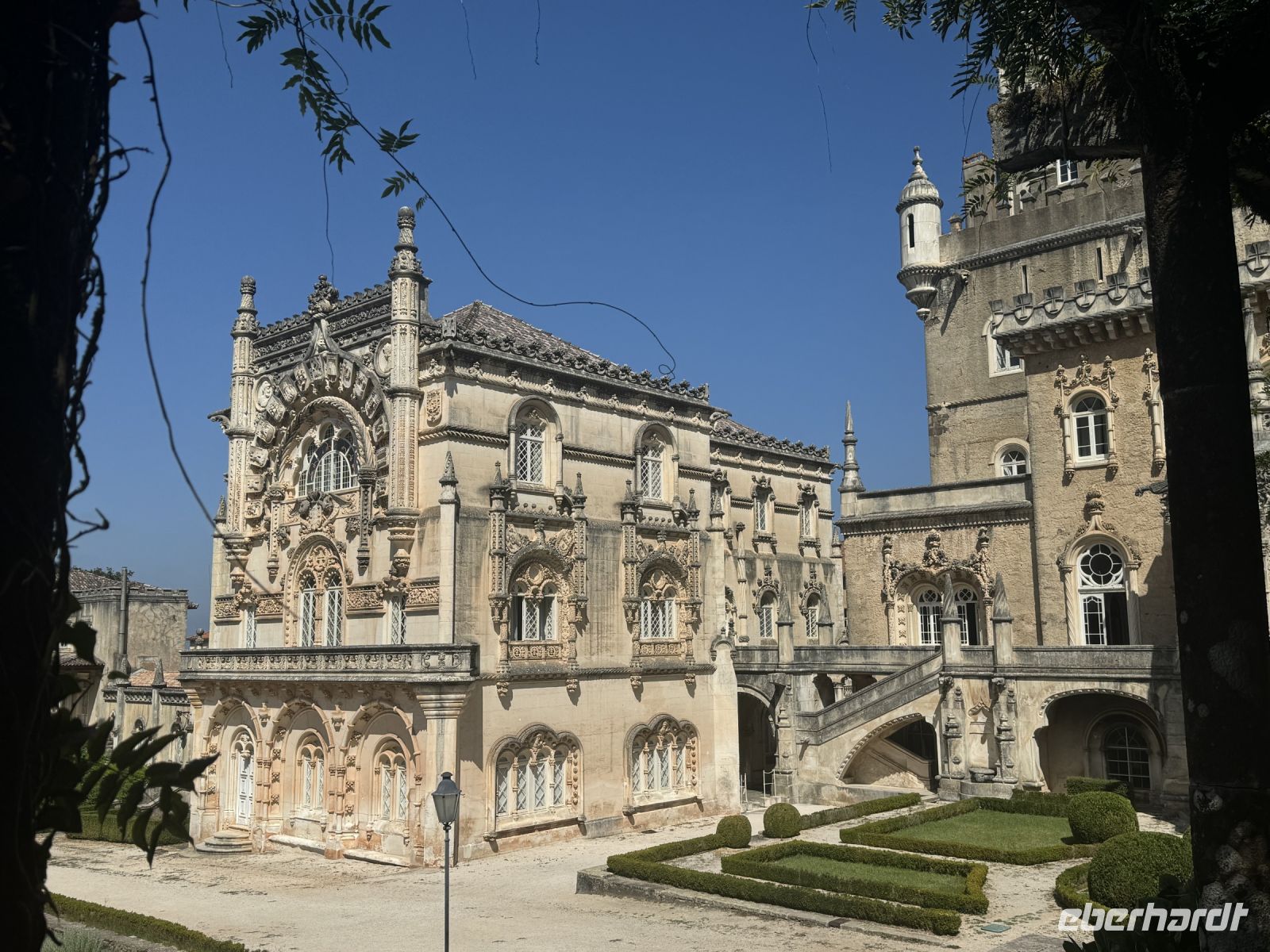 Hier befindet sich auch das ehemalige Jagdschloss der portugiesischen Könige, seit 1917 als Palace Hotel. Im neo-manuelinischen Stil dürfen sich die Gäste wie in einem Märchenschloss fühlen, mit Türmchen, Azulejos und, verzierten Säulen.