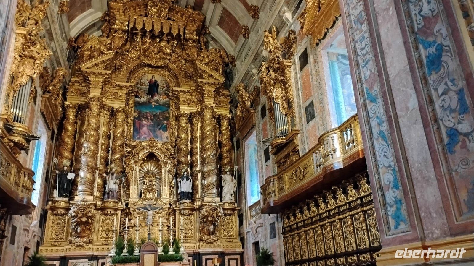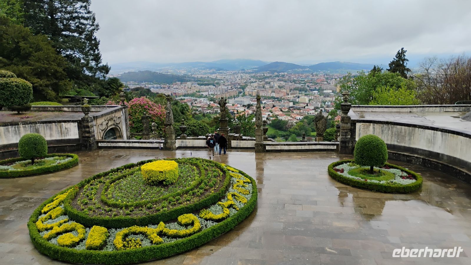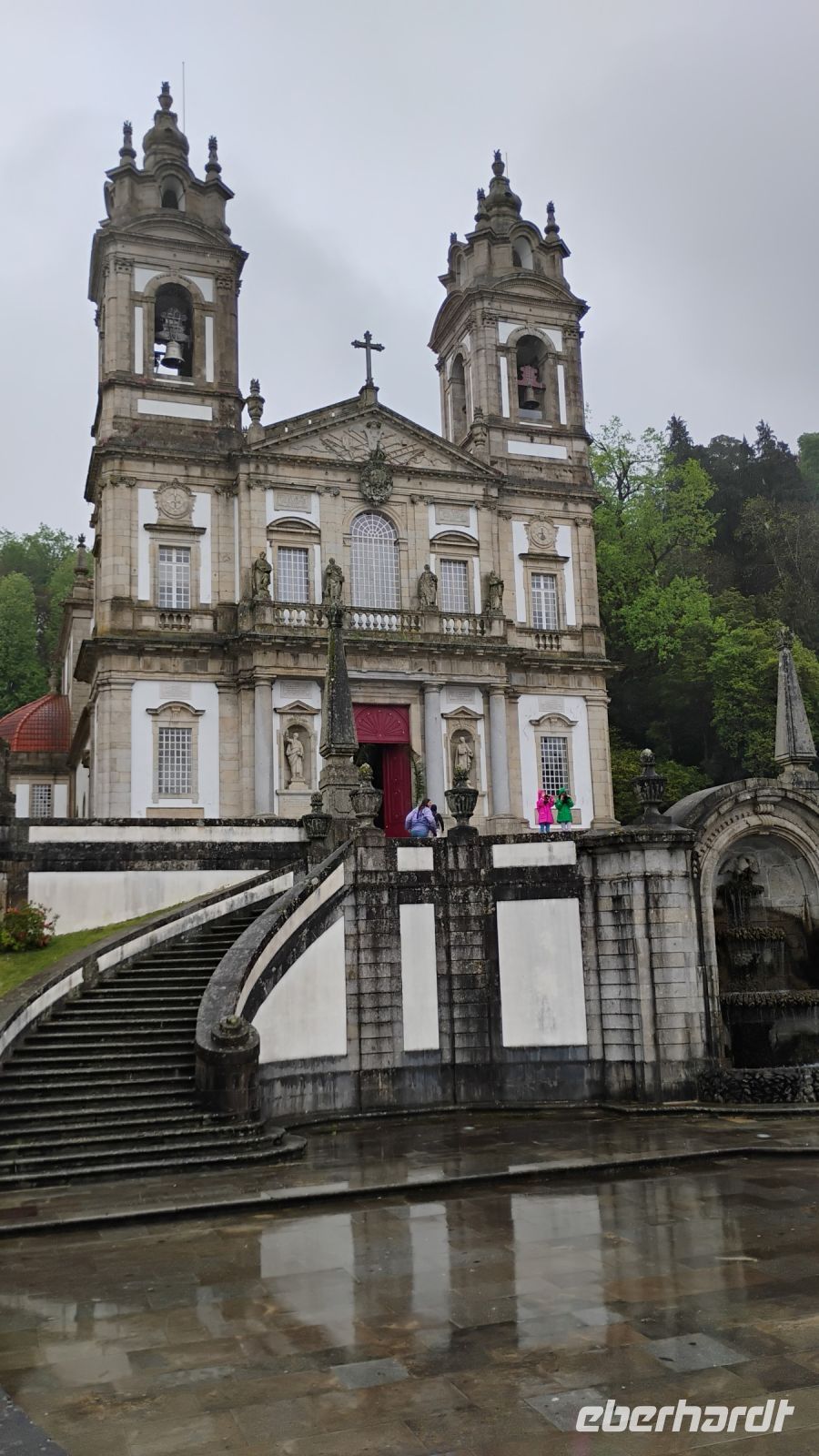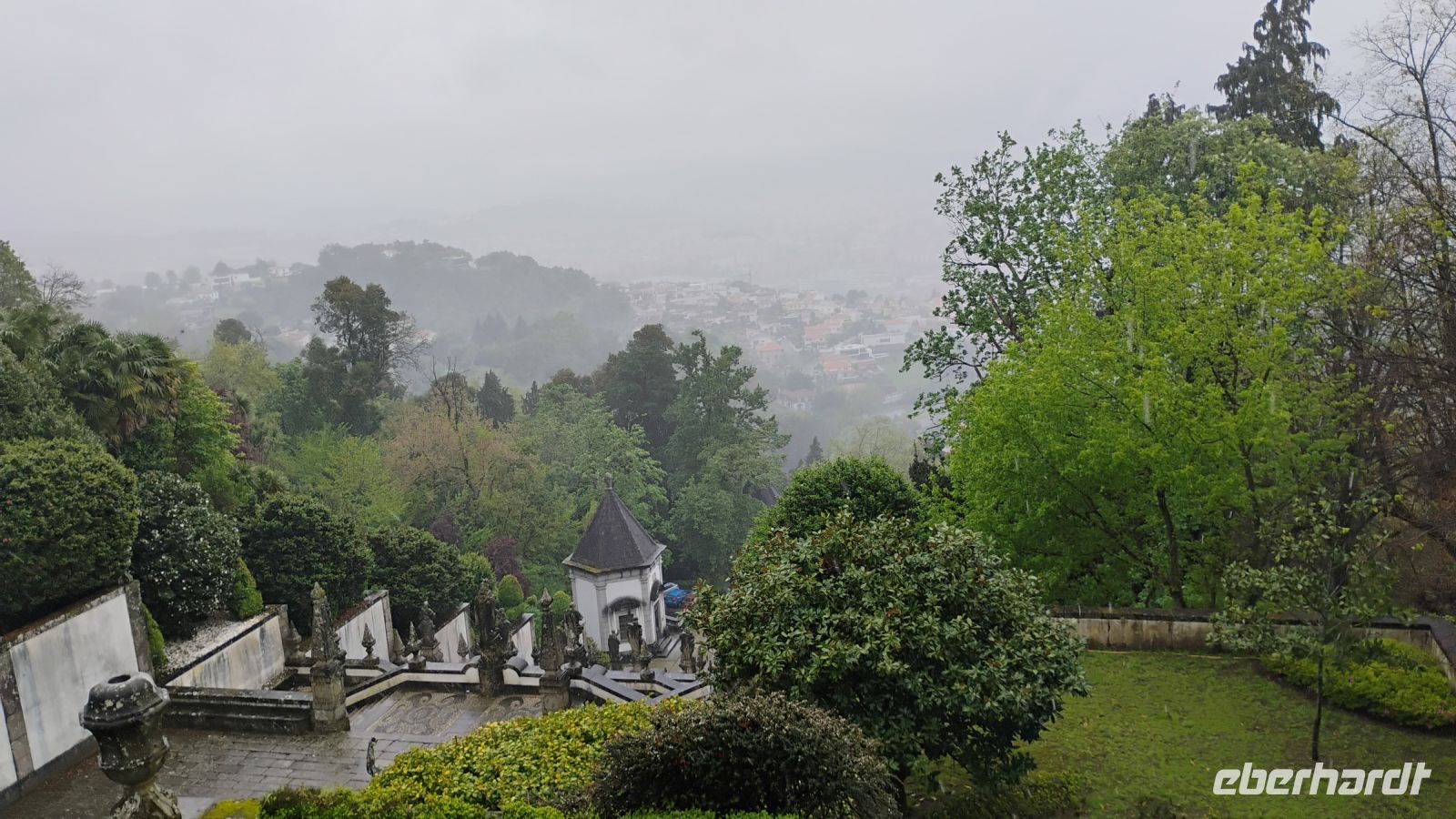 Oben angekommen besichtigten wir die Wallfahrtskirche Bom Jesus, deren Altarraum eine beeindruckende Kreuzigungsszene zeigt. Die Kirche von Bom Jesus ist nach Fátima der zweitgrößte Wallfahrtsort Portugals. Bis zur Eröffnung des Heiligtums von Fátima war sie der meistbesuchte Pilgerort des Landes – ein Ort der Stille und Andacht, umgeben von einer wunderschönen Parkanlage. Nach der Besichtigung der Kirche ließ der Regen kurz nach, auch wenn der erhoffte weite Blick auf Braga weiterhin durch die Wolken etwas verborgen blieb.