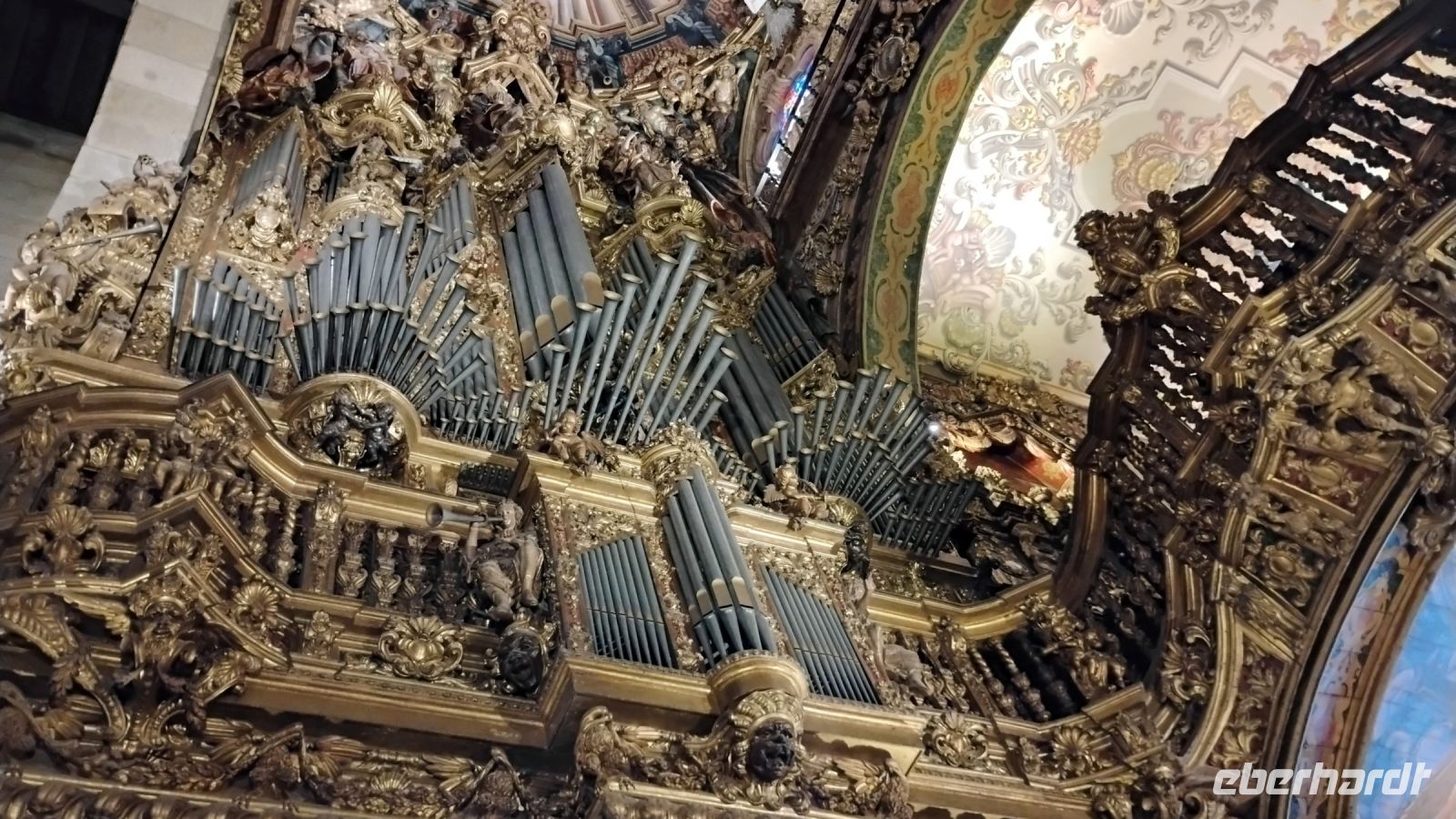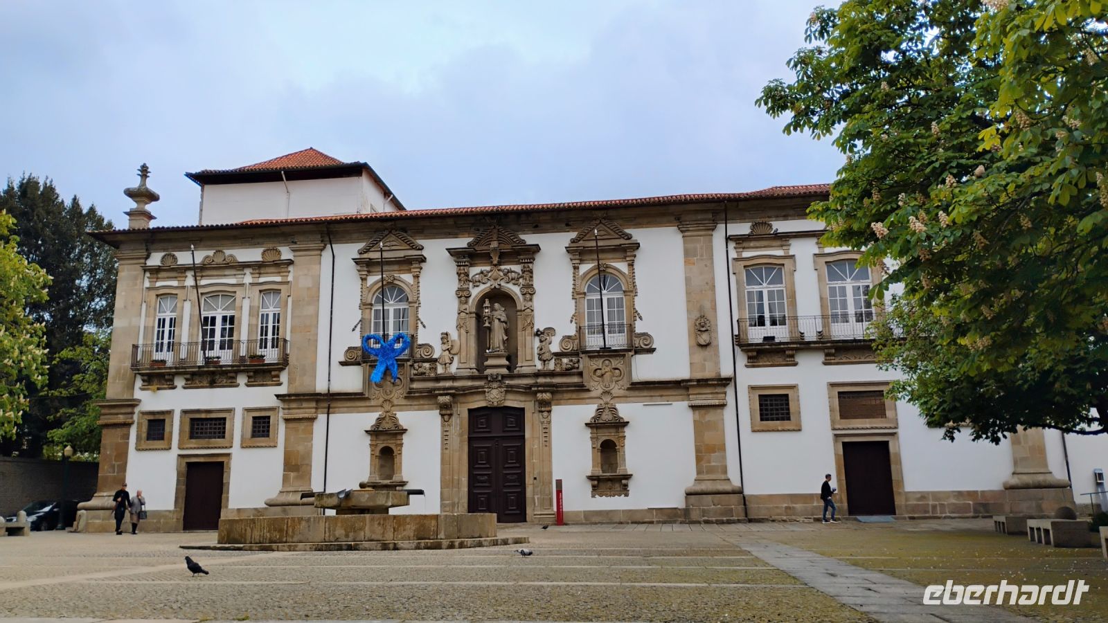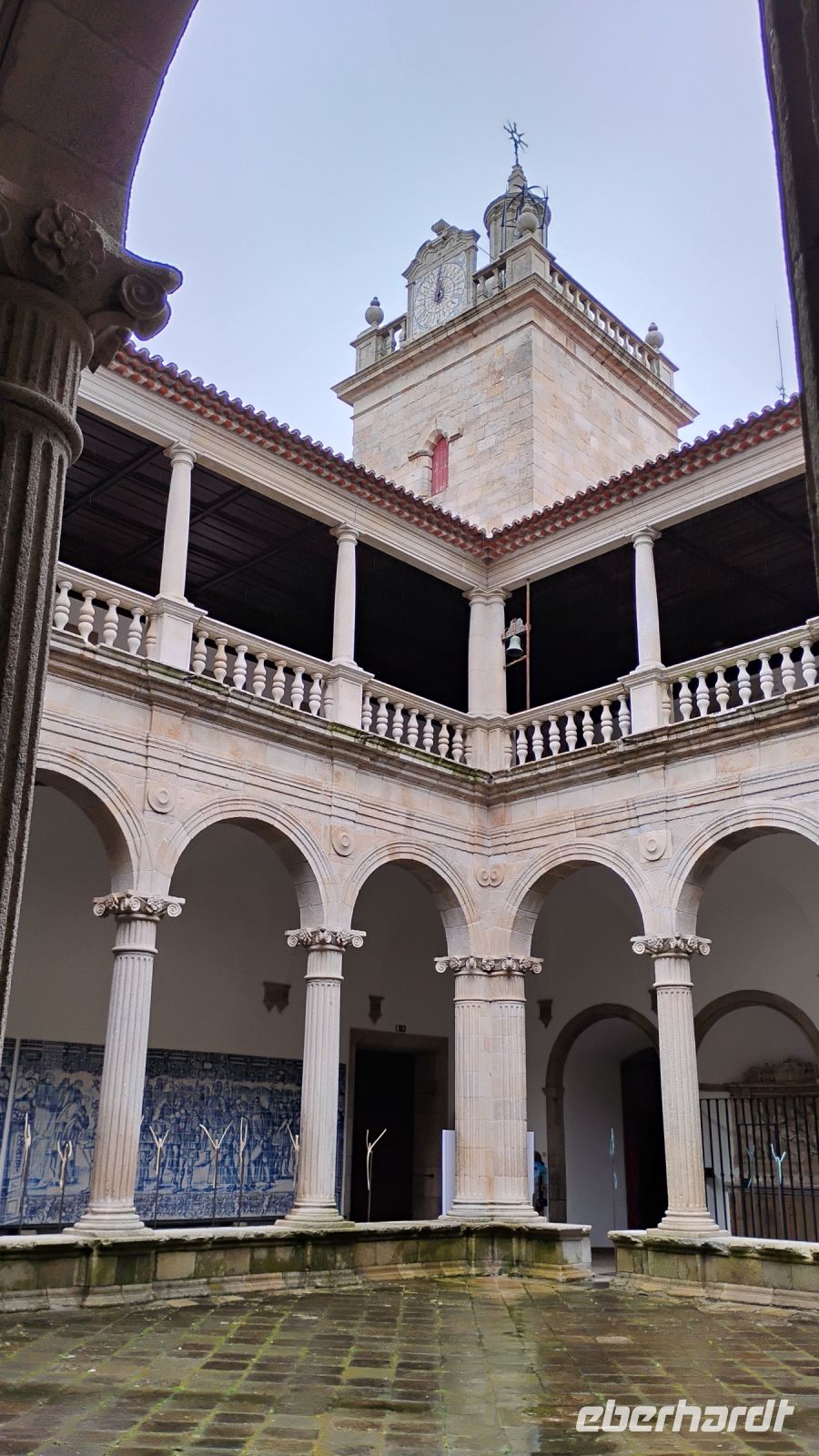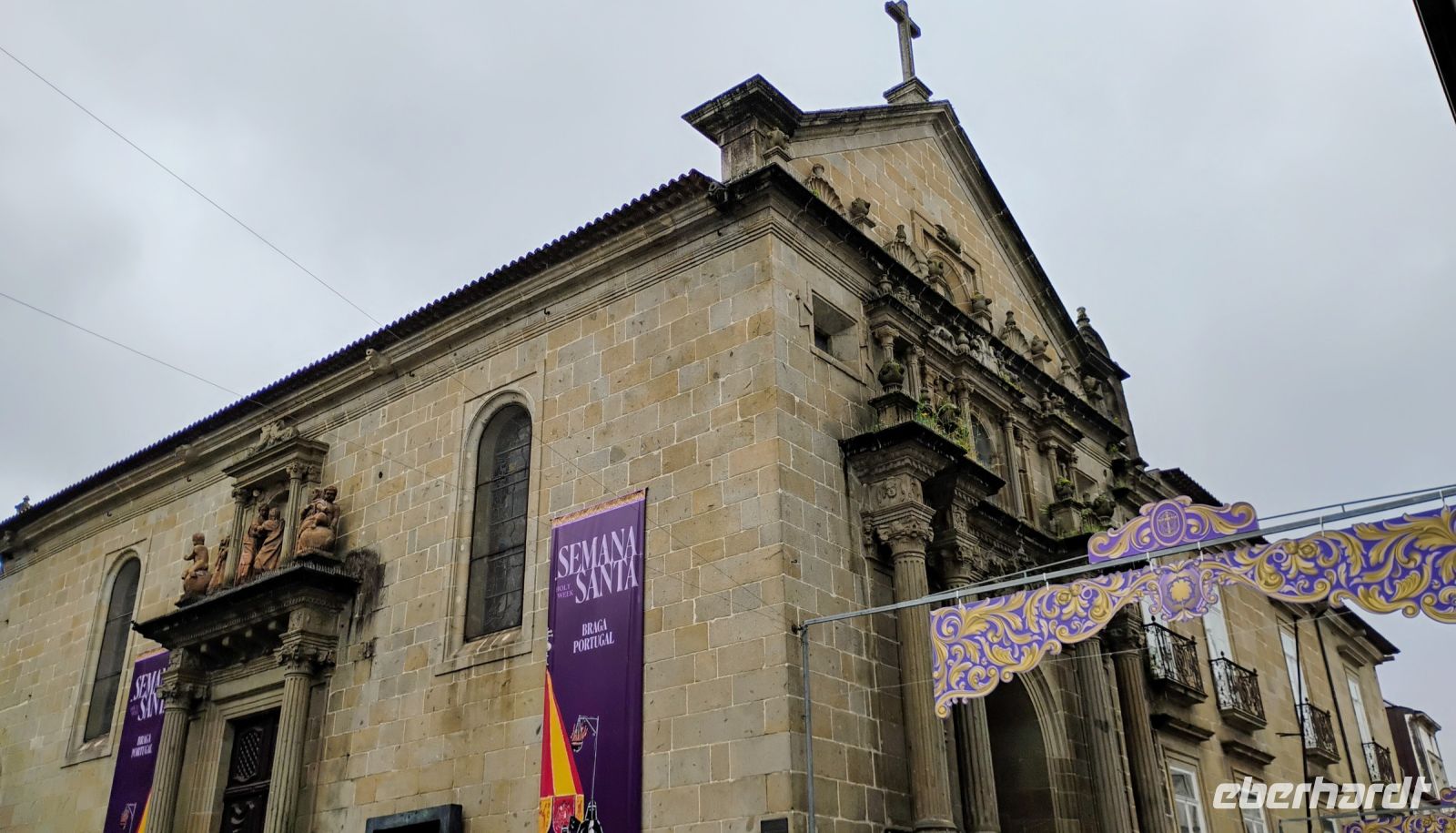 Unsere letzte Station war Braga, das auch als „portugiesisches Rom“ bekannt ist. Nach einer Mittagspause wagten wir uns trotz des wieder einsetzenden Regens noch für einen Spaziergang in die Altstadt, wo wir die Kathedrale von Braga besichtigten. Besonders beeindruckend war die barocke Orgel der Kathedrale. Sie ist eine der ältesten und schönsten in Portugal und bekannt für ihre außergewöhnliche Akustik. Leider konnten wir die Orgel an diesem Tag nicht hören, da wir uns in der Karwoche befinden. Die violetten Dekorationen in der Kathedrale und über der Fußgängerzone, zusammen mit der sakralen Musik, die über Lautsprecher in der Stadt erklang, verstärkten die besondere Atmosphäre.