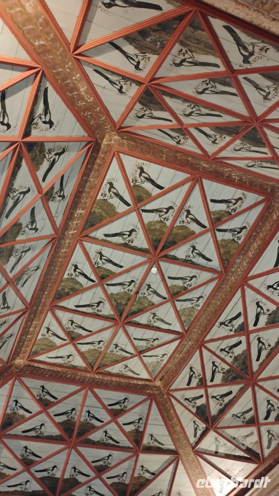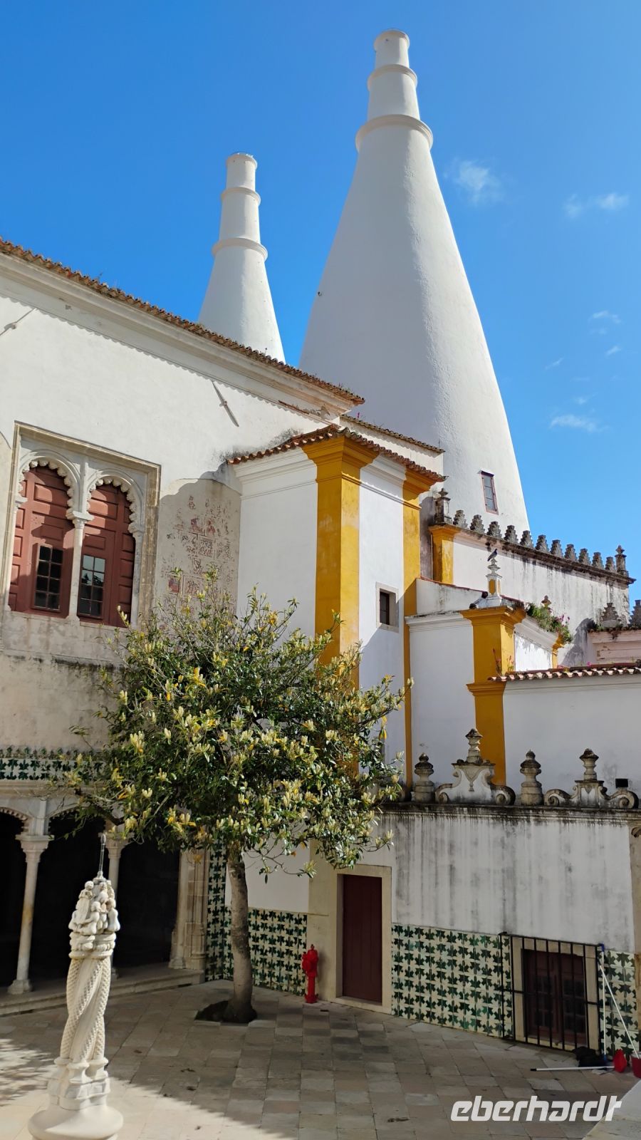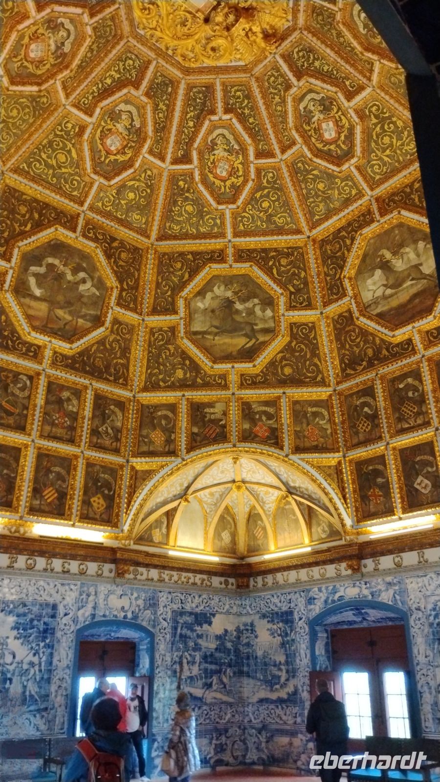 Wir besichtigten den Nationalpalast von Sintra, einst Sommerresidenz der portugiesischen Könige. Der markante Palast mit seinen zwei riesigen, weißen Kegelschornsteinen beherbergt eine Fülle historischer Säle und bedeutender Kunstwerke. Interessant sicher der Schwanensaal, dessen Decke mit 27 gemalten Schwänen geschmückt ist – jeder steht für ein Lebensjahr von Prinzessin Isabel, zu deren Hochzeit der Raum gestaltet wurde. Ebenso faszinierend: das Elsternzimmer, dessen Decke von 136 Elstern geziert wird – eine augenzwinkernde Antwort des Königs auf den höfischen Tratsch rund um ein Gerücht über seine Gemahlin. Jedes Tier trägt ein Spruchband mit dem Wort „por bem“ – „zum Wohle“.