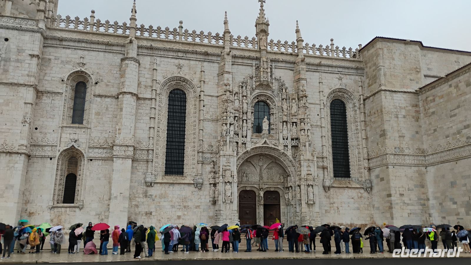 Unser erstes Ziel war das berühmte Stadtviertel Belém. Hier befinden sich gleich mehrere der bedeutendsten Bauwerke der Stadt, darunter das Hieronymuskloster (Mosteiro dos Jerónimos), das als Meisterwerk der Manuelinik gilt. Leider konnten wir das Kloster nicht wie geplant besichtigen – ein Streik der Museumsangestellten ließ uns im strömenden Regen und peitschendem Wind eine halbe Stunde vergeblich anstehen. Schließlich kehrten wir ein bisschen durchnässt zum Bus zurück. Wetterbedingt auch nur ein kurzer Fotostopp am Torre de Belém und dem Entdeckerdenkmal – beide Symbole des portugiesischen Zeitalters der Entdeckungen.