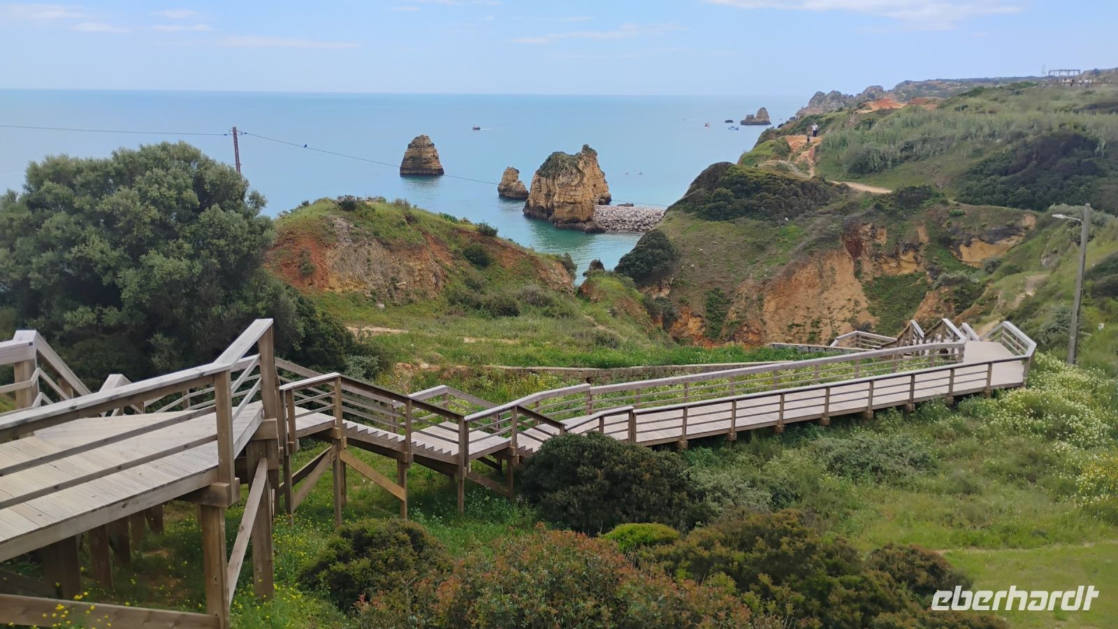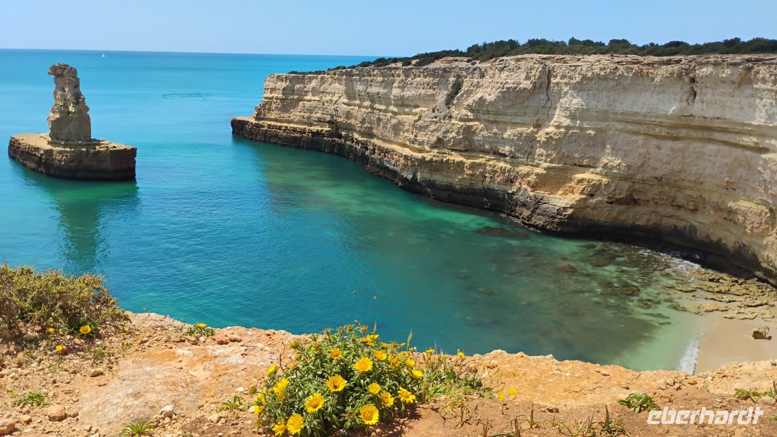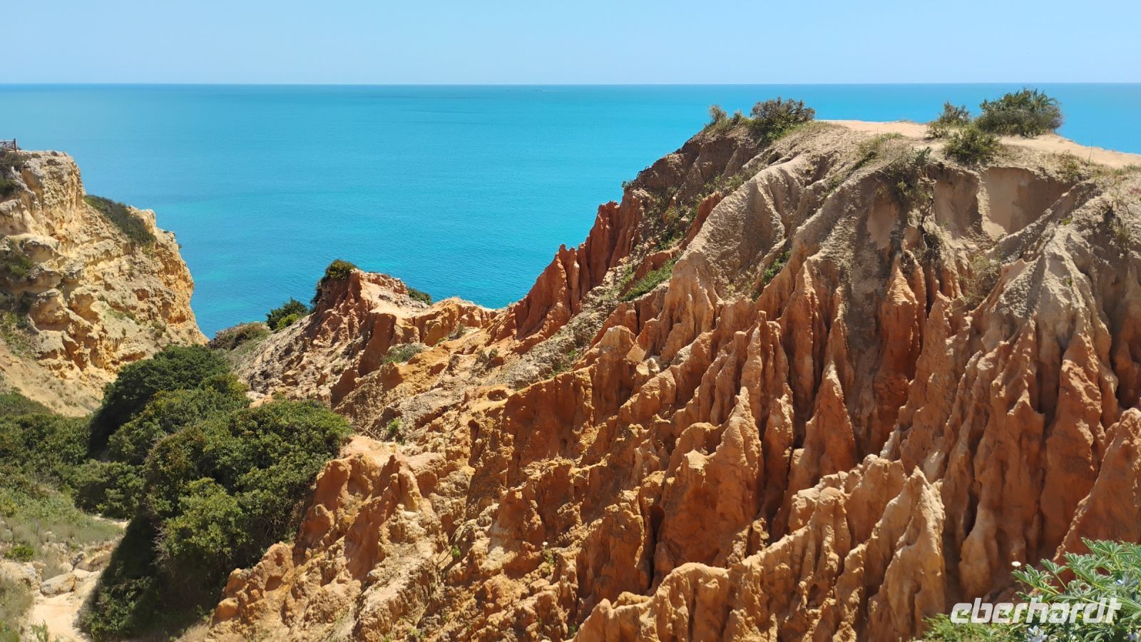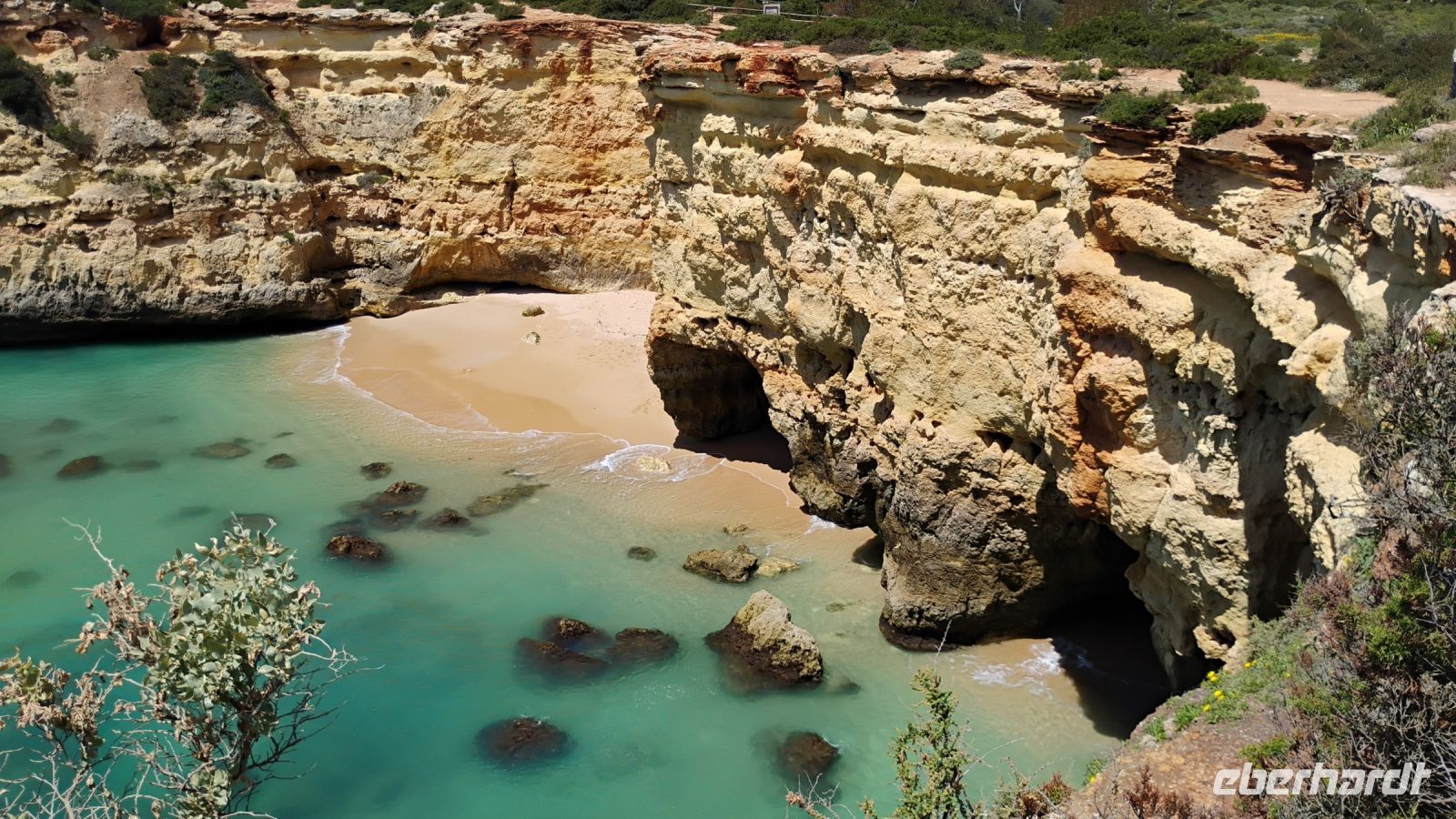 Ein paar wenige wagten sich westwärts auf den deutlich anspruchsvolleren Wanderweg zum Algar do Pontal. Der Algar do Pontal liegt inmitten einer der spektakulärsten Wanderregionen der Algarve. Entlang des Küstenpfads eröffnen sich immer wieder beeindruckende Ausblicke auf bizarre Felsformationen. Der Weg führt über schroffe Klippen, durch mediterrane Vegetation und belohnt mit grandiosen Blicken aufs Meer.