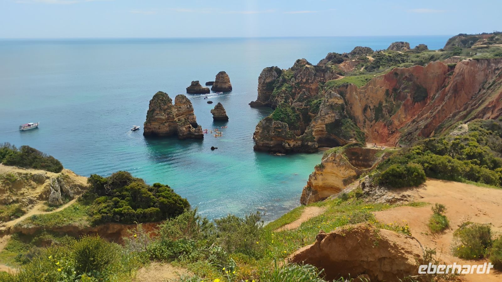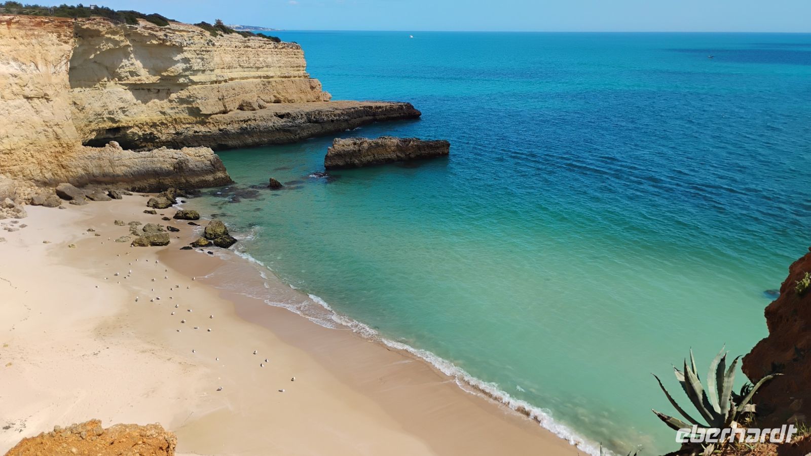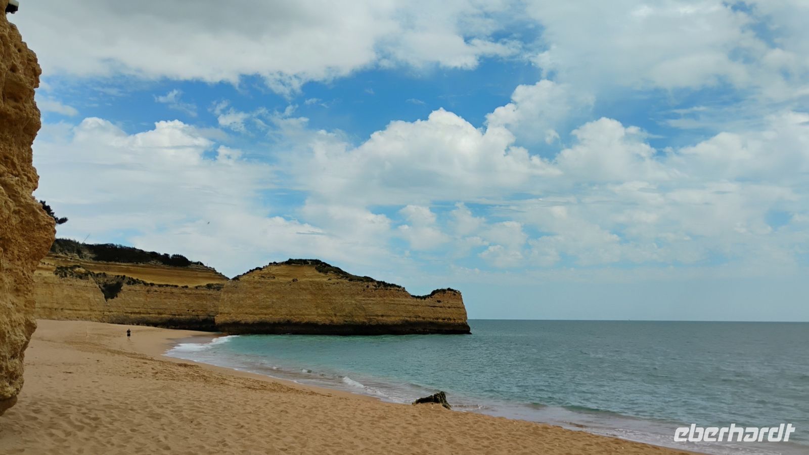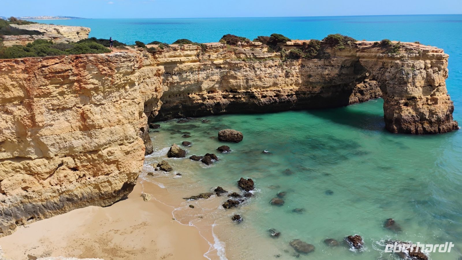 Ein paar wenige wagten sich westwärts auf den deutlich anspruchsvolleren Wanderweg zum Algar do Pontal. Der Algar do Pontal liegt inmitten einer der spektakulärsten Wanderregionen der Algarve. Entlang des Küstenpfads eröffnen sich immer wieder beeindruckende Ausblicke auf bizarre Felsformationen. Der Weg führt über schroffe Klippen, durch mediterrane Vegetation und belohnt mit grandiosen Blicken aufs Meer.