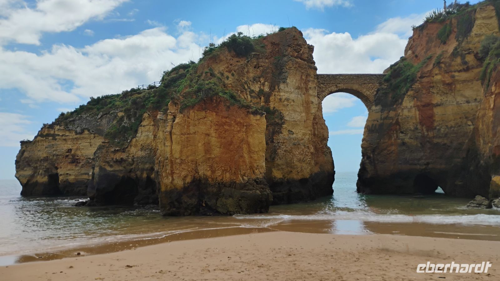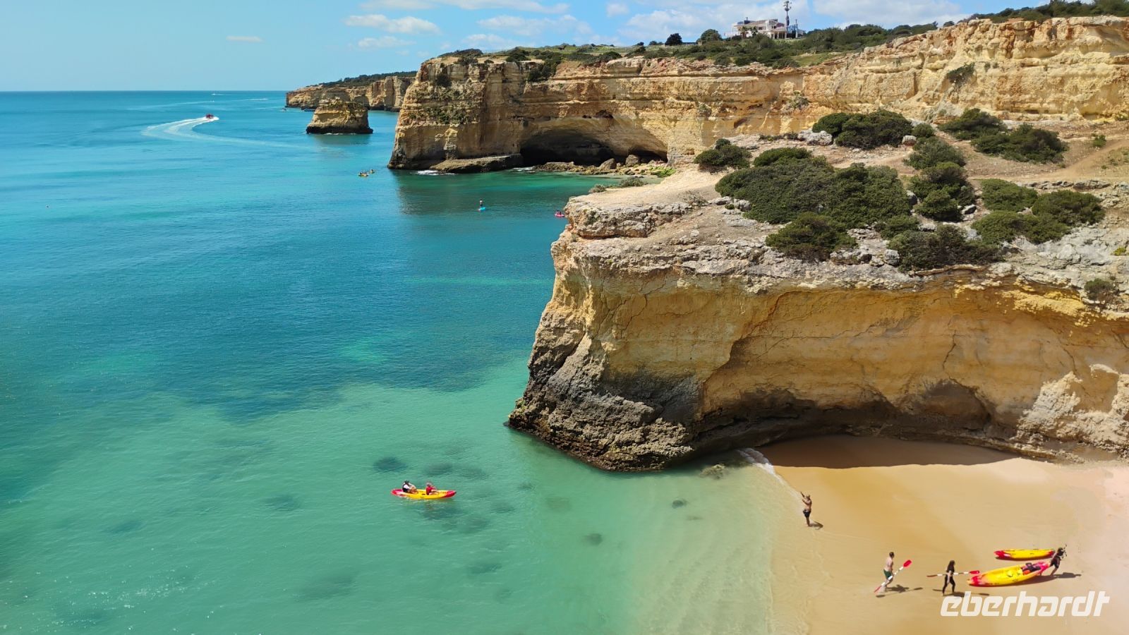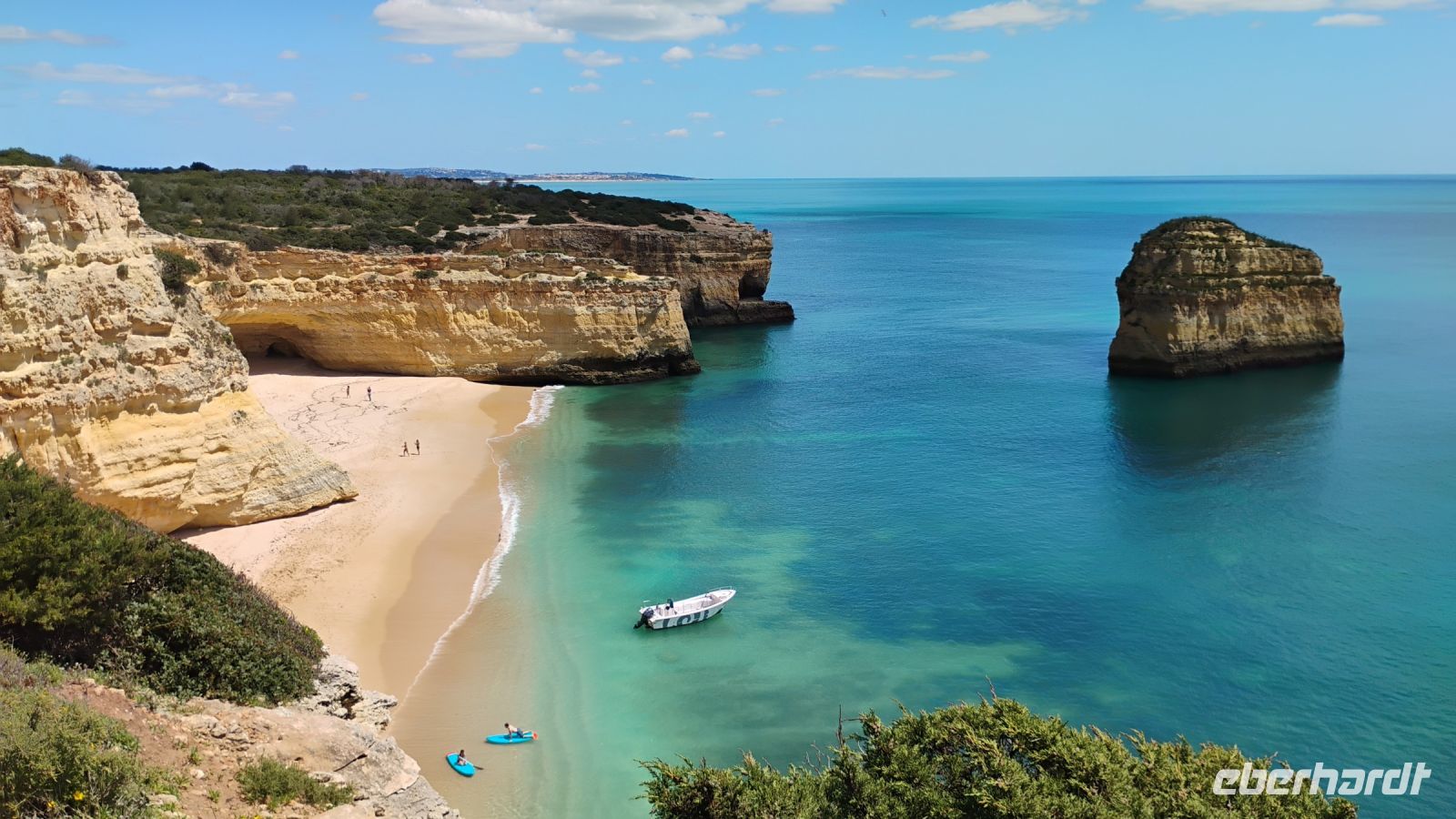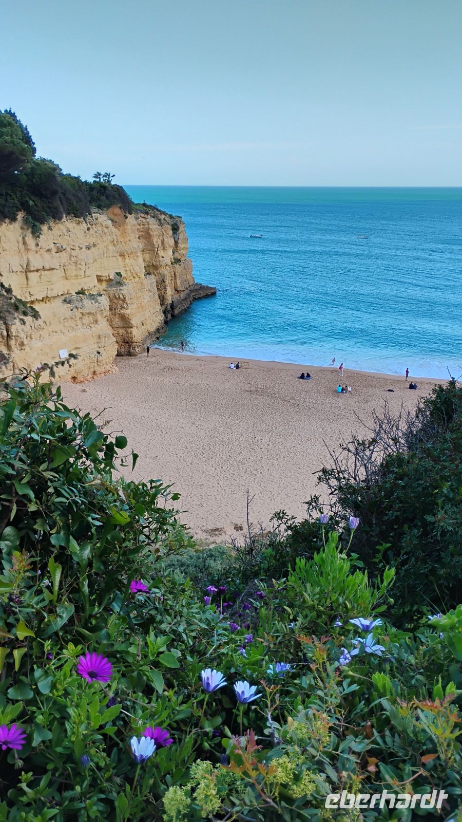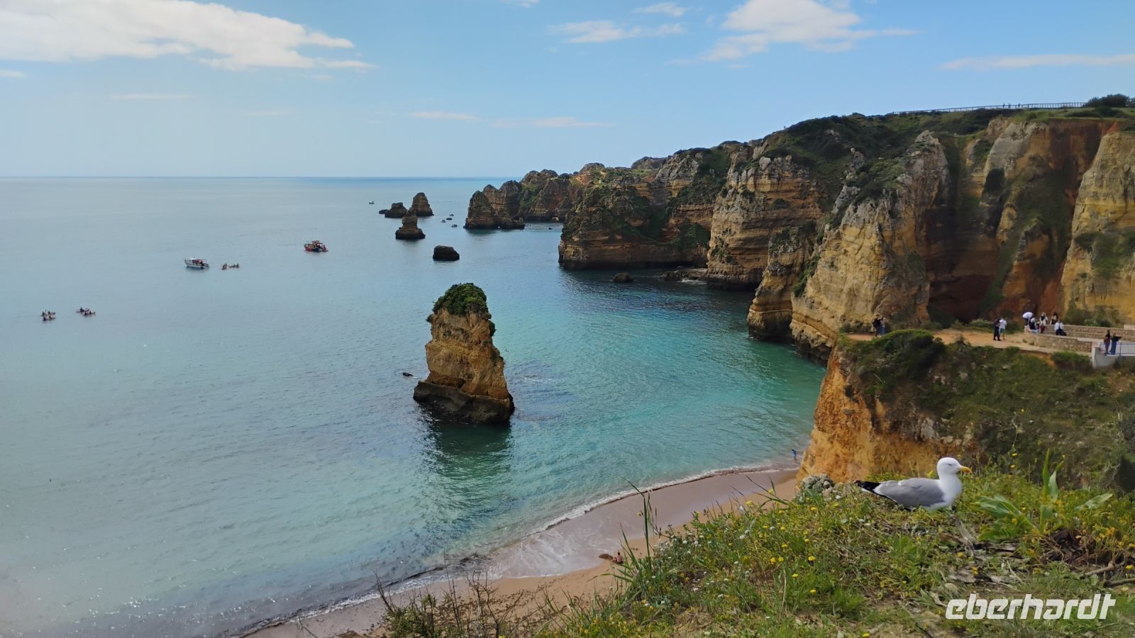Ein paar wenige wagten sich westwärts auf den deutlich anspruchsvolleren Wanderweg zum Algar do Pontal. Der Algar do Pontal liegt inmitten einer der spektakulärsten Wanderregionen der Algarve. Entlang des Küstenpfads eröffnen sich immer wieder beeindruckende Ausblicke auf bizarre Felsformationen. Der Weg führt über schroffe Klippen, durch mediterrane Vegetation und belohnt mit grandiosen Blicken aufs Meer.