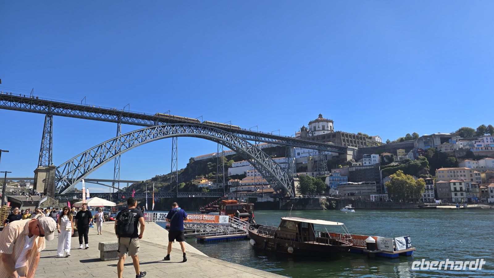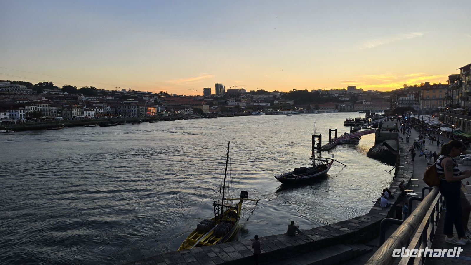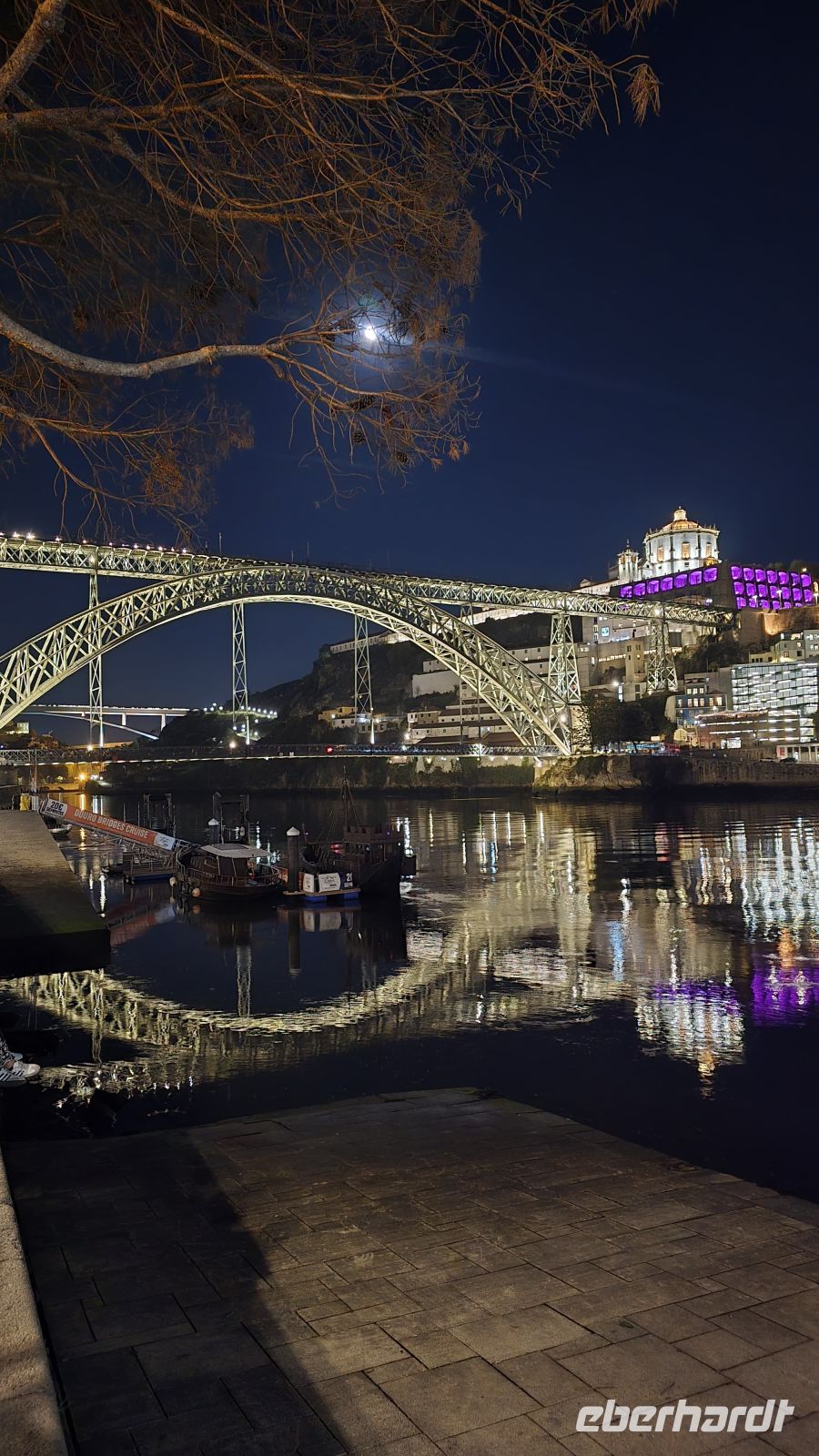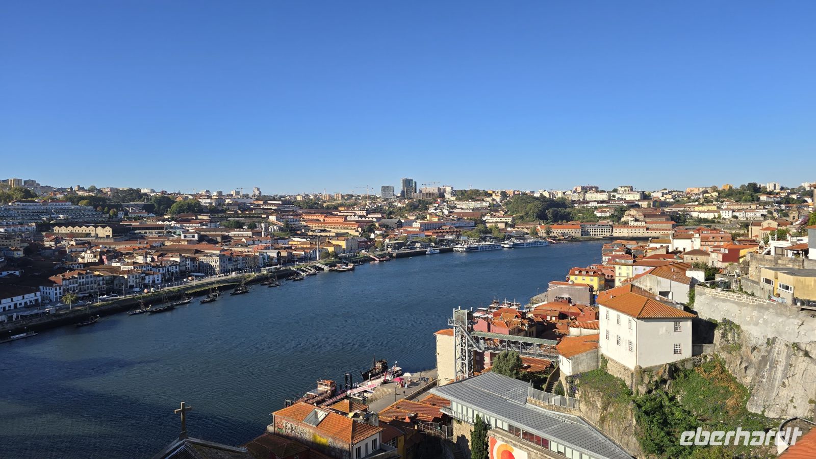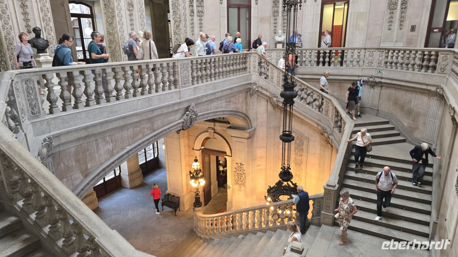 von der Handelskammer der Stadt Porto wurde es im 19. Jahrhundert als Handelsgericht und Börse errichtet. Heute wird das Gebäude oft für Konferenzen u.ä. genutzt, wir schauen uns um- die mächtige Kuppelhalle bezaubert, ihr Glasdach läßt den Innenhof lichtdurchflutet anmuten. Luis erzählt uns Geschichten zu den einzelnen Räumen, die Gerichtsräume, den Arbeitsraum von Gustave Eiffel, der hier die Eisenbahnbrücke konzipierte und bauen ließ, Repräsentationsräume und schließlich den Salao arabe, den arabischen Saal. Was für eine Kunstfertigkeit. Das hatte niemand hier so erwartet. Über die große Treppe gelangen wir nach unten und können noch erleben, wie die riesigen Kronleuchter des Eingangsportals nach unten gelassen werden. Das sieht man auch nicht jeden Tag. Unten passieren wir noch die Bibliothek und den Shop, dann spazieren wir weiter zum Fluss, zum Douro. Hier ist Zeit und viel Gelegenheit für eine Mittagspause. Unweit von hier ist die Anlegestelle für unser Boot, mit dem wir heute noch eine