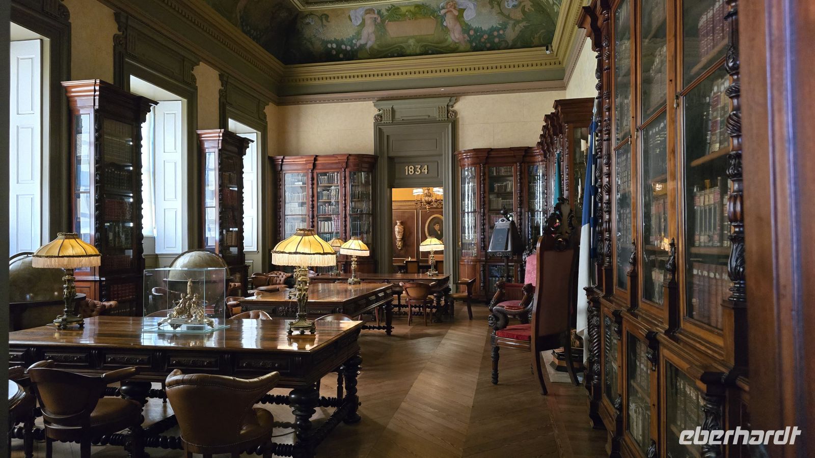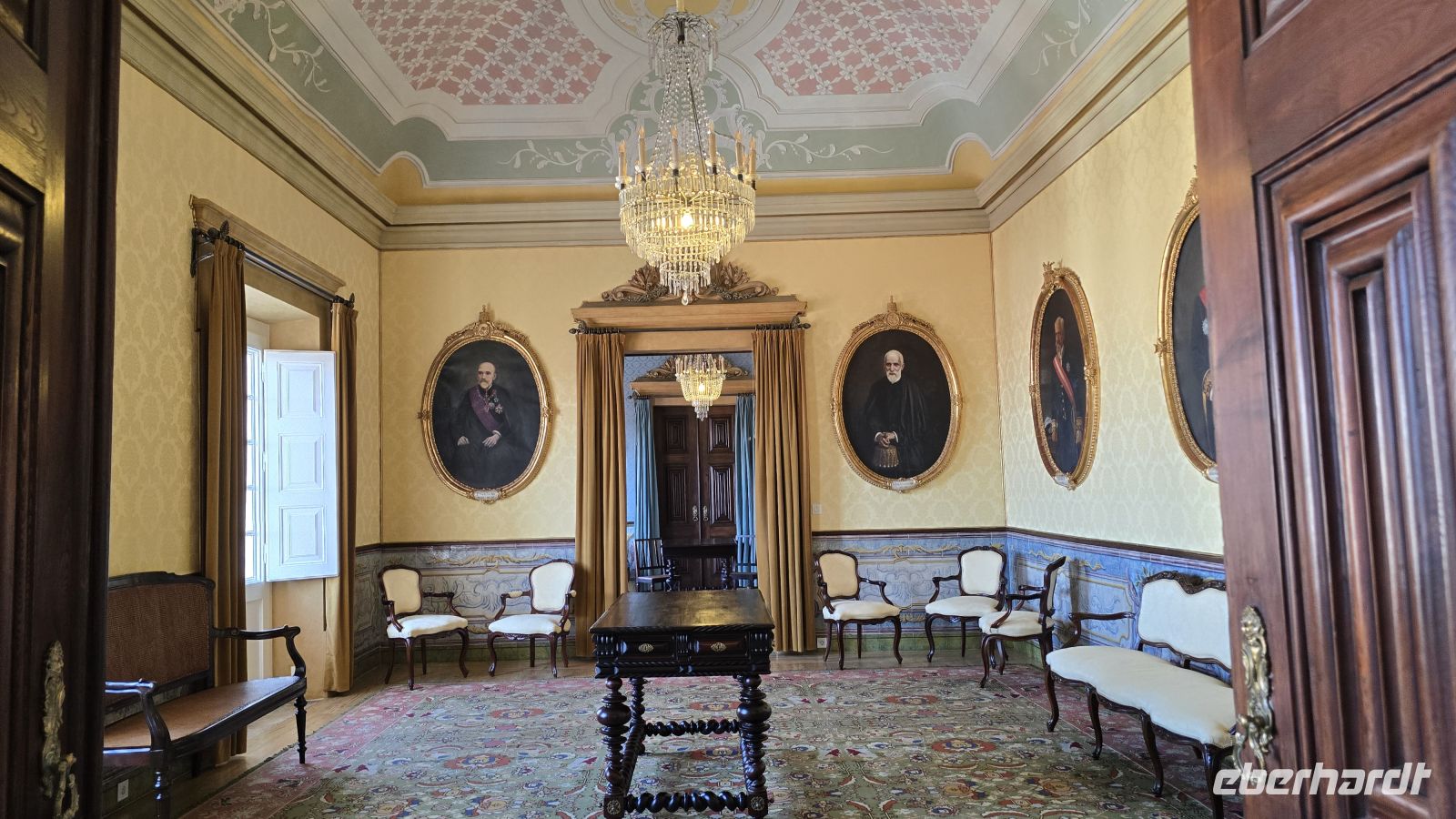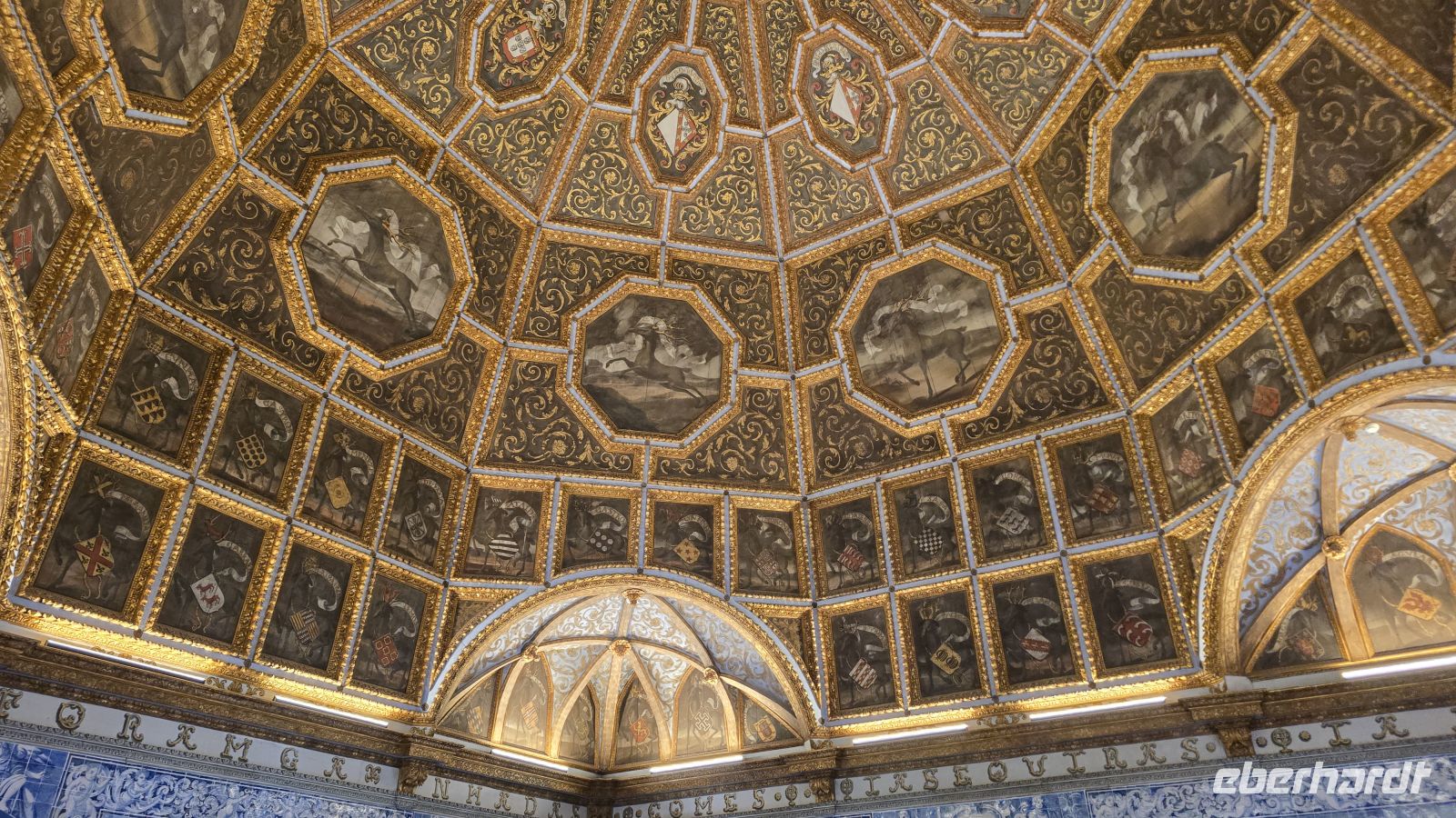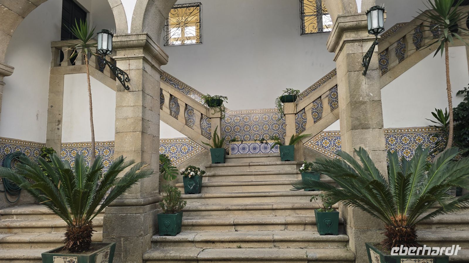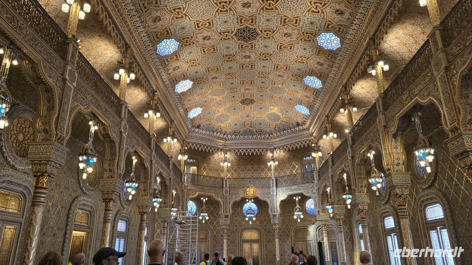 von der Handelskammer der Stadt Porto wurde es im 19. Jahrhundert als Handelsgericht und Börse errichtet. Heute wird das Gebäude oft für Konferenzen u.ä. genutzt, wir schauen uns um- die mächtige Kuppelhalle bezaubert, ihr Glasdach läßt den Innenhof lichtdurchflutet anmuten. Luis erzählt uns Geschichten zu den einzelnen Räumen, die Gerichtsräume, den Arbeitsraum von Gustave Eiffel, der hier die Eisenbahnbrücke konzipierte und bauen ließ, Repräsentationsräume und schließlich den Salao arabe, den arabischen Saal. Was für eine Kunstfertigkeit. Das hatte niemand hier so erwartet. Über die große Treppe gelangen wir nach unten und können noch erleben, wie die riesigen Kronleuchter des Eingangsportals nach unten gelassen werden. Das sieht man auch nicht jeden Tag. Unten passieren wir noch die Bibliothek und den Shop, dann spazieren wir weiter zum Fluss, zum Douro. Hier ist Zeit und viel Gelegenheit für eine Mittagspause. Unweit von hier ist die Anlegestelle für unser Boot, mit dem wir heute noch eine