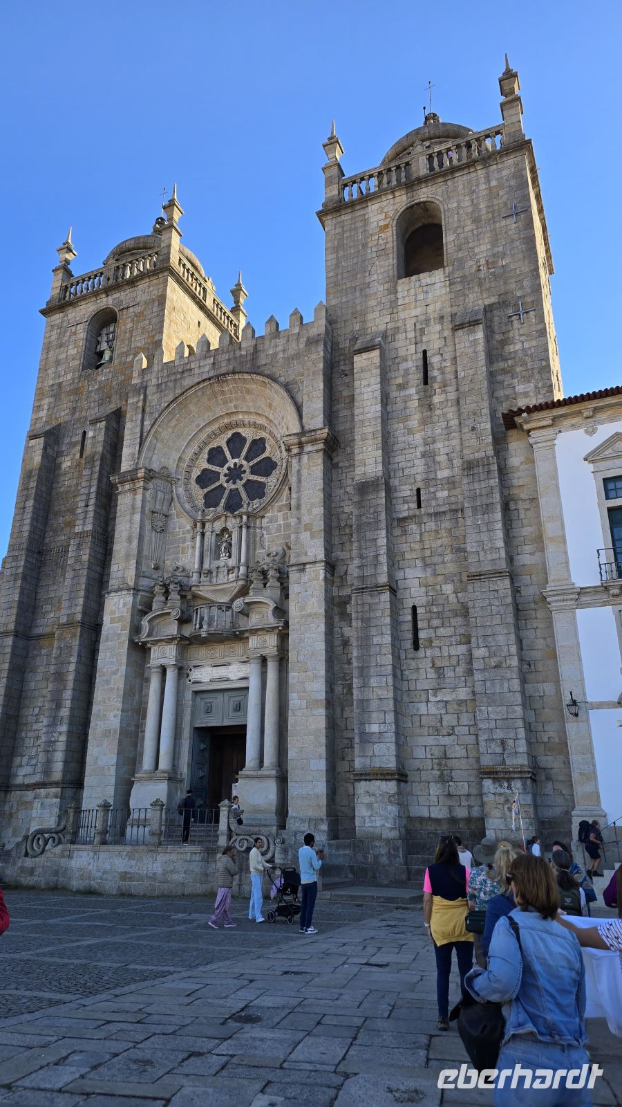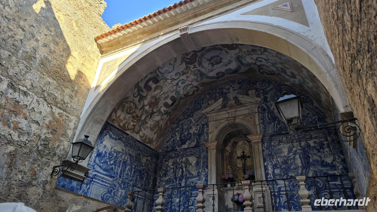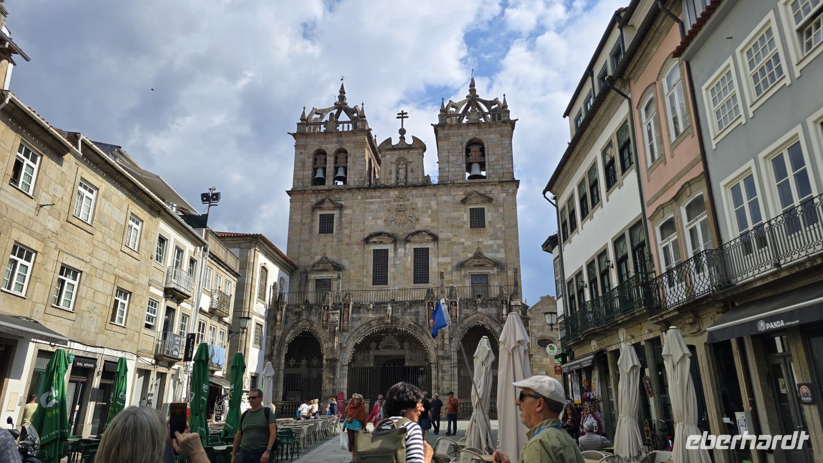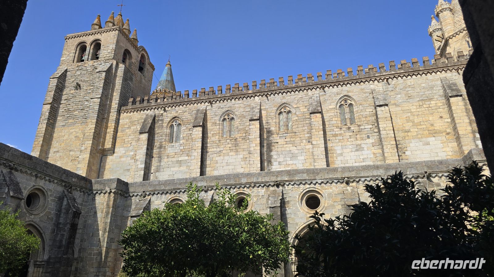 ist unser erstes Ziel. Wir spazieren in die Altstadt, durch ein Stadttor, vorbei an der Marienkapelle zur Kathedrale. Stolz erhebt sich dieses mittelalterliche Bauwerk, unschwer zu erkennen die vielen An- und Umbauten. Trotzdem hat sie ihren romanischen Charakter bewahrt. Gleich gegenüber der Kathedrale steht die Kirche der Barmherzigkeit (Igreja da Misericordia), hier in Portugal eine gemeinnützige Einrichtung, die sich um Kranke, Alte und sozial Benachteiligte kümmert. Ihr Zeichen ist ein blaues Kreuz auf weißem Grund. Dann spazieren wir durch die Gassen zurück, Luis erzählt von den Vierteln, den Geschichten, die viele Häuser erzählen können-dann geht es weiter nach