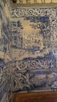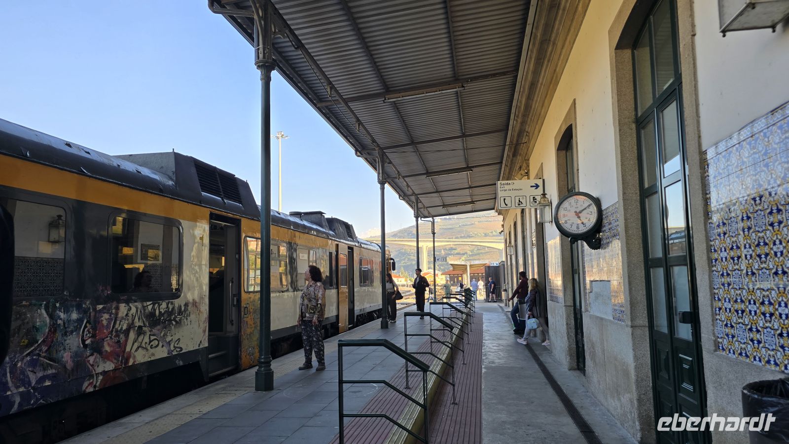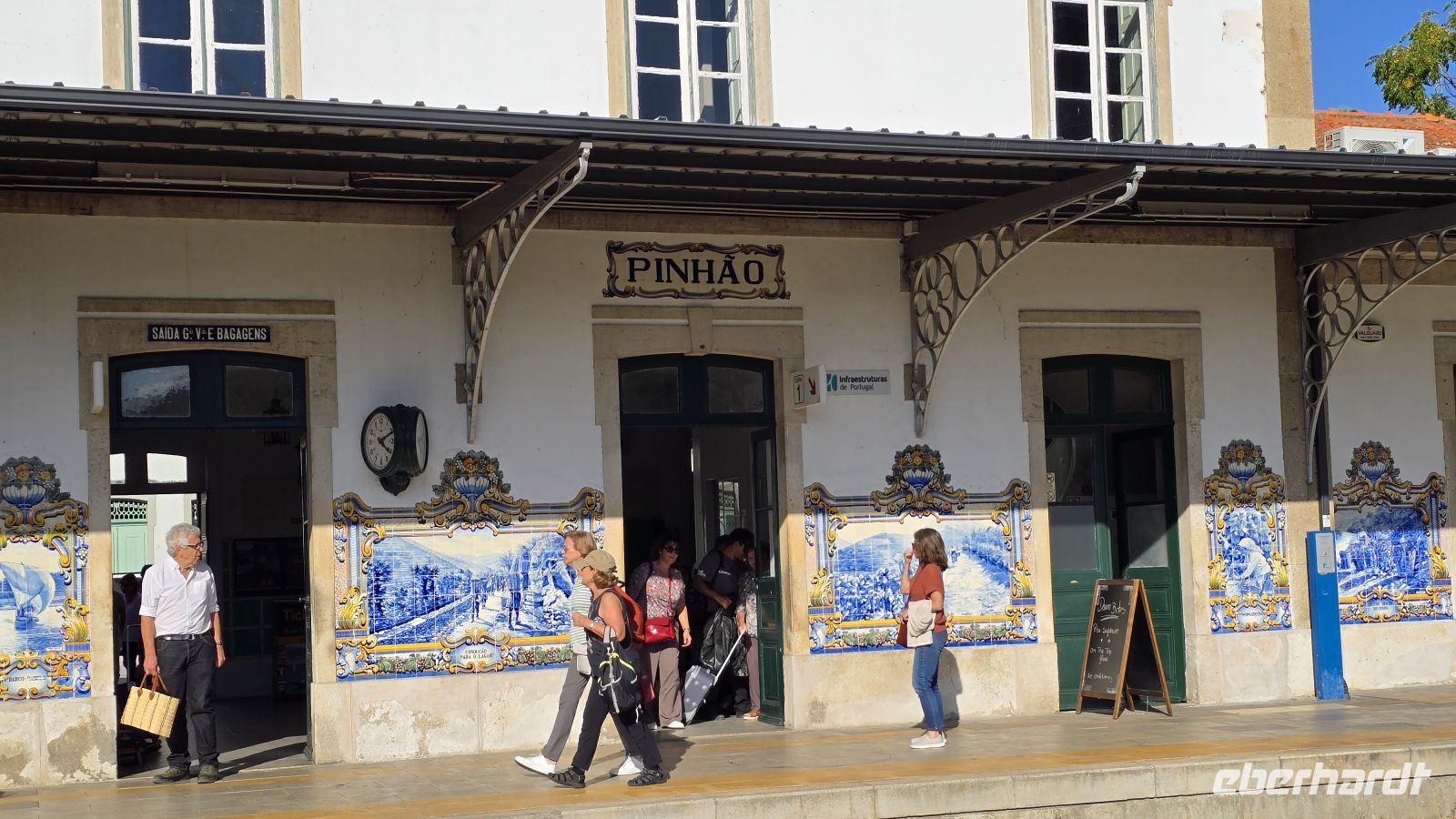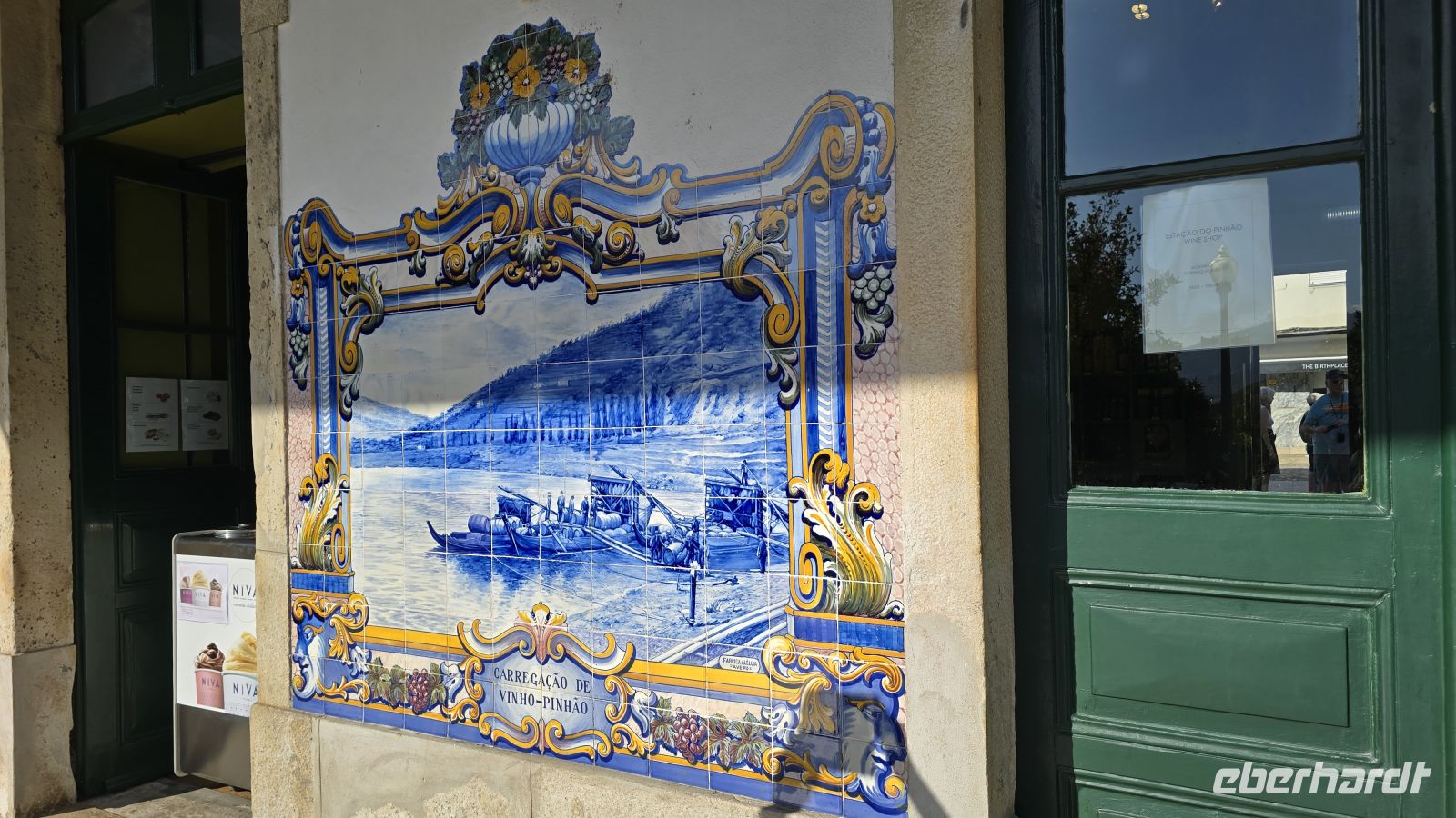 Hier verbringen wir unsere Mittagspause und fahren dann mit der Bahn nach Regua. Wir laufen hinunter zum Fluss, was für ein schöner Ort, direkt am Fluss, die Berge erheben sich dahinter, Flusskreuzfahrtschiffe schieben sich behäbig den Fluss entlang. Allerdings erleben einige beim Mittagsimbiss übelste Touristen-Abzocke, viel mehr hat der Ort zu dieser Jahreszeit leider auch nicht als Mittagsimbiss zu bieten...Der Bahnhof aber ist überaus schön und reich mit Azulejos geschmückt, das sind die Kachelfliessen. Hier stellen sie das Leben auf dem Land dar, schön kann man die Trachten und die Arbeiten hier nachvollziehen. Mit ein wenig Verspätung kommt dann auch endlich unsere Bahn und gemütlich fahren wir am Douro entlang. In