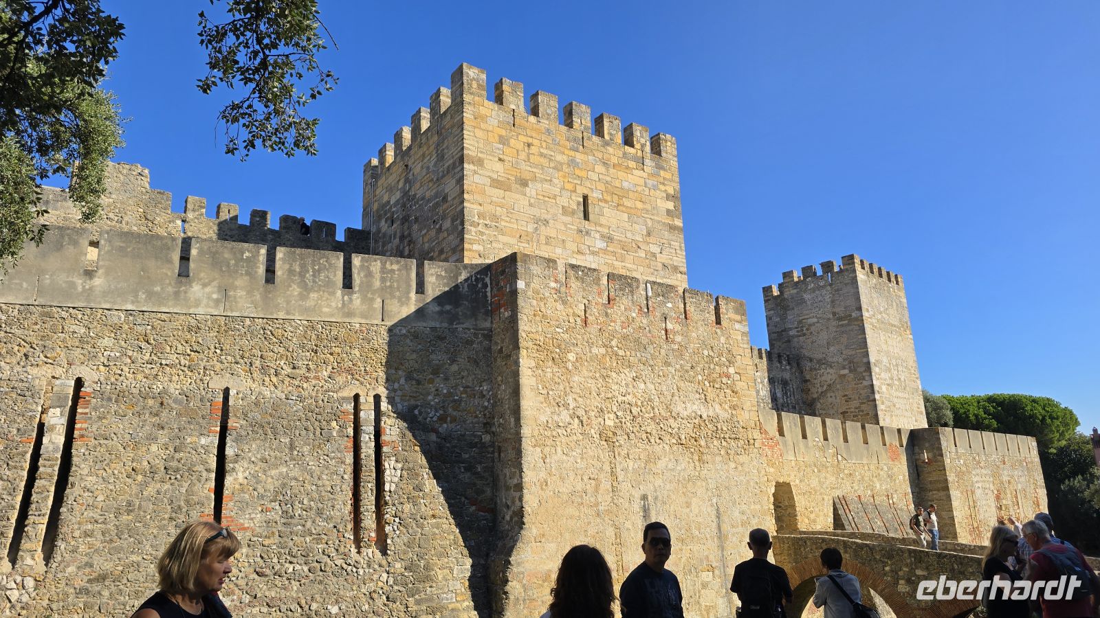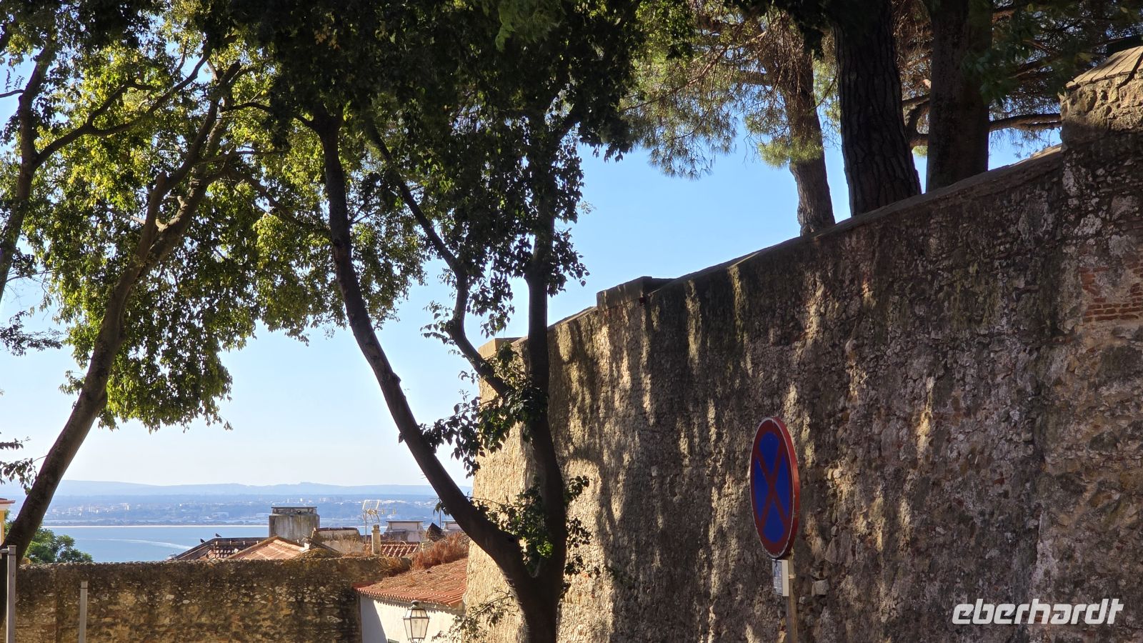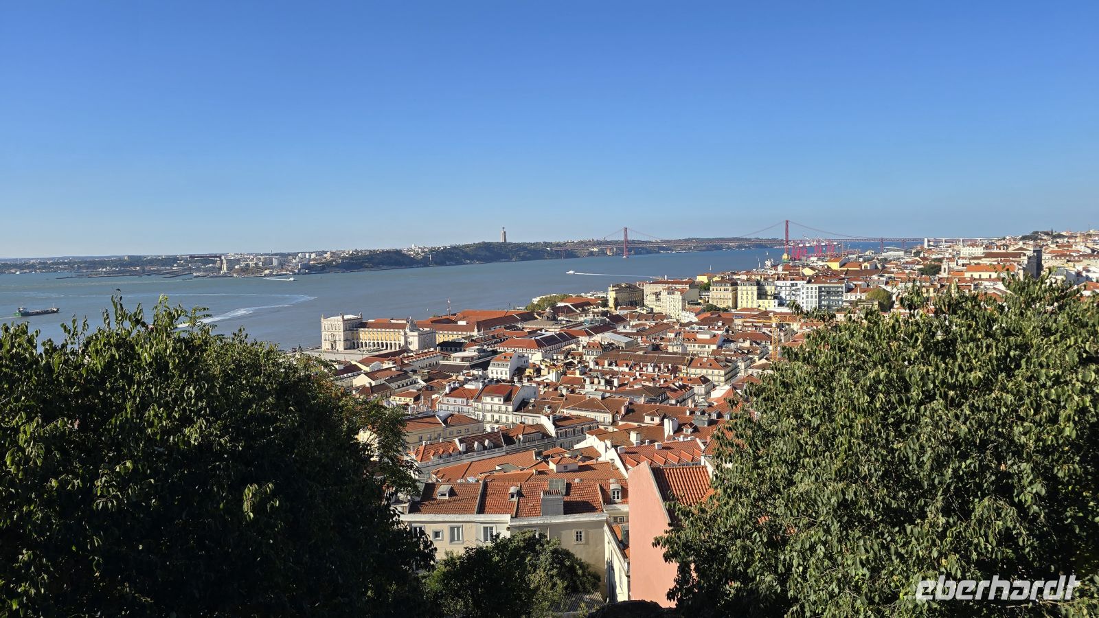 Am Platz der Erneuerung steigen wir aus dem Bus aus und spazieren weiter, über den Rossio Platz hinauf zur alten Festung. Die alten Straßenbahnen rumpeln an uns vorbei und die TukTuks sind flink und dank Elektroantrieb leise. Dann heißt es weiterspazieren zum Castelo de S. Jorge. Luis besorgt unsere Eintrittskarten und dann können wir einen traumhaften Ausblick auf die Stadt genießen. Strategisch günstig war diese maurische Burg angelegt und sie hat dank ihrer Lage auf dem Hügel auch das Erdbeben und den Tsunami überstanden. Mit der Eroberung Lissabons durch den ersten portugiesischen König 1147 begann ihre Blütezeit als Königspalast. Dann ist wieder Zeit für individuelle Entdeckungen, wir spazieren ein wenig durch den Park und sind von den Pfauen begeistert. Dass diese auch auf Bäumen sitzen war uns allerdings bis dato neu. Durch die Alfama geht es wieder hinab, am Jardim Júlio de Castilho genießen wir einen umwerfenden Blick auf den Tejo und die Stadt , wandeln weiter auf den Spuren der Traditionen und der Menschen, die hier lebten und leben, da sind die "Waschweiber" in den "Waschsalons", die "Fischweiber", die die frischen Fische in Körben auf dem Kopf bis hier hinauf trugen und zum Verkauf anboten... Mit dem Bus geht es nun weiter zum Stadtteil Belem. In diesem Stadtteil befindet sich das weltberühmte