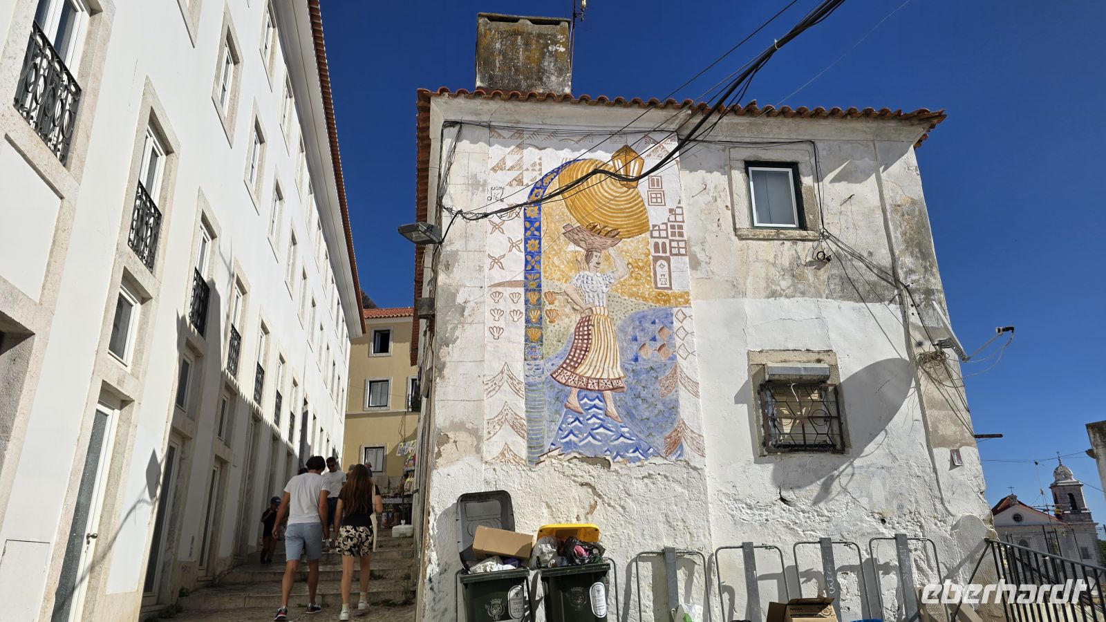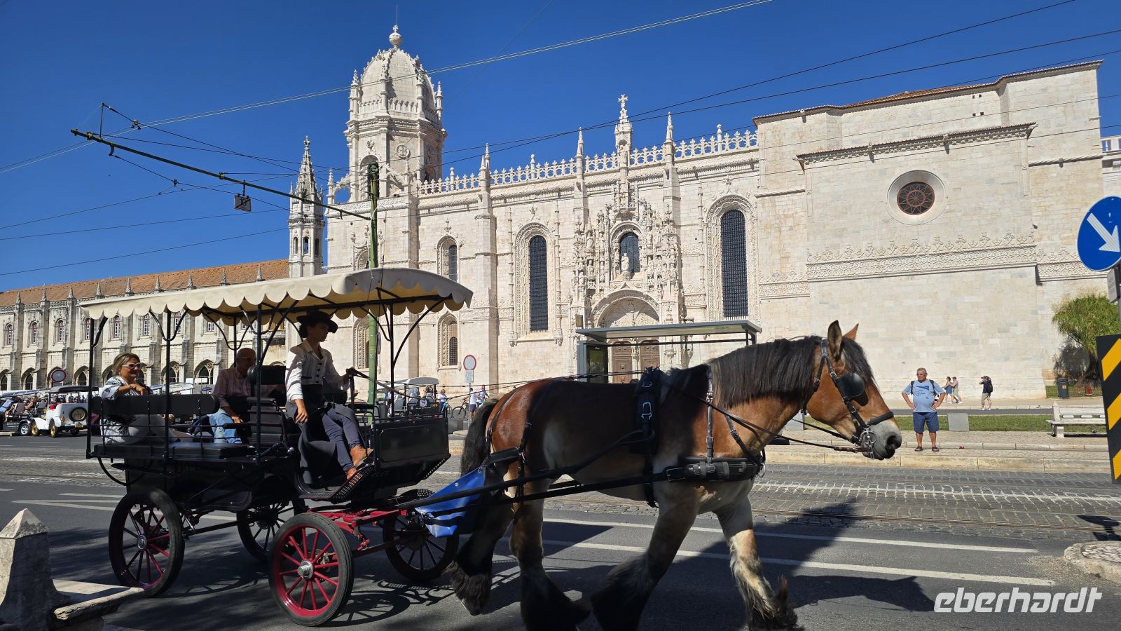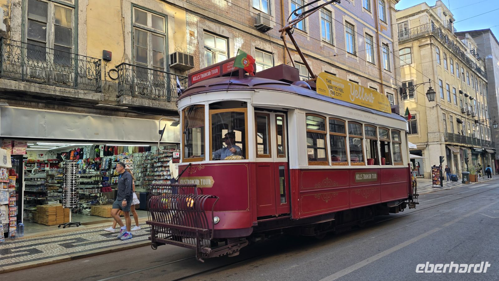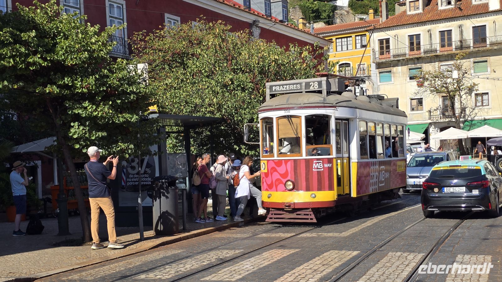 Am Platz der Erneuerung steigen wir aus dem Bus aus und spazieren weiter, über den Rossio Platz hinauf zur alten Festung. Die alten Straßenbahnen rumpeln an uns vorbei und die TukTuks sind flink und dank Elektroantrieb leise. Dann heißt es weiterspazieren zum Castelo de S. Jorge. Luis besorgt unsere Eintrittskarten und dann können wir einen traumhaften Ausblick auf die Stadt genießen. Strategisch günstig war diese maurische Burg angelegt und sie hat dank ihrer Lage auf dem Hügel auch das Erdbeben und den Tsunami überstanden. Mit der Eroberung Lissabons durch den ersten portugiesischen König 1147 begann ihre Blütezeit als Königspalast. Dann ist wieder Zeit für individuelle Entdeckungen, wir spazieren ein wenig durch den Park und sind von den Pfauen begeistert. Dass diese auch auf Bäumen sitzen war uns allerdings bis dato neu. Durch die Alfama geht es wieder hinab, am Jardim Júlio de Castilho genießen wir einen umwerfenden Blick auf den Tejo und die Stadt , wandeln weiter auf den Spuren der Traditionen und der Menschen, die hier lebten und leben, da sind die "Waschweiber" in den "Waschsalons", die "Fischweiber", die die frischen Fische in Körben auf dem Kopf bis hier hinauf trugen und zum Verkauf anboten... Mit dem Bus geht es nun weiter zum Stadtteil Belem. In diesem Stadtteil befindet sich das weltberühmte