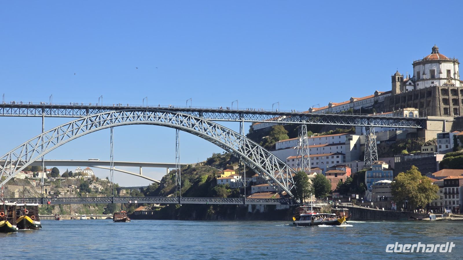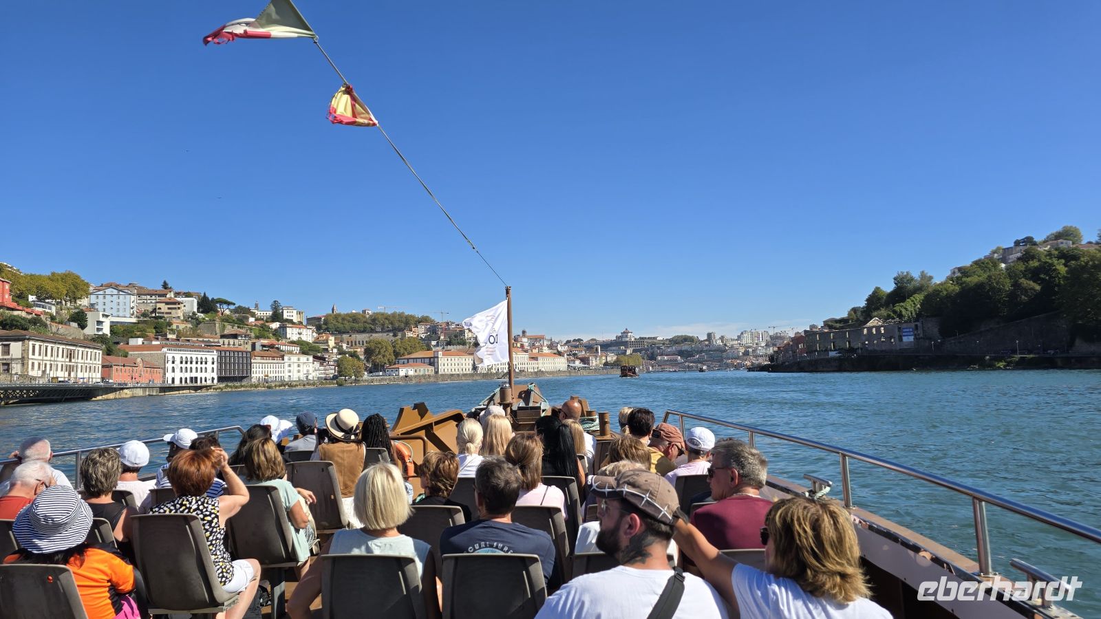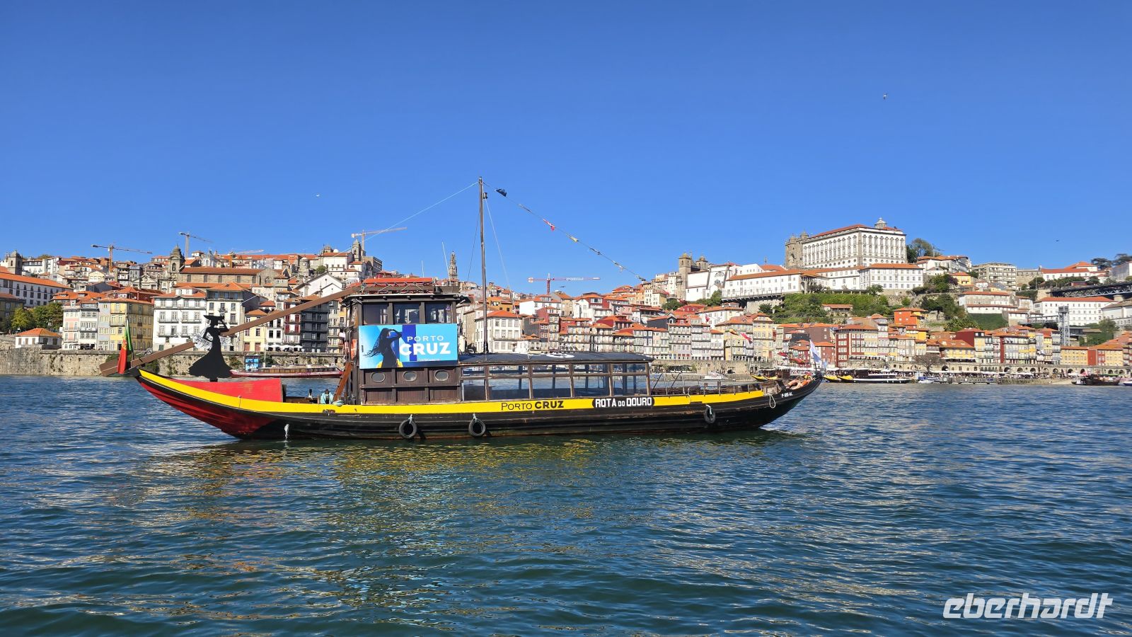 unternehmen wollen, also treffen wir uns gleich wieder hier. Da kommt auch schon unser Boot: Alle suchen Platz unter dem Sonnendach, es sind um die 28 °C, die Sonne ist erbarmungslos, läßt aber alles ringsumher strahlen und leuchten. Dann genießen wir die Fahrt, erst flussabwärts unter den berühmten Brücken von Eiffel und seinen Schülern hindurch, später flussaufwärts Richtung Mündung des Douro in den Atlantik. Am Ufer liegen die alten Robeiro-Boote, mit denen früher der Portwein aus den ca. 100 Kilometer entfernten Anbaugebieten am Douro her transportiert wurden. Am anderen Ufer des Douro ist Gaia, hier befinden sich die Weinkellereien, die diesen typischen Wein für Porto- den Portwein- herstellen. Unübersehbar die Werbefiguren, am bekanntesten wohl die von Sandemann. Hier, auf der Gaia-Seite steigen wir auch aus, Basilio wartet bereits mit seinem Bus auf uns. Er bringt uns zu einer