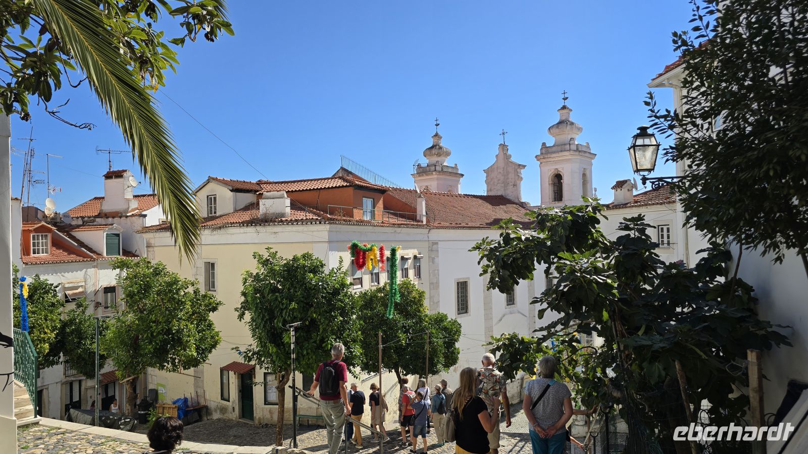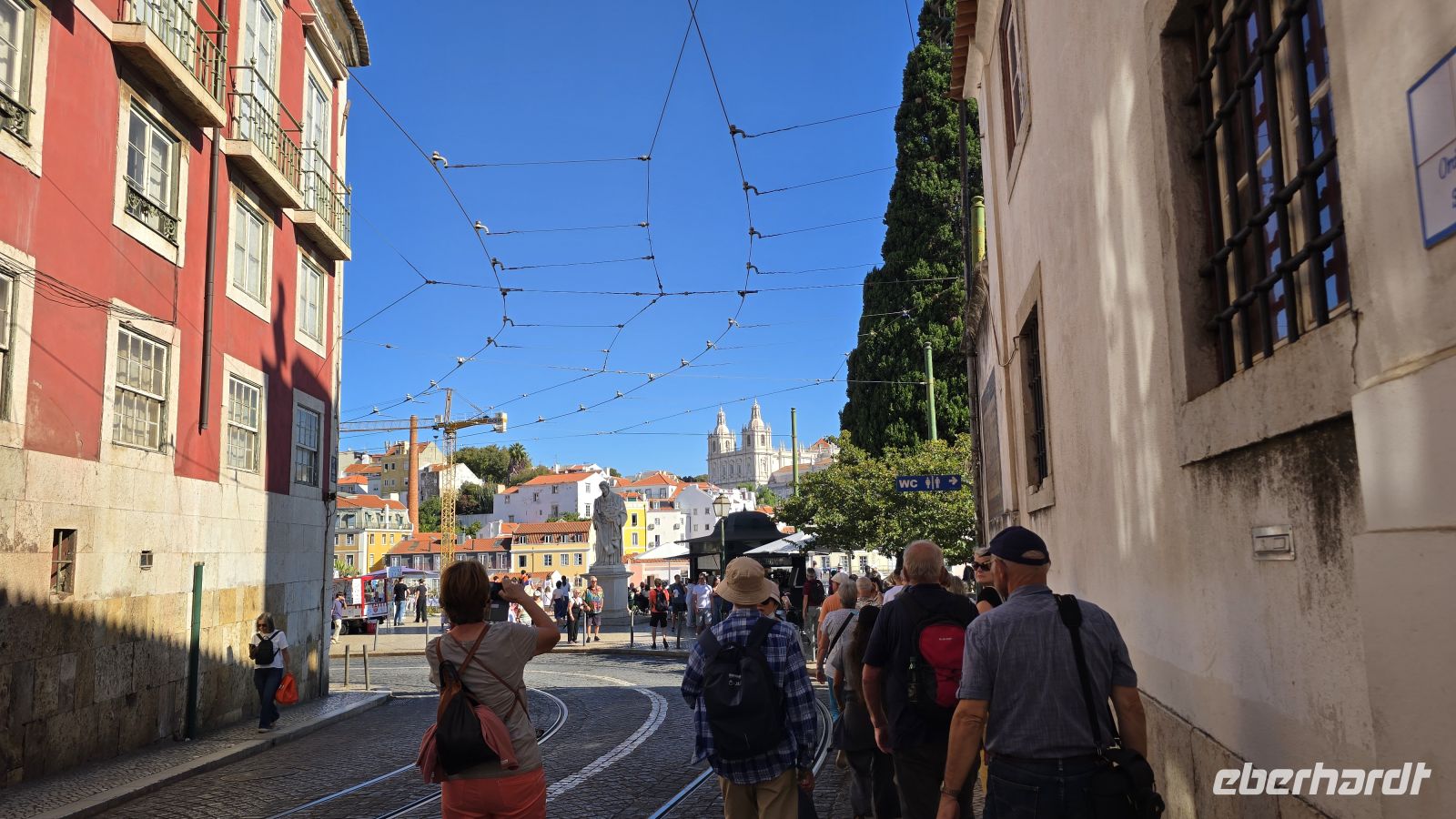 Der Tag heute gehört Lissabon. Wir starten mit Carla und einem anderen Bus mit dem Park Eduard VII. und der Avenida da Liberdade. Luis erzählt uns, dass es 1755 ein schweres Erdbeben mit einem Tsunami gab, die 3/4 der Stadt zerstörten. Einem genialen und weitsichtigen Baumeister ist es zu verdanken, dass die Stadt mit so viel Übersicht und breiten Straßen zwischen den beiden Hügeln am Tejo wiedererstehen konnte. Sein Name war Marqes de Pompal. Wir fahren dann in die Alfama- die Altstadt. Unser Bus darf nicht hinauffahren, deshalb gehen wir die 160 (Höhen)Meter zur Festung zu Fuss - schnauf!