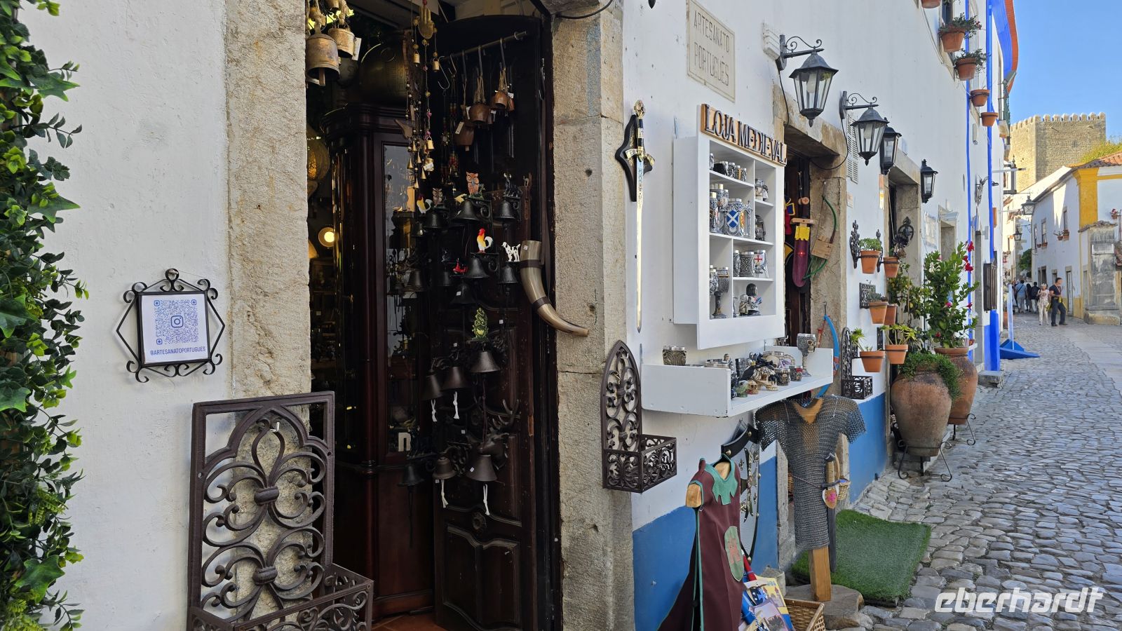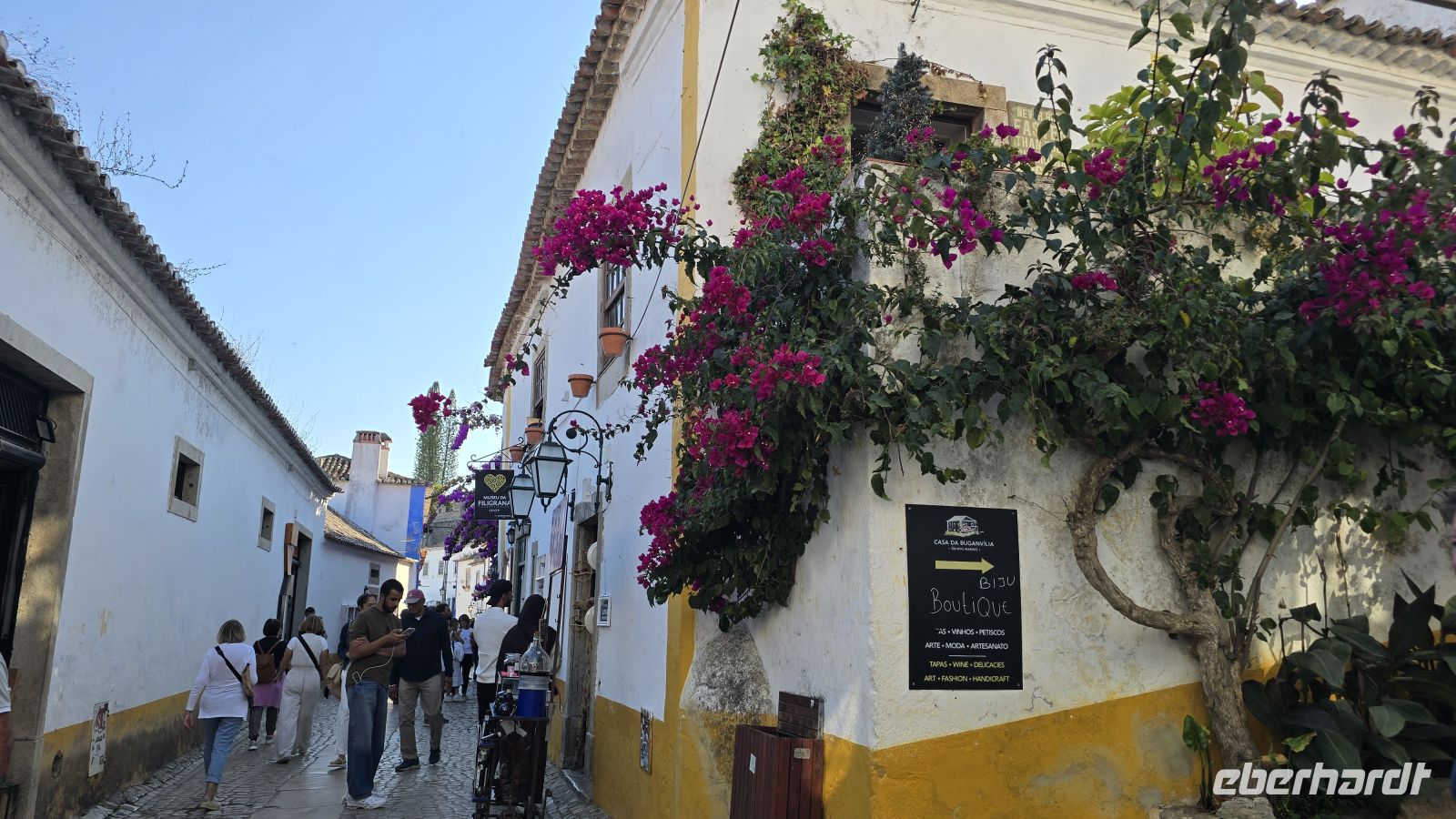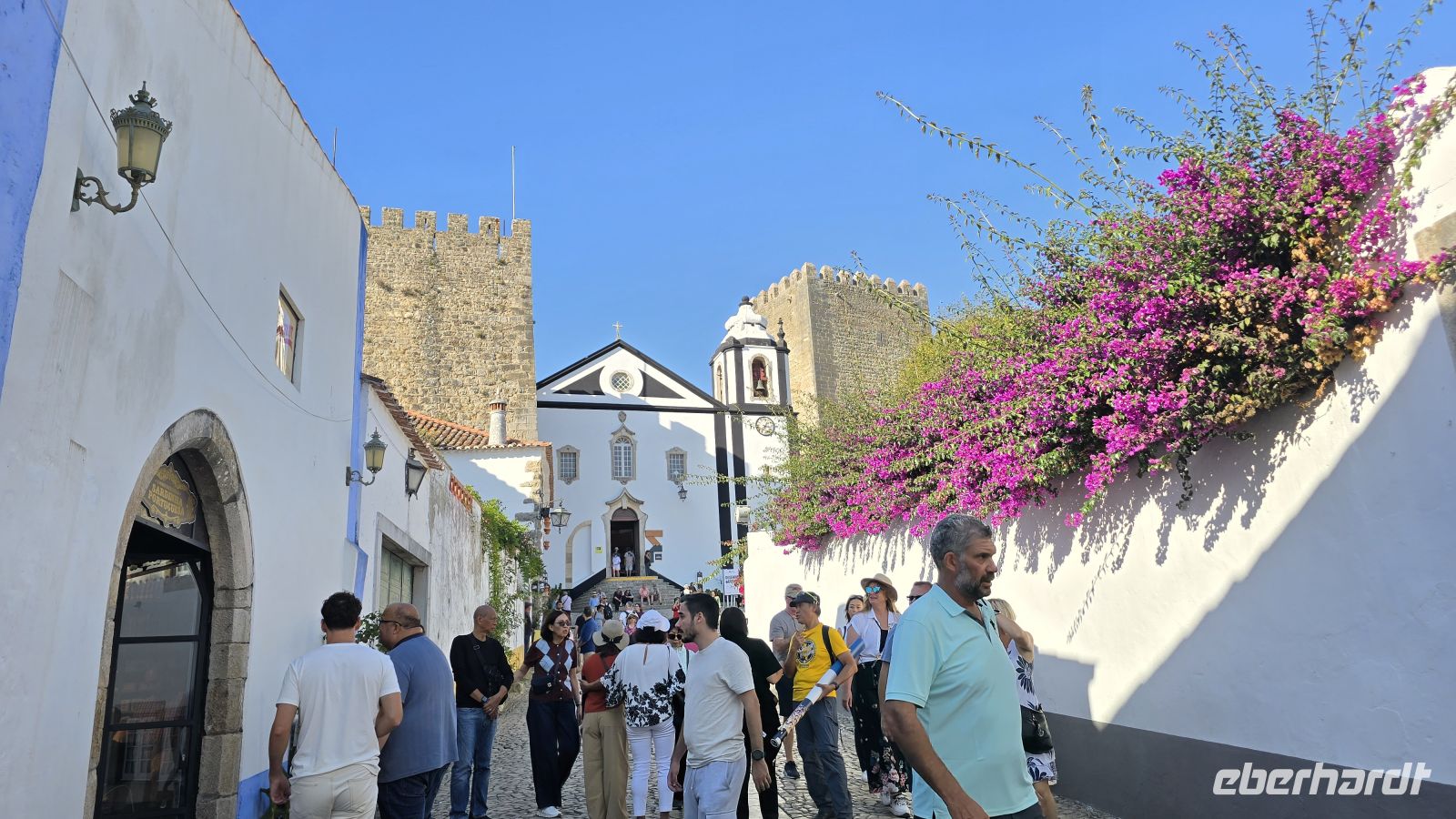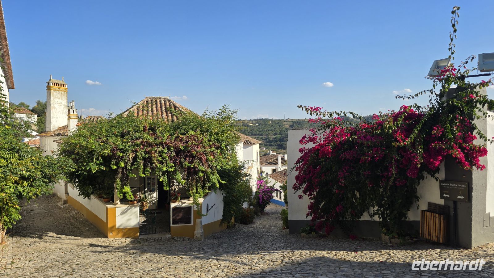 Diese Stadt war ein Geschenk. Ein Geschenk des Königs Dinis an sein Geliebte. 17 Kirchen soll die Stadt haben, vor allem aber eine romantische romanische Burg und wunderschöne Gässchen mit Läden, Cafes und Restaurants und natürlich mit dem berühmten Kirschlikör. Den konnte man überall probieren, am besten in einem Schokobecher. Und das taten wir auch, Luis servierte den Ginja auf einem großen Tablett, im Schokobecher, mit Kirsche, wie es sich gehört. Hmmm! Dann konnten wir nach Herzenslust bummeln, auf der Stadtmauer entlangspazieren oder der einen oder anderen Kirche einen Besuch abstatten. Bemerkenswert, die zum Buchladen umgebaute Kirche bei der Burg. Die Zeit verging wie im Flug und schon hieß es: weiterfahren. Unsere letzte Station für heute heißt