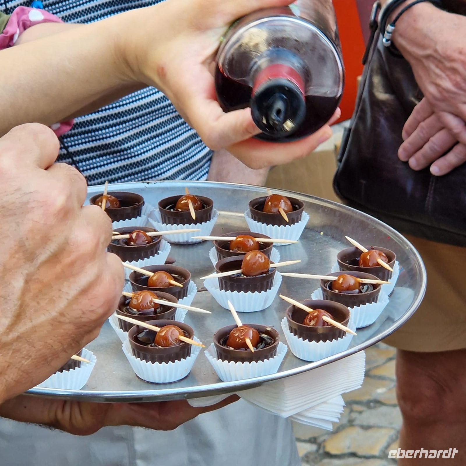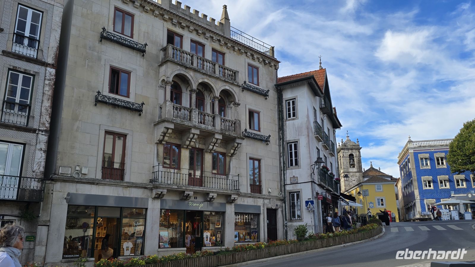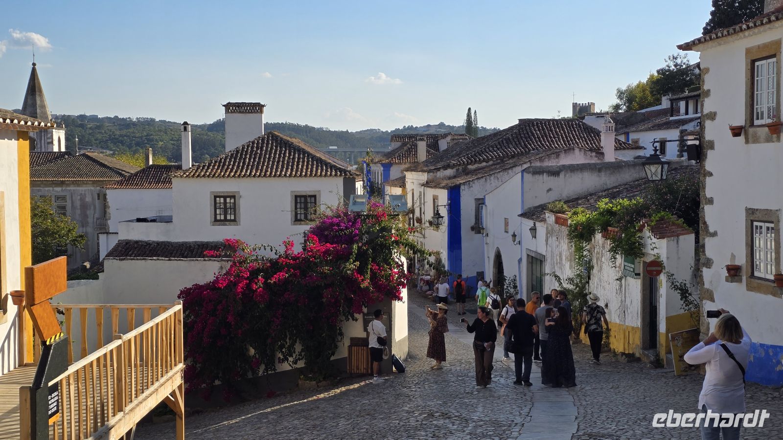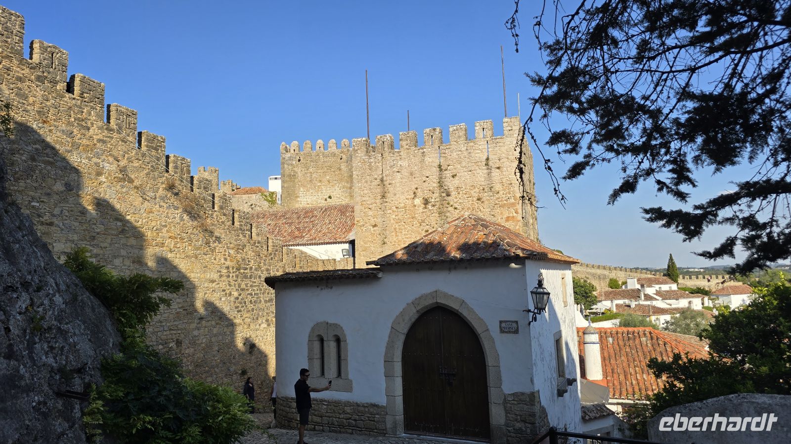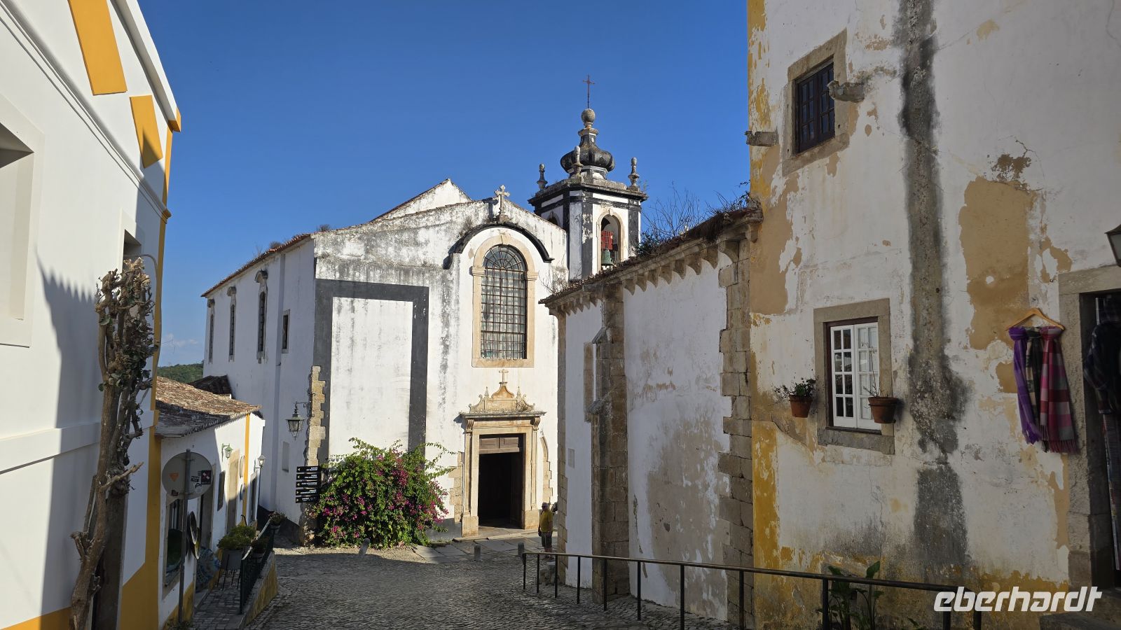 Diese Stadt war ein Geschenk. Ein Geschenk des Königs Dinis an sein Geliebte. 17 Kirchen soll die Stadt haben, vor allem aber eine romantische romanische Burg und wunderschöne Gässchen mit Läden, Cafes und Restaurants und natürlich mit dem berühmten Kirschlikör. Den konnte man überall probieren, am besten in einem Schokobecher. Und das taten wir auch, Luis servierte den Ginja auf einem großen Tablett, im Schokobecher, mit Kirsche, wie es sich gehört. Hmmm! Dann konnten wir nach Herzenslust bummeln, auf der Stadtmauer entlangspazieren oder der einen oder anderen Kirche einen Besuch abstatten. Bemerkenswert, die zum Buchladen umgebaute Kirche bei der Burg. Die Zeit verging wie im Flug und schon hieß es: weiterfahren. Unsere letzte Station für heute heißt