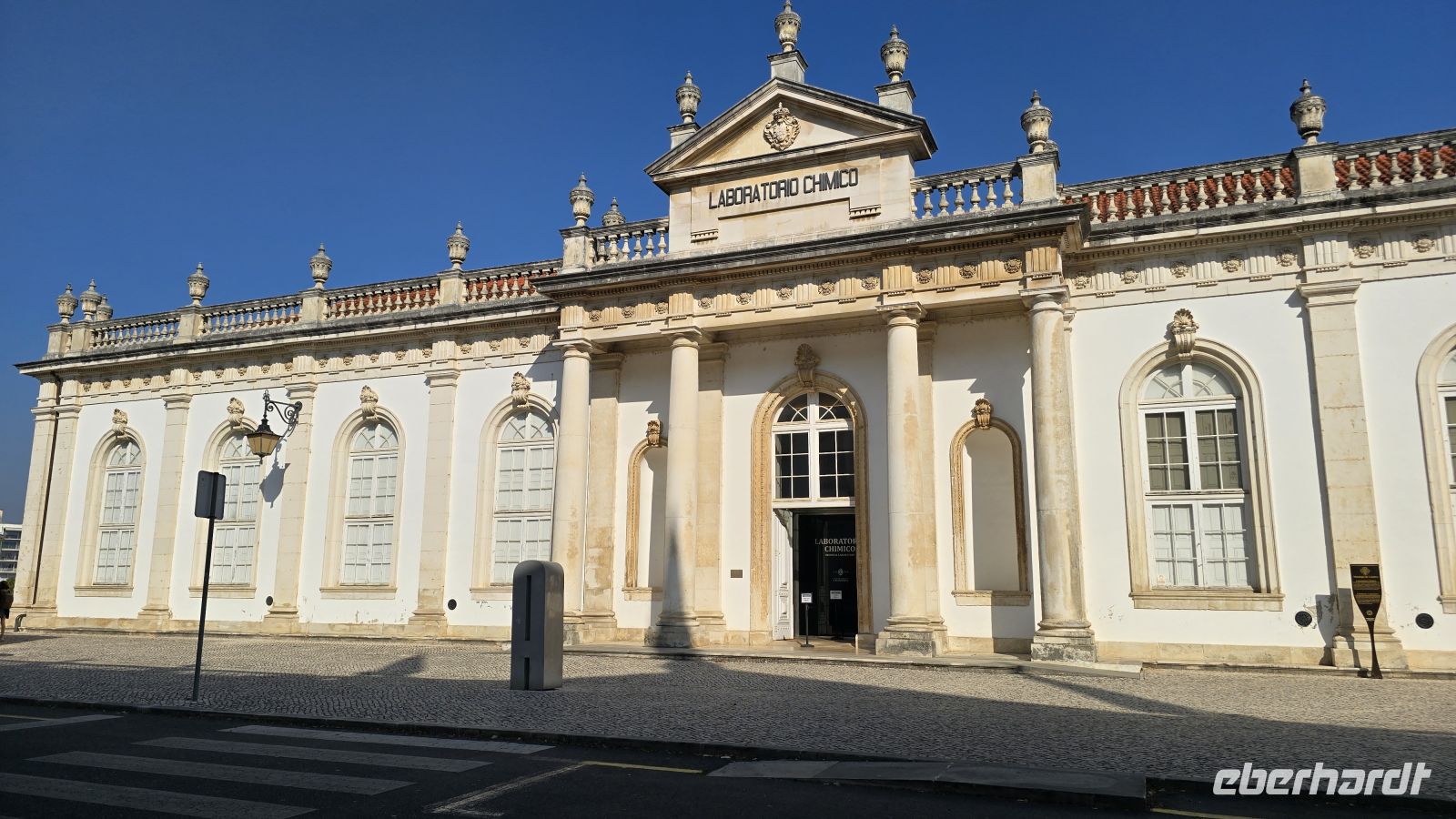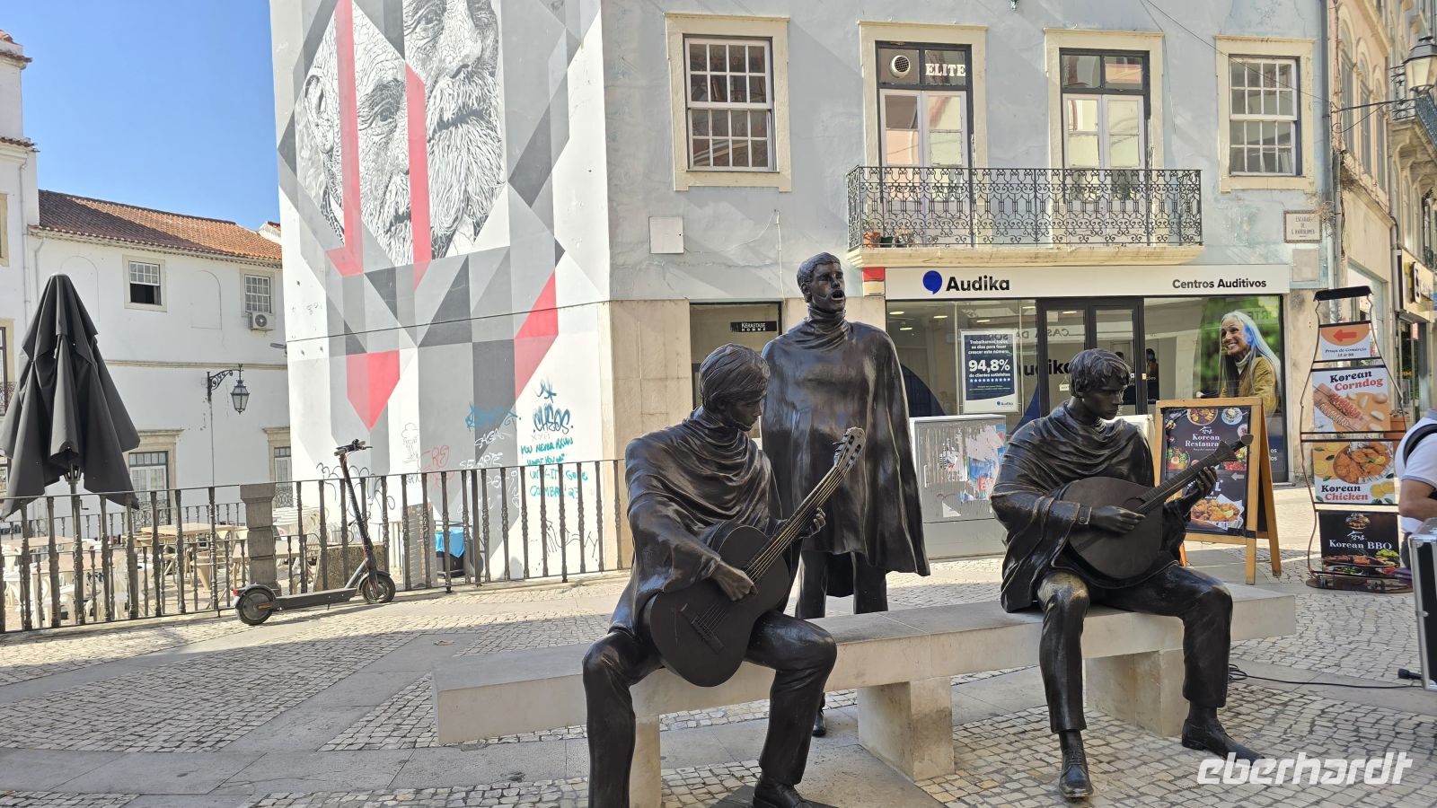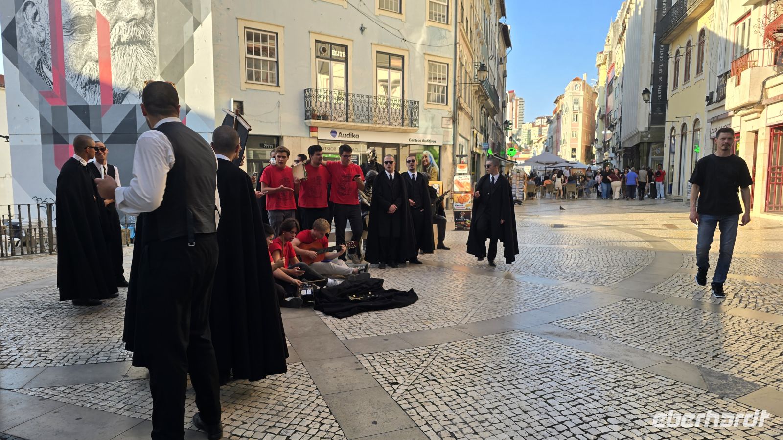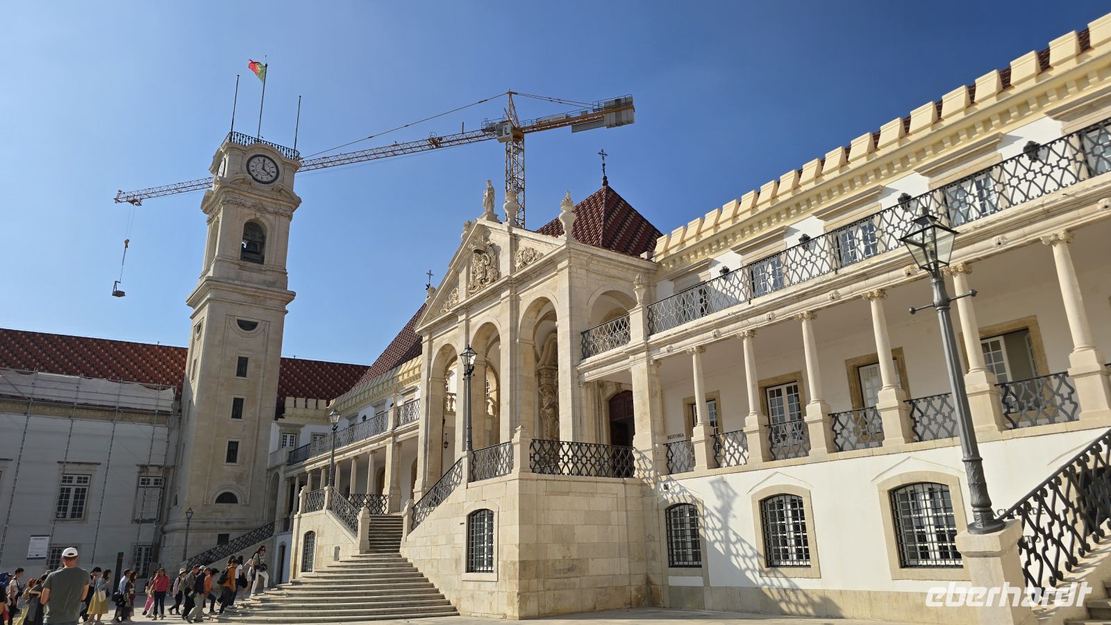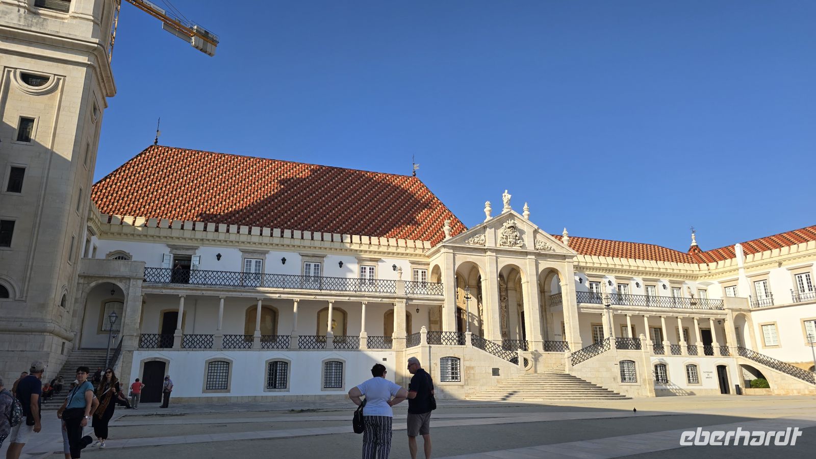 Der Bushalt am Hotel Astoria ist perfekt gelegen, sofort ist man am Lago da Portugem und auf einer der schönen Gassen und Straßen. Wir haben Zeit für eine Mittagspause, staunen über riesige Baisser in den Auslagen, entscheiden uns dann aber doch lieber für eine kleine Mittagsmahlzeit. Basilio wartet mit dem Bus auf uns und fährt uns dann zur Universität hinauf, durch engste Kurven und steile Anstiege. Gut, dass er so erfahren und versiert ist. Pünktlich sind wir vor Ort, spazieren an den Unigebäuden vorbei, Luis erzählt uns, warum der Turm hier die "Ziege" genannt wird: er regelte das Leben der Studenten. Sie wohnten außerhalb der Universitätsgebäude und der Turm kündete den Lernbeginn an und nach dem Läuten abends hatten Studenten nichts mehr auf den Straßen zu suchen...Unser Ziel ist aber die berühmte Bibliothek. Mehr als 50.000 Bände lagern hier in Räumen, ausgekleidet mit von Gold überzogenem Ebenholz, vergoldeten Wappen und Kronen über jedem Portal. Wir erfahren, dass sogar Fledermäuse hier gehalten werden. Sie vernichten die Insekten und sorgen so dafür, dass den Büchern nichts geschieht. Wir sind beeindruckt und folgen Luis auf einem Rundgang durch die Hallen und Gänge, die der König D. João III. der Universität überlassen hatte. Der Prunksaal ist ein Highlight, ebenso eine Ausstellung mit der Rekonstruktion des Gesichtes von König Dinis. Und auch hier überall Azulejos. Fotos vom Universitätsplatz folgen und dann spazieren wir zur Kathedrale. Sie stammt tatsächlich aus der Gründungszeit Portugals und wir staunen, dass diese Größe und Höhe im romanischen Baustil möglich waren. Dann spazieren wir weiter durch die Gassen und "Studentenrepubliken", bewundern eine "portugiesische Gitarre" am Stadttor und erreichen schließlich die Kirche de Santa Cruz. Überall treffen wir auf die neuen Studenten, die von älteren Semestern für allerlei "lustige" Spielchen durch die Stadt gescheucht werden. Basilio wartet mit dem Bus auf uns und bringt uns zu unserem Hotel Vila Gale. Ein edles Ambiete zum Abendessen verwöhnt uns und dann verabschieden wir uns- bis morgen.