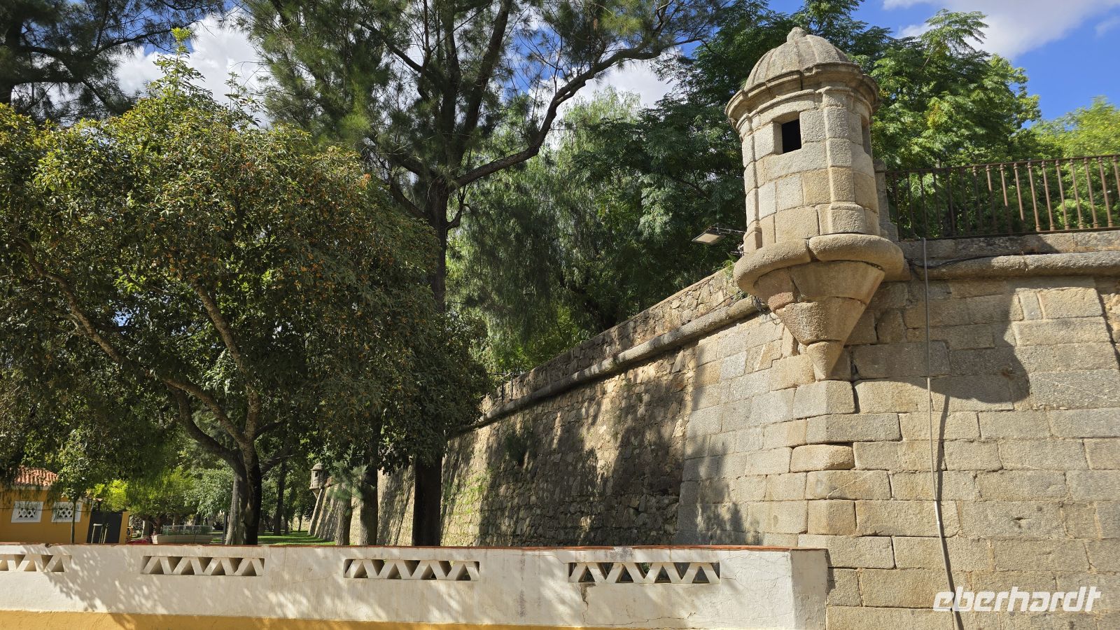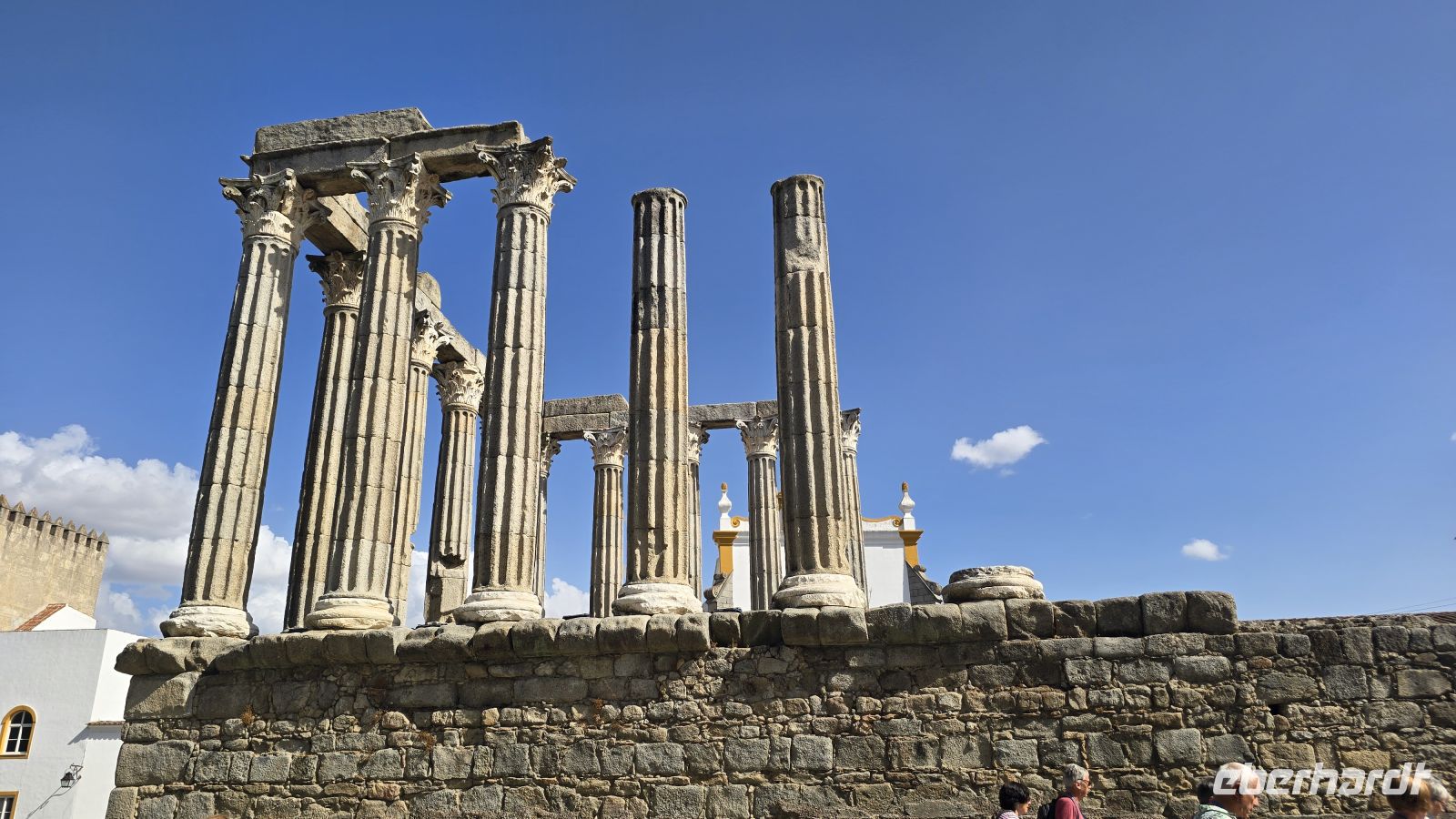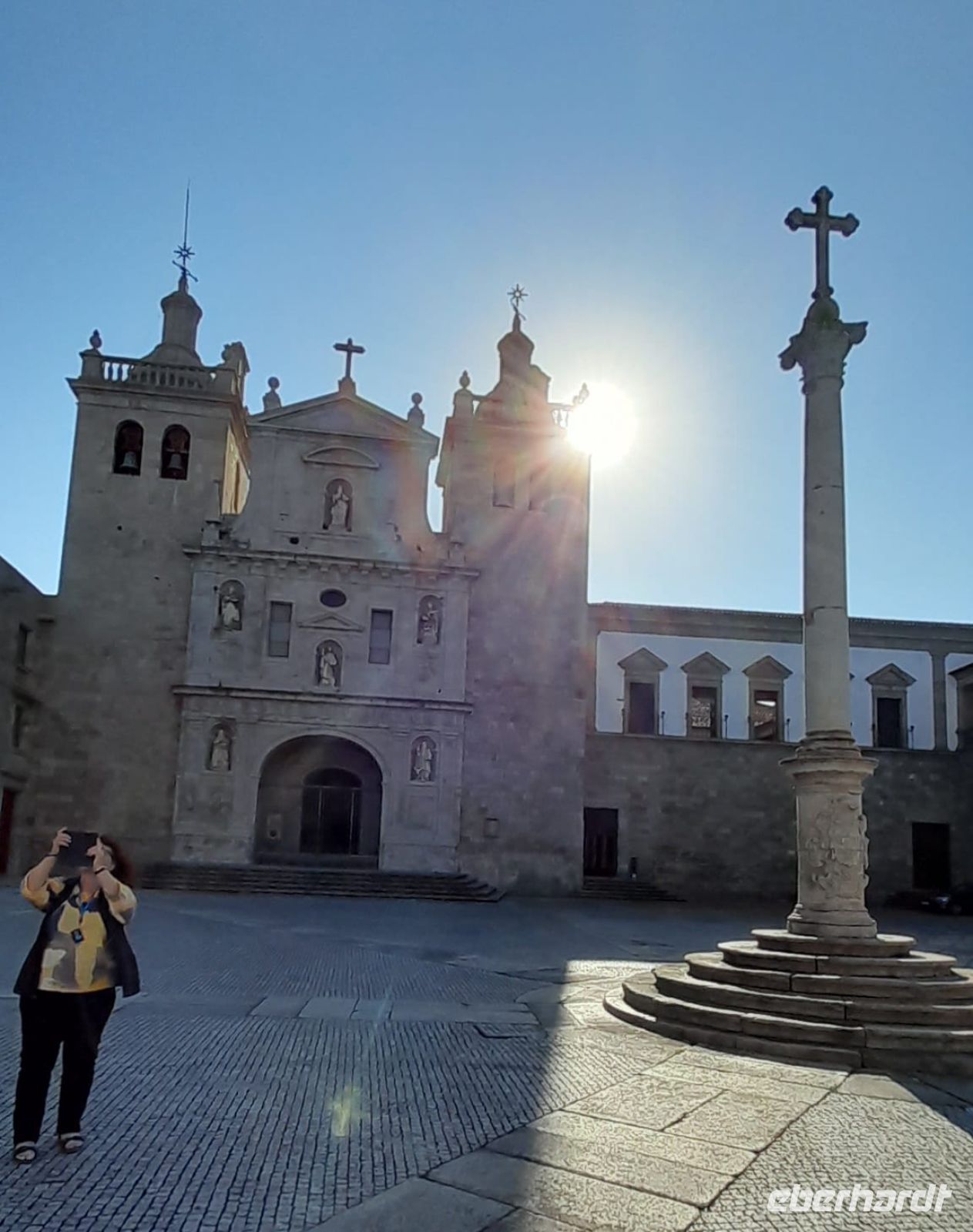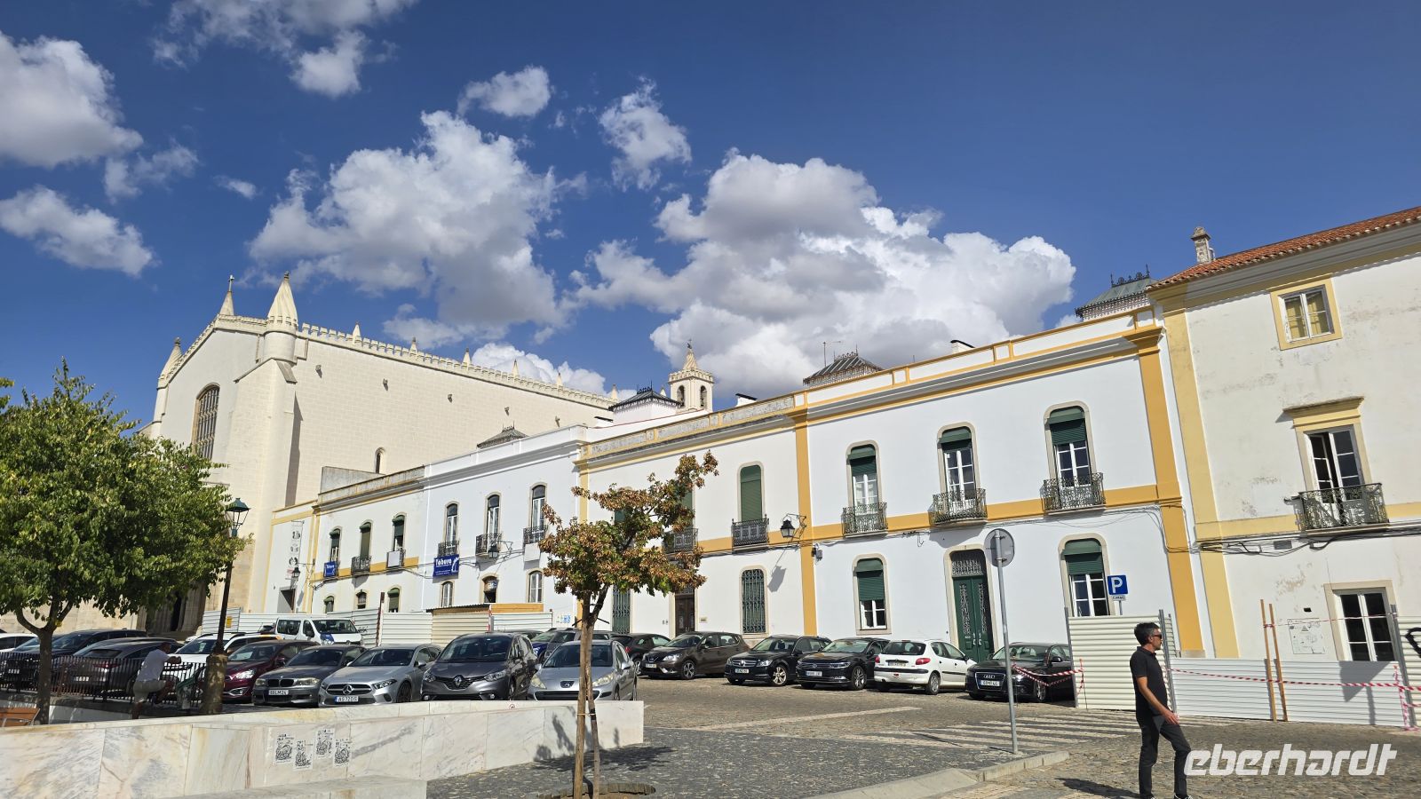 hatten wir bald erreicht und steigen an der Stadtmauer aus. Hier treffen wir auf römische Zeitzeugen- den römischen Tempel. Es ist Zufall, dass er erhalten blieb. Er war nämlich quasi eingemauert in dem Schlachthof, der hier einmal stand. Jetzt sind die Säulen wieder freigelegt und eine der Sehenswürdigkeiten von Evora, der Hauptstadt des Alentejo. Eine weitere ist ihre Kathedrale. Sie empfängt uns mit einem wunderschönen gotischen Portal. Im Inneren dann eine der seltenen Darstellungen der schwangeren Jungfrau Maria. Die barocke Ausgestaltung der Kirche ist überwältigend und man könnte stundenlang hier verweilen und doch immer wieder etwas Neues entdecken. Einige wagen sich dann mit Luis hinauf, andere bleiben in den Säulengängen und bewundern das einfallende Licht der Sonne, das nochmals durch Buntglas golden erscheint. Wir spazieren weiter durch die Gassen der Stadt, die schon immer bedeutender Handelspunkt war und auf dem Marktplatz schließlich trennen wir uns kurz, jeder hat individuell Zeit, die Stadt weiter zu erkunden oder einen Mittagsimbiss zu sich zu nehmen. Durch die Gassen geht es zu den Gärten von Evora mit ihren Pfauen. Am anderen Ende der Stadtmauer wartet Basilio mit dem Bus und wir können Richtung Süden aufbrechen. Am späten Nachmittag erreichen wir