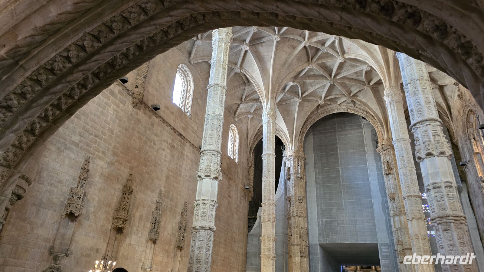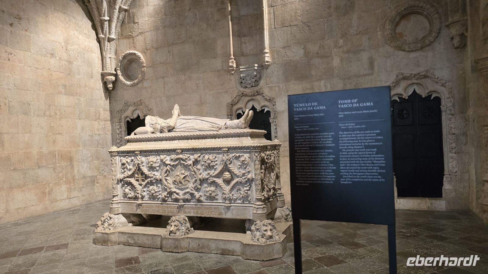 das wollen wir natürlich sehen. Am Park steigen wir aus und sofort nimmt uns dieser einzigartige Gebäudekomplex gefangen. Unter Manuel I. wurde es erbaut und der manuelinsche Baustil prägt das Bauwerk. Unglaublich reich verziert zieht es uns in seinen Bann. Als eines der wenigen Bauwerke hat dieses das verheerende Erdbeben und die darauf folgende Flutwelle 1755 überlebt, das wird auch auf den speziellen Baustil zurückgeführt. Zunächst aber ist Zeit für eine Mittagspause. Wer möchte stärkt sich oder besucht den Park am Präsidentenpalast. Am Bus treffen wir uns, Luis und ich hatten natürlich die berühmten Pasteten für alle gekauft und die galt es nun, zu verkosten, mit Zimt und Zucker, wer möchte. Als 1834 die religiösen Orden aufgelöst wurden mußten auch die Mönche hier das Kloster verlassen. Der Bäcker des Klosters eröffnete 3 Jahre später in Sichtweite des Klosters eine Konditorei, die heute noch existiert. Er kreierte hier die Pasteten, die nun zu Lissabon gehören wie die Kathedrale und der Tejo- die Pasteis de Belem. Dann geht es zum Kloster, tapfer ertragen wir die Sonne und ihre 30°C und stellen uns an, leider umsonst, unsere Tickets werden nicht anerkannt, also bleibt nur der Blick in die Kirche des Klosters. Wir besuchen die Grabstätte von Vasco da Gama und Fernando Pessoa, einem berühmten Dichter Portugals, durch die Sanierungsarbeiten ist leider vieles abgesperrt, aber ein Blick auf den Altar ist möglich. Dann spazieren wir zum