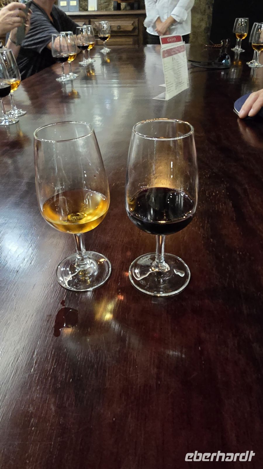 Hier lernten wir bei einer Führung viel Interessantes über die Herstellung dieses spezielen Tropfens, die verschiedenen Farben, das Reifen und die Haltbarkeit. Je nachdem, wir er abgefüllt wird, kann er nämlich noch in der Flasche nachreifen- so etwa beim Vintage. Oft ist es Brauch, dass man zur Geburt der Kinder eine Flasche dieses Jahrganges abfüllen läßt und sie erst bei der Hochzeit öffnet. Dann aber wollen wir selbstverständlich auch verkosten. Je einen roten und einen weißen Portwein probieren wir, für den passenden Rahmen und den Geschmack hatte ich dunkle Schokolade versorgt, da griffen alle beherzt zu und ließen es sich schmecken. Die eine oder andere Flasche wanderte dann auch in unsere Taschen und wird zu Hause an das tolle Erlebnis hier erinnern. Schon ist Zeit zum Aufbruch, Basilio bringt uns zum Hotel, wo ein wenig Erholung angesagt ist. Für das Abendessen fahren wir wieder in die Stadt, unweit vom Platz, an dem wir unsere Mittagspause verbracht haben ist unser Restaurant, das