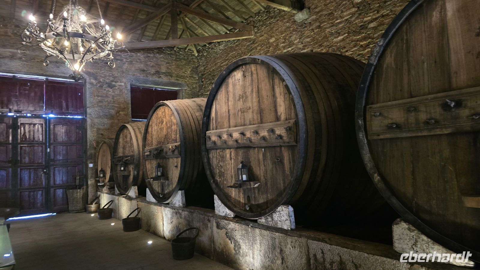 Ein Familienbetrieb, Gabriel wird uns führen, doch zuvor müssen wir schließlich kosten, was sie hier produzieren. Wir beginnen mit einem Weißwein- naja, steigerungsfähig für unsere Kenner (HobbyKelterer), dann folgen ein Roter und ein Rose. Gut, dass ich für einen kleinen Imbiss gesorgt hatte. Das Ambiente ist umwerfend, Sitzgelegenheiten unter der Pergola, Schaukeln, Aussichten ins Tal, Rosen und Reben, soweit das Auge reicht... Dann zeigt uns Gabriel das Anwesen und wir kommen gerade noch rechtzeitig. Die Ernte ist nämlich abgeschlossen und die letzten Trauben werden vergoren. Das passiert hier tatsächlich noch traditionell mit dem Füssen- die Trauben werden gestampft. Gabriel erzählt, dass nur der Mensch es schafft, dass beim Stampfen nicht die Kerne und Schalen zerstört werden, wie es eine automatische Presse unweigerlich tun würde. So vermeiden sie Bitterstoffe der Kerne und können einen exzellenten Wein herstellen. Von den Traubenbecken geht es zu den Fasslagern, und da gibt es tatsächlich noch Fässer der Großeltern-Generation, die nur für Ostern und besondere Gelegenheiten (auch für Versteigerungen für caritative Zwecke) abgefüllt werden. Natürlich können wir die eine oder andere Flasche erstehen und dann geht es die Serpentinen wieder hinunter. Immerhin waren wir auf über 600 Meter. Unsere Fahrt geht nach