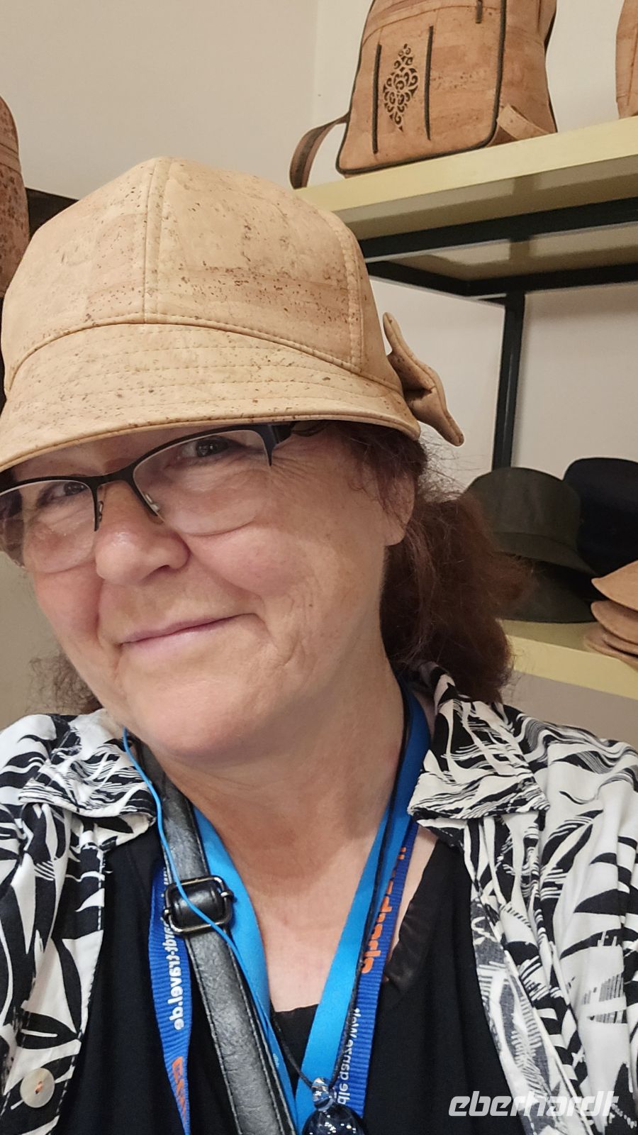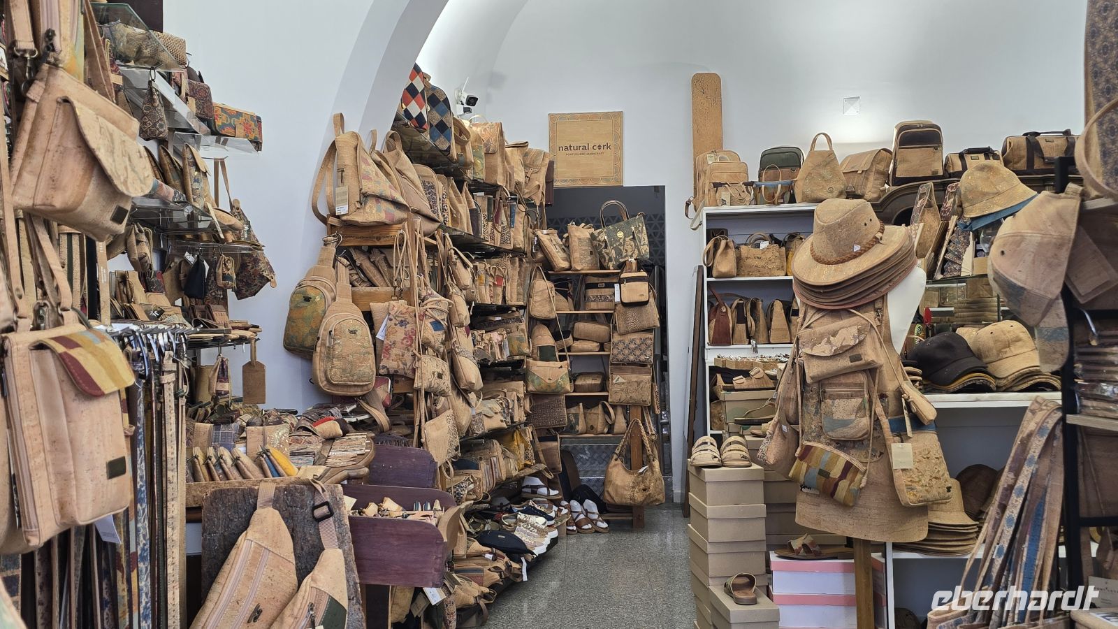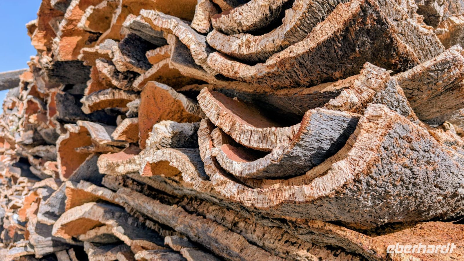 Die Korkeiche im Hof zieht schon mal unsere Aufmerksamkeit auf sich, eine 5 ist auf ihren Stamm gemalt, dass heißt, sie wurde 2025 geschält. Korkeichen sind immer eine Investition in die Zukunft. Erst nach ca. 25 Jahren kann man die Eichen das erste Mal Schälen, dann nur alle 9 Jahre. Das verdeutlichen die Nummern an den Stämmen. Sie verraten, wann diese Bäume das letzte Mal geschält wurden. Das ist nach wie vor Handarbeit. Keine Maschine schafft es, die Rinde so genau zu schälen, dass der Stamm nicht verletzt wird. Korkeichen werden um die 200 Jahre alt. Aber auch die riesigen Stapel Korkeichenrinde hier lassen uns staunen. In der großen Halle dann wird Kork gesammelt, gekocht und nach Qualität sortiert. Wir sind erstaunt, wie die Arbeiter hier mit geübtem Blick die Beschaffenheit der Korkrinden prüfen und sortieren. Einige von uns sitzen schon mal auf den Korkmöbeln Probe, wir bekommen erläutert, wie z.B. die Korken hergestellt werden, welche Qualitäten des Korkes es gibt und wie es sogar genäht und gefärbt werden kann. Dann können wir uns im Showroom umsehen und sind überrascht, was man aus Kork alles herstellen kann, selbt Krawatten und Schirme. Natürlich mußten wir hier einige Erinnerungsstücke mitnehmen. Wir fuhren weiter durch den Alentejo, das heißt etwa "nahe dem Tejo" und umfaßt ein riesiges Gebiet vom Tejo im Norden bis hinunter an die Algarve.