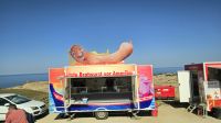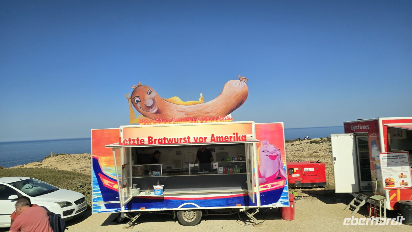 schließlich grüßt zuerst der Leuchtturm, er kann auch in 46 Kilometern Entfernung noch von den Schiffen gesehen werden und wir genießen diese Atmosphäre an den Steilklippen. Rund 70 Meter sind sie hoch und wir sind von den Urgewalten der Wellen unter uns überwältigt. Leider gibt es zum Leuchtturm heute keinen Zutritt mehr, aber wir nutzen das umliegende Gelände, immer mit dem Hinweis: bitte vorsichtig sein... Weniger vorsichtig muss man sein, wenn man die "letzte Bratwurst vor Amerika" genießen möchte, das geht nämlich und es sind Thüringer Bratwürste! Mit Bautzner Senf. Deutsche Auswanderer haben hier ihren Stand und das mußten wir natürlich probieren. Auch Basilio freute sich über eine Bratwurst und so gestärkt ging es nach