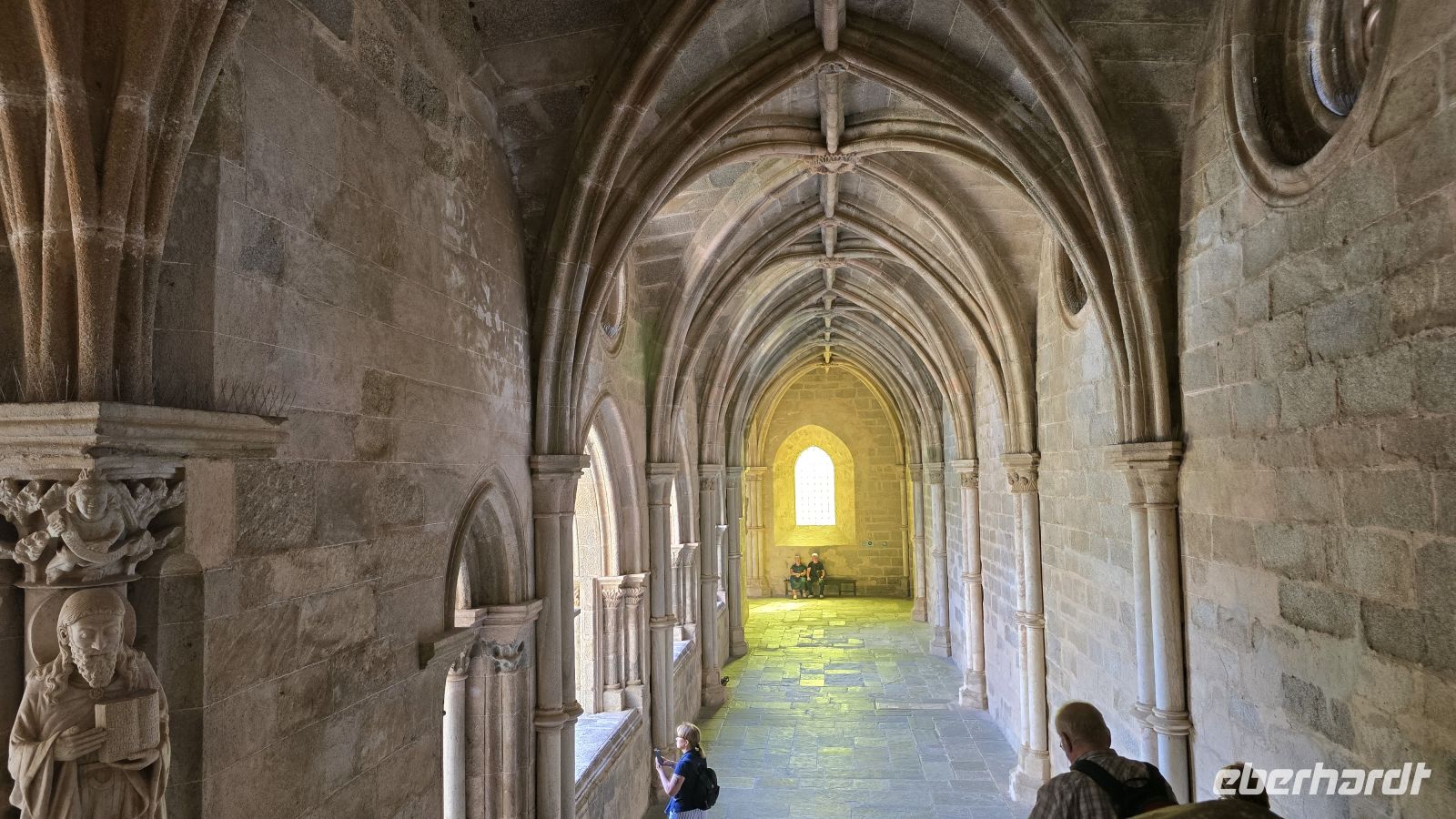 Es wurde gestiftet von Joao I. für seinen Sieg über Kastillien 1385. Das klingt simpel, was uns erwartet ist aber alles andere als das: Ein überragend schöner Gebäudekomplex der Hochgotik. Wir sind beeindruckt und schauen uns gemeinsam die Kirche, die Grabstätten der Könige, den Kreuzgang und natürlich den scheinbar unvollendeten Anbau an. Im Kreuzgang ist auch ein Denkmal für den unbekannten Soldaten. Bau und Ausstattung hier sind überragend und natürlich begegnet uns auch wieder der manuelinische Baustil mit seinen Schiffstauen. Dass die Kapelle mit Absicht nicht weiter gebaut wurde erklärt sich mit dem dann fehlenden Licht in der Kirche. Ich erstehe noch einige typisch portugiesische Süßigkeiten und erwarte die Gäste am Bus mit dieser kleinen Stärkung. Weiter geht unsere Reise nach