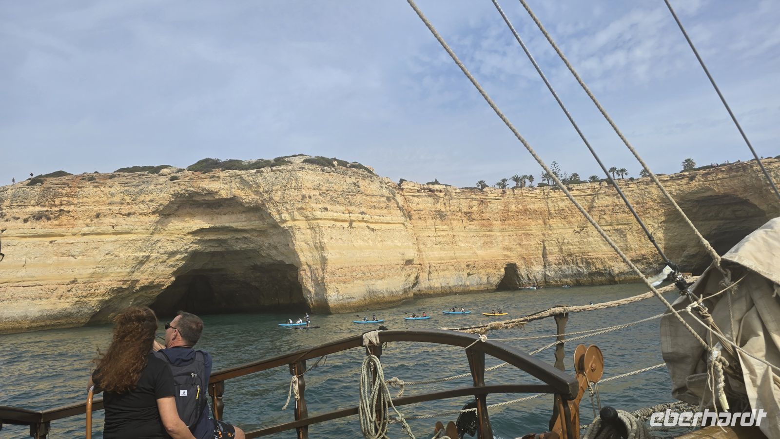 Wir durften an Bord und eine unvergessliche Fahrt an der Küste der Algarve entlang unternehmen. Unter Segel ging es hinaus auf den Atlantik. Strahlender Sonnenschein begleitete uns, nur ab und an gab es ein Wölkchen. Mit den Beibooten war es möglich, die Grotten und Höhlen von Benagil zu besuchen, also umsteigen und los ging es! WOW- ein Traum! Zurück an Bord hieß es die Aussicht auf die Küste zu genießen. Mit aufgetankter Seele und jeder Menge Meeresbrise ging es zurück zum Hafen in Portimão. Unser Shuttle wartete bereits und brachte uns zurück zum Hotel. Den restlichen Nachmittag verbrachte jeder indviduell, erst zum Abendessen trafen wir uns wieder. Es war unser letzter gemeinsamer Abend und so überraschte ich unsere Gäste mit einem Abschieds-Cocktail: einem Port-Tonic. So, wie wir auch begonnen hatten. Wir stießen auf die vielen schönen Erlebnisse an und ließen die Reise Revue passieren. Wünschten unseren "Verlängerern" viel Spaß und gute Heimreise. Danke für eine wunderbare Zeit!
