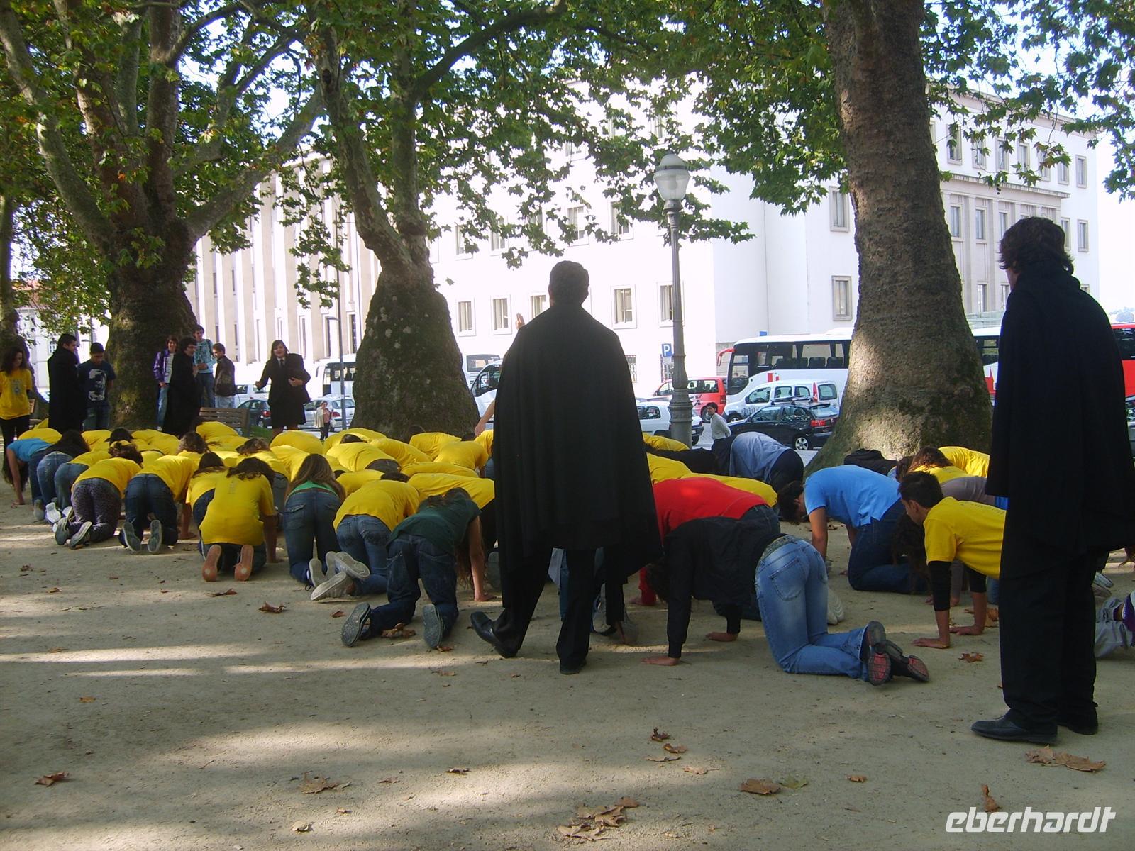 Der heutige Morgen begrüßte uns mit Sonnenschein. Direkt zu Beginn unseres Stadtspaziergangs durch Porto begegneten und junge Studenten, die mit gelben Shirts (Studienanfänger) und schwarzen Mänteln (Studenten, die bereits ein Jahr studiert haben) gekleidet waren. In Portugal ist es zu Beginn eines jeden Studienjahres Tradtion, dass die Erstsemestler von den älteren Studenten „gequält“ werden. Sie müssen in der prallen Sonne joggen und laut singen oder stundenlang kniende lateinische Verse aufsagen.