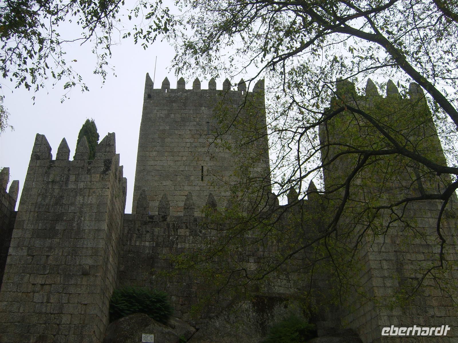 Zunächst bestiegen wir die Treppen hinauf zur Burg von Guimaraes. Etwas unheimlich erschien uns die Tatsache, dass keinerlei Zäune die hohe Brüstung des Castelo begrenzten. Trotz dessen wagten wir uns die steilen Stufen hinauf, um den tollen Blick über die Stadt bestaunen zu können.