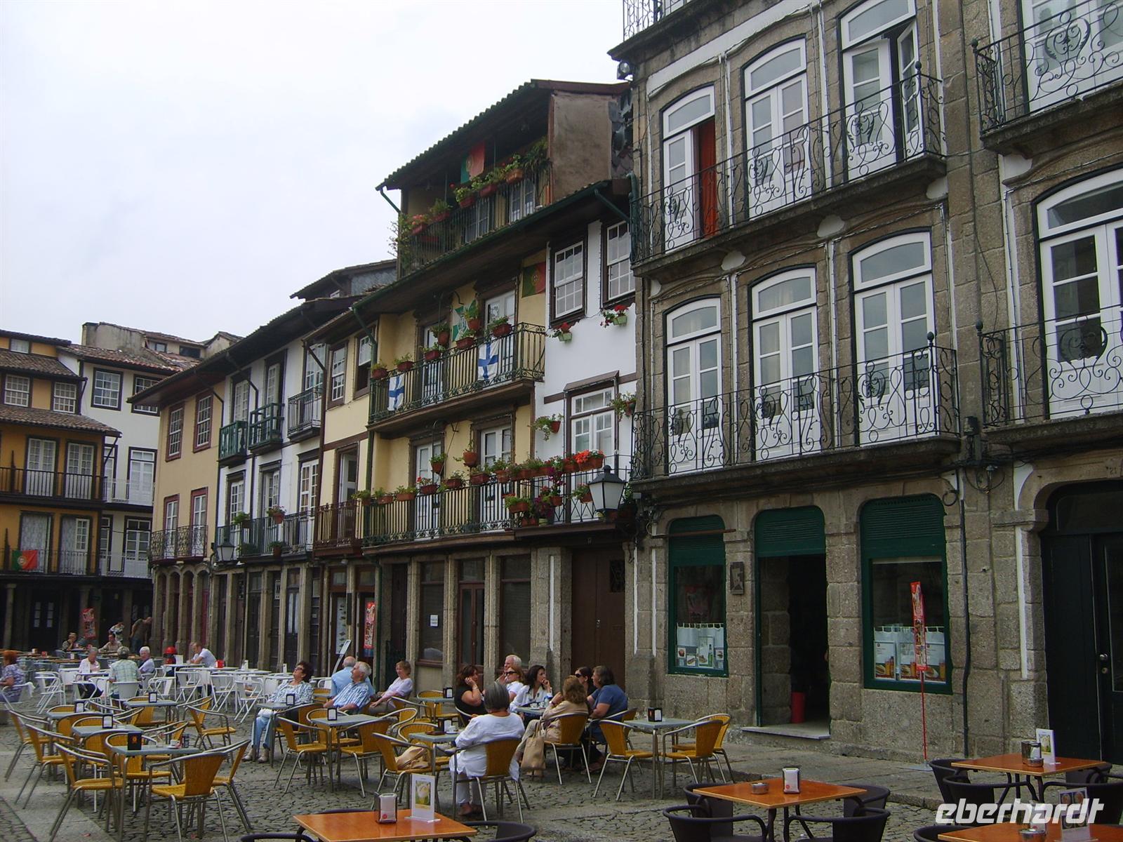 Unten angekommen machten wir einen weiteren „alkoholhaltigen“ Stopp in der „Casa da Tojeira“, um eine Kostprobe des Vinho Verde im gemütlichen Garten des Hauses zu genießen. Nach dieser kleinen willkommenen Pause ging es zu Fuß in die historische Altstadt, die im Jahr 2012 zur europäischen Kulturhauptstadt ernannt wird. Durch verwinkelte Gassen schlenderten wir vorbei am Palast dos Duques de Braganca zum Marktplatz, wo gerade die Tische für den Mittagsbetrieb gedeckt wurden. An dieser Stelle machten auch wir eine kleine Mittagspause. Zu Beginn der nächsten Busetappe machte machte uns Luisa mit einer portugiesischen Redensart vertraut: zum Beten geht man nach, zum Studieren zieht man nach Coimbra, um Geld zu verdienen nach Porto und um das Geld auszugeben, fährt man nach Lissabon.