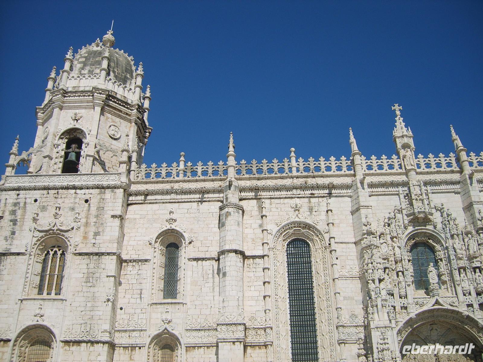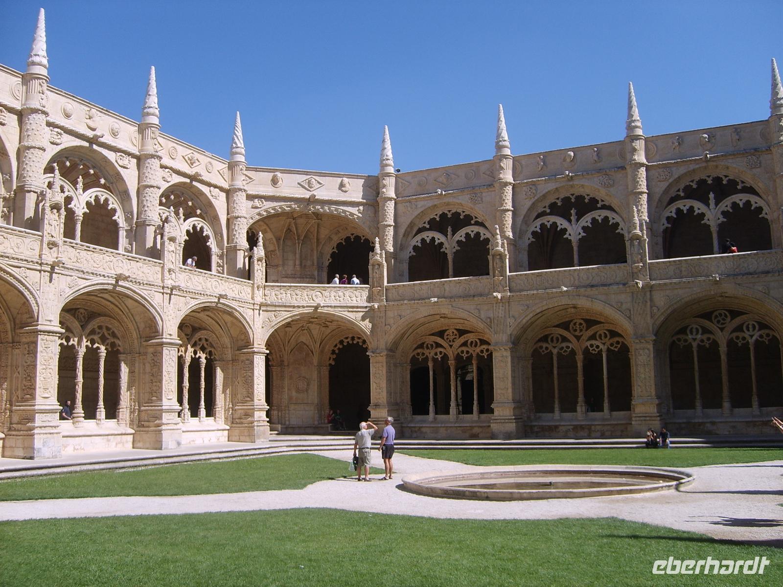 Wir fahren weiter nach Belém zum Hieronymuskloster. Doch bevor wir das sandfarbene Bauwerk besichtigen genießen wir im Schatten der Bäume im Park die köstlichen Pasteis de Belém. Das sind kleine Törtchen aus Blätterteig, die mit Pudding gefüllt und mit einer dünnen Zuckerkruste gedeckelt sind. Wahlweise kann man diese mit Zucker und/oder Zimt bestreuen. Nachdem wir die noch warmen Teilchen verkostet haben, bestaunen wir die verwinkelten Kreuzgänge des Klosters, dessen Säulen Türmchen an eine überdimensionale Kleckerburg erinnern. In der glühenden Sonne warten wir aufgrund eines Gottesdienstes im Anschluss auf den Eintritt in die benachbarte Kirche, um das Grab von Vasco da Gama zu betrachten.