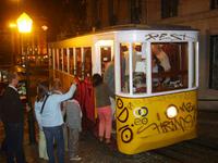 Gegen 15:30 teilte sich die Gruppe: einige fuhren direkt zum Hotel zurück, andere liefen zu Fuss. Ein weiterer Teil der Gruppe fuhr mit mir zusammen mit der historischen Bahnlinie Nummer 1 bis Forte de San Joao Baptista da Foz. Begleitet wurde unsere Fahrt durch zwei blinde Passagiere, die sich tollkühn an die äußere Begrenzung der Bahn klammerten.