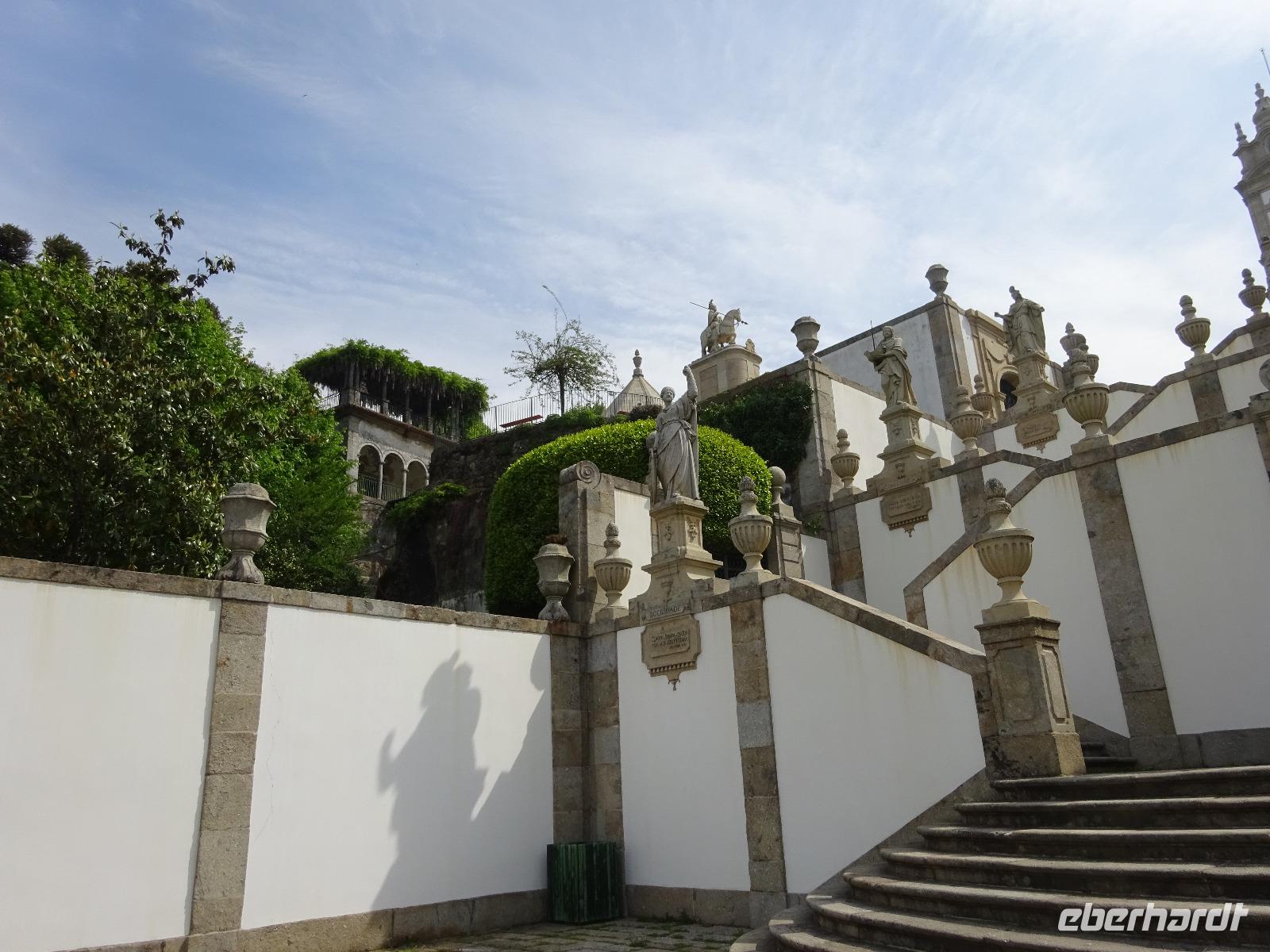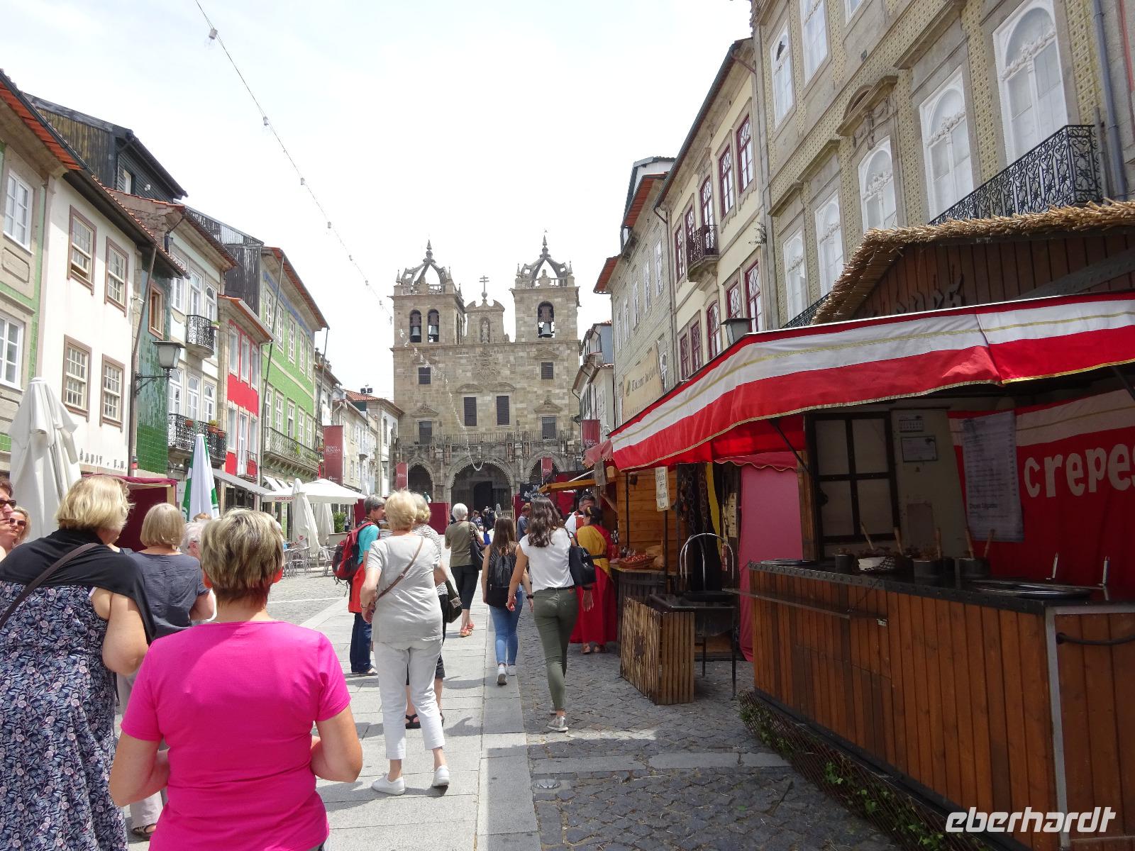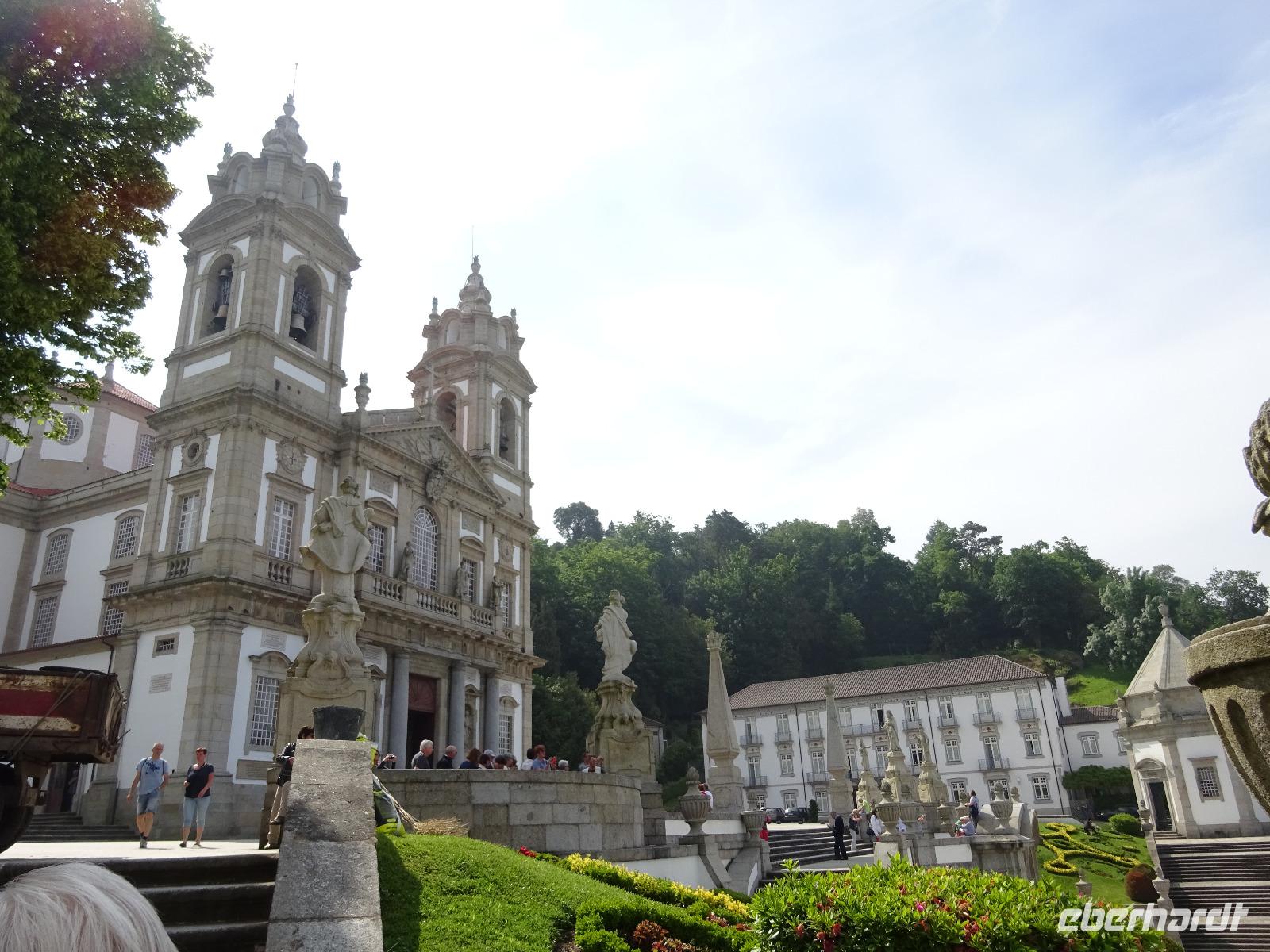 Heute fuhren wir für unseren Ausflug nördlich von Porto. Unser erster Besuch war der Wallfahrtsort Bom Jesus. Zur Kirche konnte man über eine reich verzierte Treppe den Berg hinauf laufen oder die weltälteste Wasserballastbahn nutzen. Wir bevorzugten die 1882 errichtete Standseilbahn. Oben angekommen besichtigten wir die neoklassizistische Wallfahrtskirche und konnten in der anschließenden Freizeit die Treppe mit den zahlreichen Statuen, Fontänen und kleinen Kapellen erkunden. Wer es bequemer wollte, setzte sich in das Café und genoss die wundervolle Aussicht auf die angrenzende Stadt Braga oder erkundete die hübschen Parkanlagen. Anschließend fuhren wir direkt in eine der ältesten Städte Portugals, nach Braga. Dort fand gerade ein Mittelalterfest statt, daher begegneten uns immer wieder Ritter und Mägde. Isabel führte uns durch das Zentrum und gewährte uns wieder ausreichend Zeit, die Stadt mit den aufgebauten Ständen in den kleinen Gassen und Straßen selbst zu erkunden. Nach unserer Mittagspause fuhren wir zur Wiege der Nation Portugals. So wird die Guimares auch gern betitelt, schließlich ernannte hier Heinrich von Burgund die Grafschaft Portucale einst zum Königreich und auch hier wurde der erste portugiesische König Alfonso Henriques im 12. Jahrhundert geboren. Vom antiken Schloss und der Festung, welche die Stadt vor Attacken der Mauren und Normannen beschützen sollte, führte unser Spaziergang in das kleine charmante Zentrum mit den gotischen Bauten und traditionellen Häusern. Die Restaurants und Cafés hatten ihre Stühle im Außenbereich aufgebaut und luden zum Pausieren ein. Wieder erkundeten wir Guimares nach der Stadtführung auf eigene Faust. Nachdem wir an dem heutigen Tag eine Menge gesehen haben, waren wir am Ende des Tages doch ein wenig geschafft. Das Abendessen konnte heute jeder individuell gestalten. Einige gingen in das angrenzende Einkaufszentrum El Corte Inglés essen oder in das Restaurant vom ersten Abend.