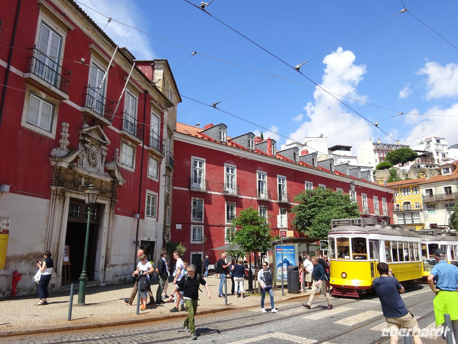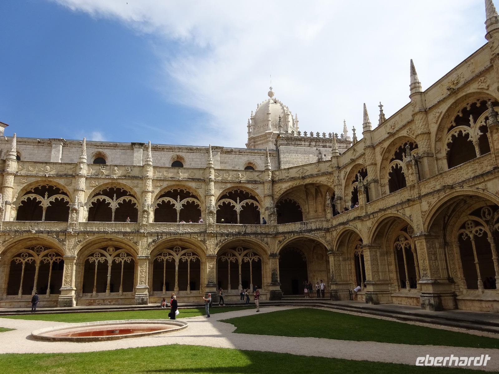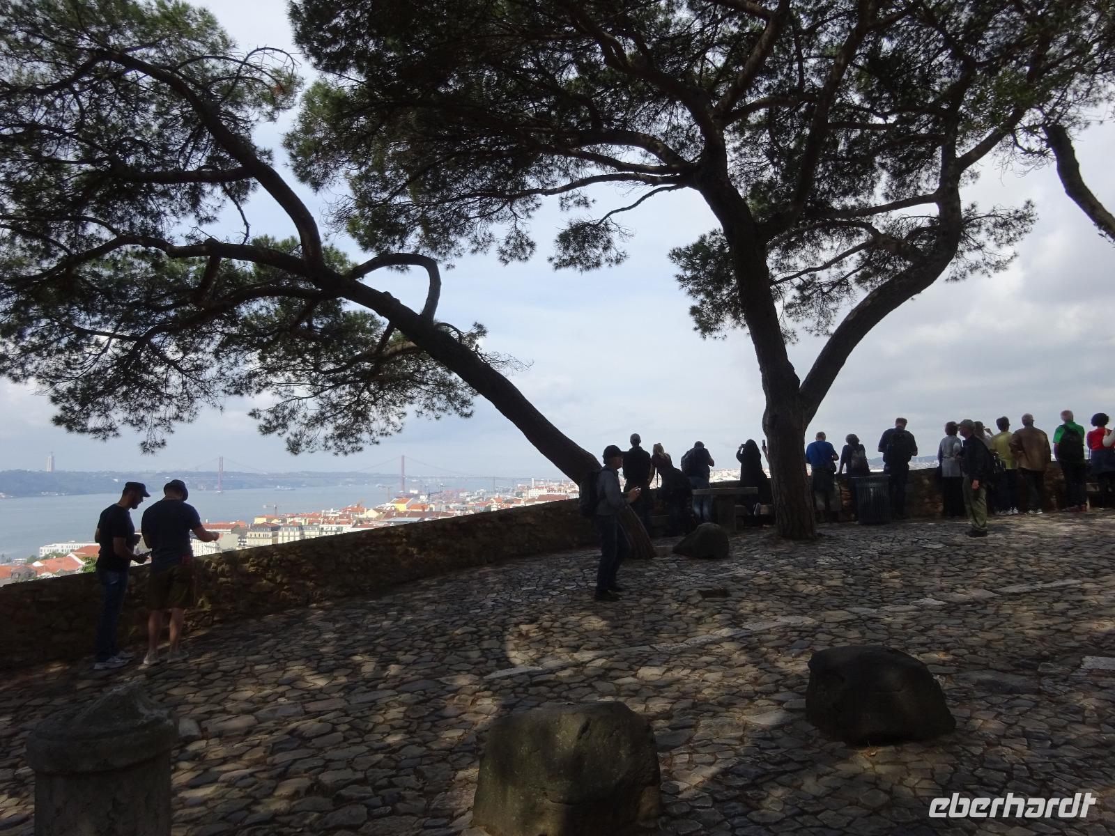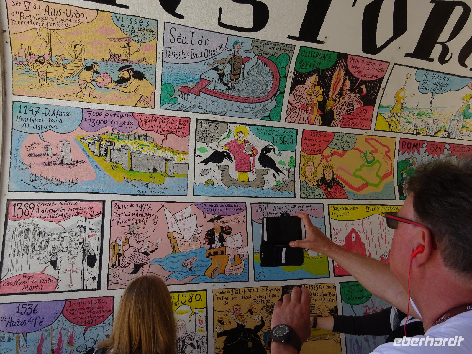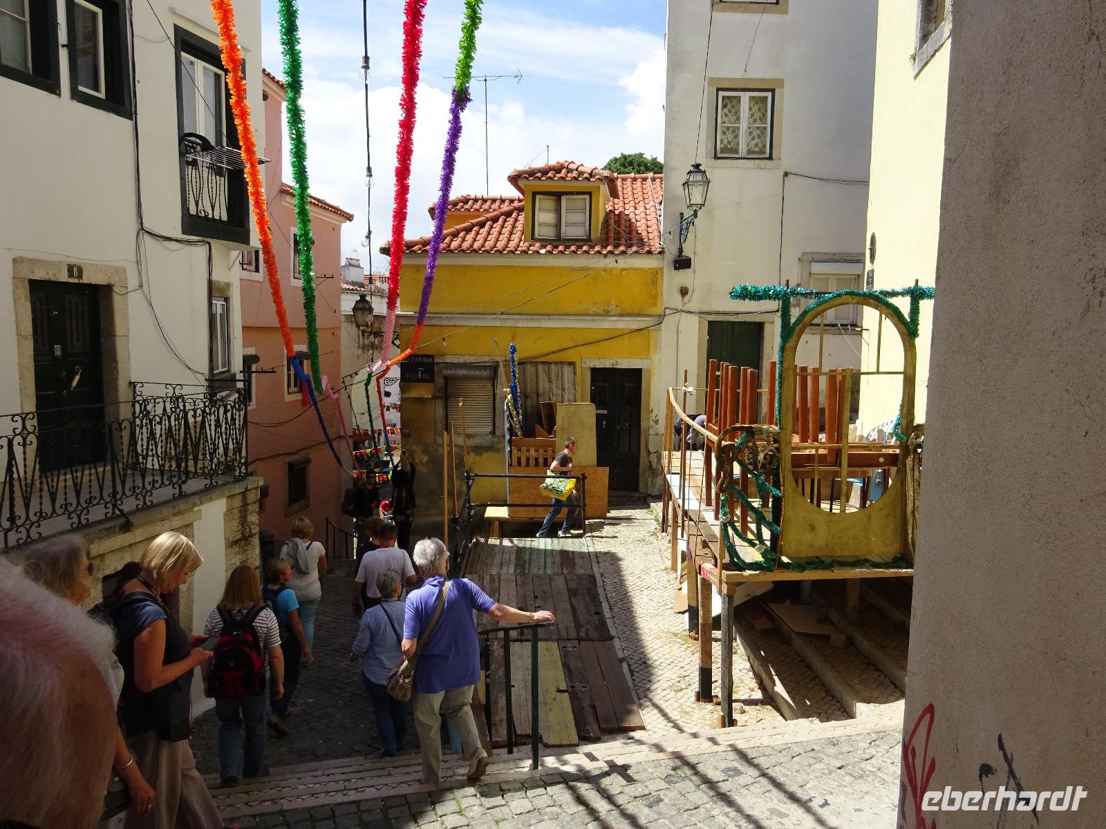 Heute erwartete uns sehr viel besseres Wetter, als den Tag zuvor. Die Sonne ließ sich wieder blicken und wir starteten gut gelaunt unsere Stadtrundfahrt mit Isabel. Wir fuhren vorbei am monumentalen Denkmal des Marques de Pombal, welche mit einem Löwen Richtung Tejo-Fluss blickte. Vorbei am Rossio-Platz und dem Fahrstuhl Elevador de Santa Justa passierten wir den Comercio-Platz in Richtung Alfama. Ab dort ging unsere Besichtigung per pedes weiter. Wir besichtigten die Catedral Se Patriarcal, die Hauptkirche Lissabons, an der vor dem Bau eine Moschee stand. Isabel erklärte uns die verschiedenen architektonischen Baustile und die gotischen Grabstätten aus dem 14. Jahrhundert. Während wir weiter spazierten, fuhr die historische Straßenbahn Nr. 28 an uns vorbei und wir entdeckten alte Ausgrabungen eines Theaters, welches für den Schutz nicht weiter ausgegraben wird. Wir erreichten den Park des Castels Sao Jorge hoch oben in der Altstadt. Uns bot sich ein fantastischer Ausblick auf die Stadt, den Fluss Tejo, die große Jesusstatue und die beeindruckende Brücke. Isabel gab uns ein wenig Zeit, den Park und die Aussicht zu genießen. Anschließend schlenderten wir durch die verwinkelten und urigen Gassen der Alfama. Überall sah man, dass die Vorbereitungen des bevorstehenden Johannesfestes in vollem Gange waren. Die Gassen waren bunt geschmückt und kleine Stände sowie sehr rustikal aufgebaute Podeste zum Verweilen wurden gerade von den Einheimischen angefertigt. Wieder im Bus fuhren wir zum Rossio-Platz und konnten nun in der Mittagspause nach Lust und Laune in der Stadt schlendern. Anschließend fuhren wir Richtung Hieronimuskloster und passierten dabei die Brücke des 25. April, die baugleich der Golden Gate Brücke aussah. Unser Ziel war der Torre de Belem. Der Wachturm am Tejo gilt als das Wahrzeichen der Stadt und bewachte früher die Einfahrt der Karavellen. Ein Flugzeug, welches an die Überquerung des Atlantiks 1922 erinnerte, konnte man ebenfalls bestaunen. Nun führte uns eine kurze Busfahrt zum imposanten Denkmal der Entdecker, welches 1960 zum 500. Todestag von Heinrich dem Seefahrer errichtet wurde. Das Bodenmosaik zu Füßen des Denkmals erinnerte an die großen Seefahrerzeiten. Als nächster Programmpunkt stand eine Besichtigung des Hieronimusklosters auf dem Plan. Isabel führte uns durch die Kirche mit gigantischen Säulen, zeigte uns das Grabmal von Heinrich dem Seefahrer und erklärte uns den Kreuzgang. Um uns ein wenig zu stärken, kosteten wir wieder außerhalb des Klosters, die berühmten Pasteis de Belem. Die Fábrica dos Pastéis de Belém stellt bereits seit 1837 die kleinen Puddingteilchen her und das Rezept wurde bis heute geheim gehalten. Gemeinsam fuhren wir wieder zurück zum Hotel und jeder konnte nach eigener Fasson den Abend gestalten. Einige aßen gemeinsam in der Innenstadt und schlenderten anschließend durch das beleuchtete Lissabon.