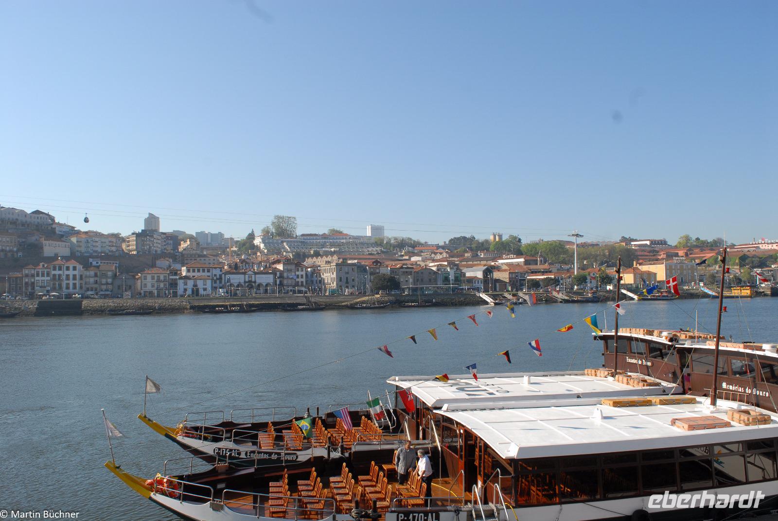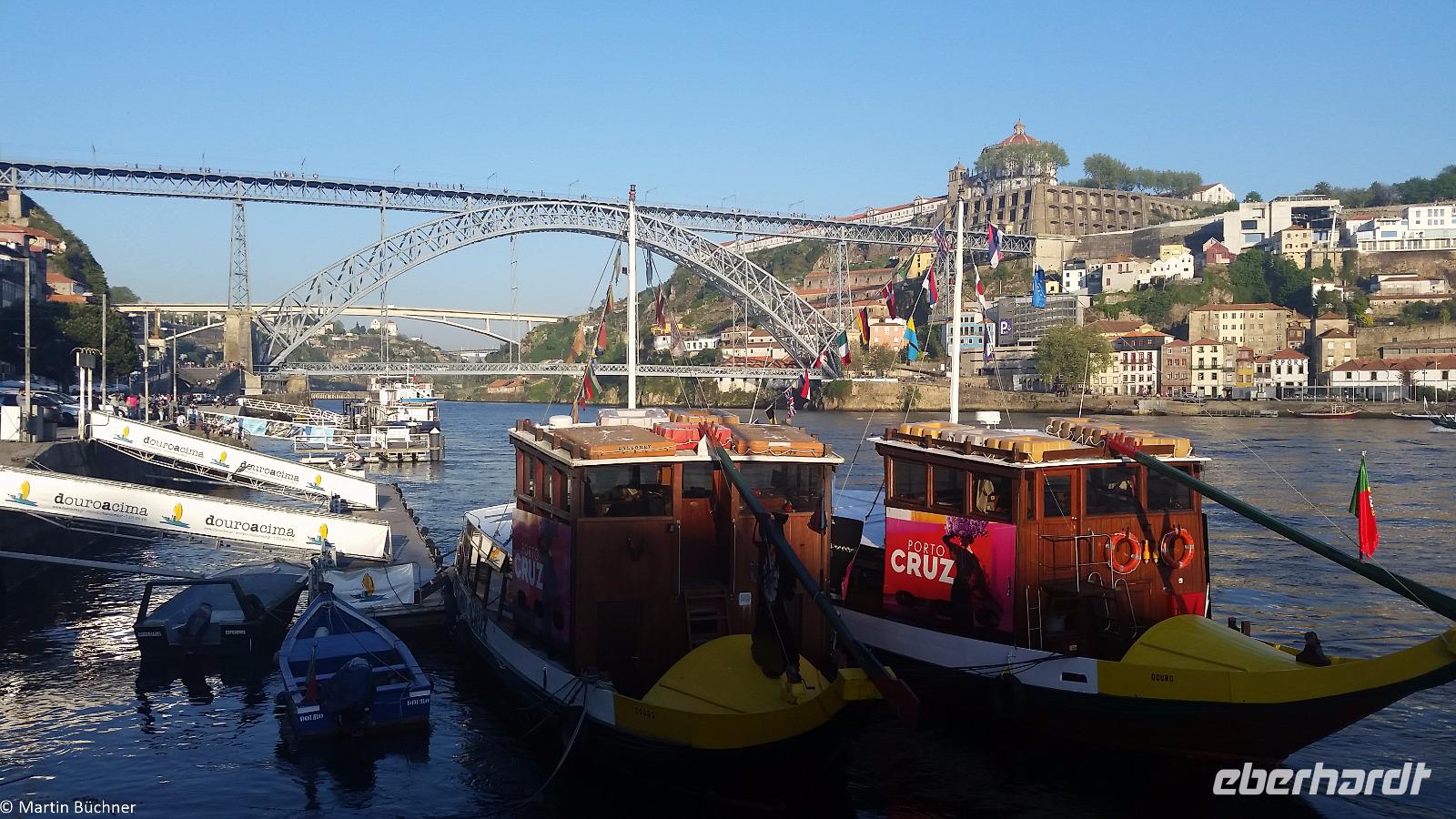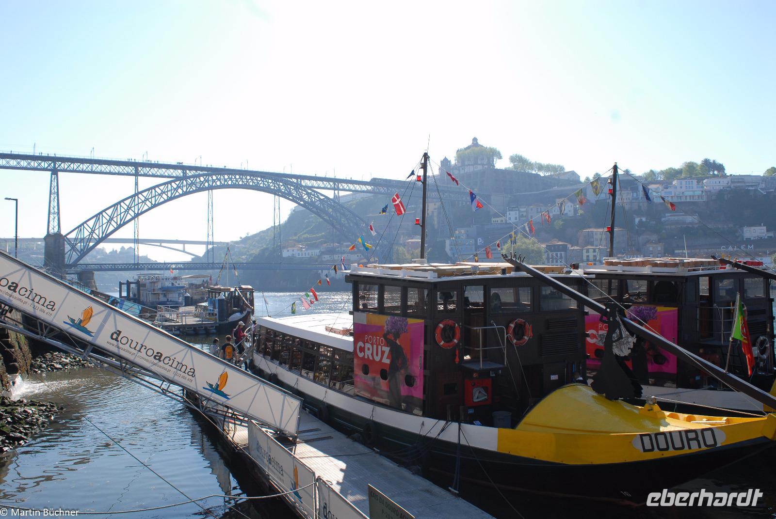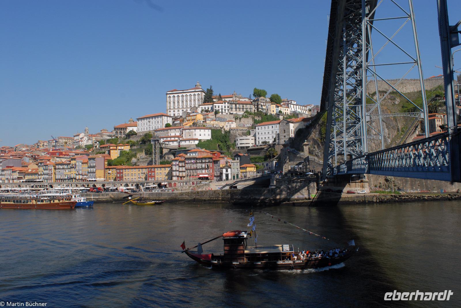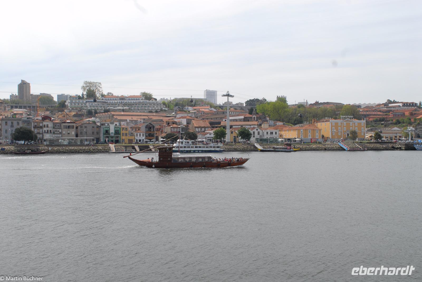 Wir möchten uns die Szenerie heute von der Flussseite her anschauen. Mit einem, den traditionellen Portwein-Booten nachempfundenen Schiff fahren wir zunächst ein Stück flussaufwärts. Dann bewegen uns wir uns unter den fünf riesigen Brücken hindurch bis fast zur Mündung des Flusses.