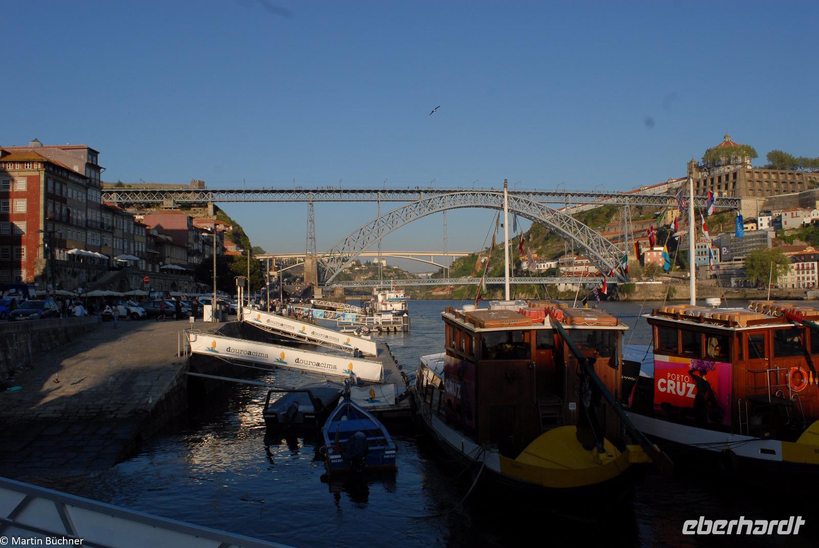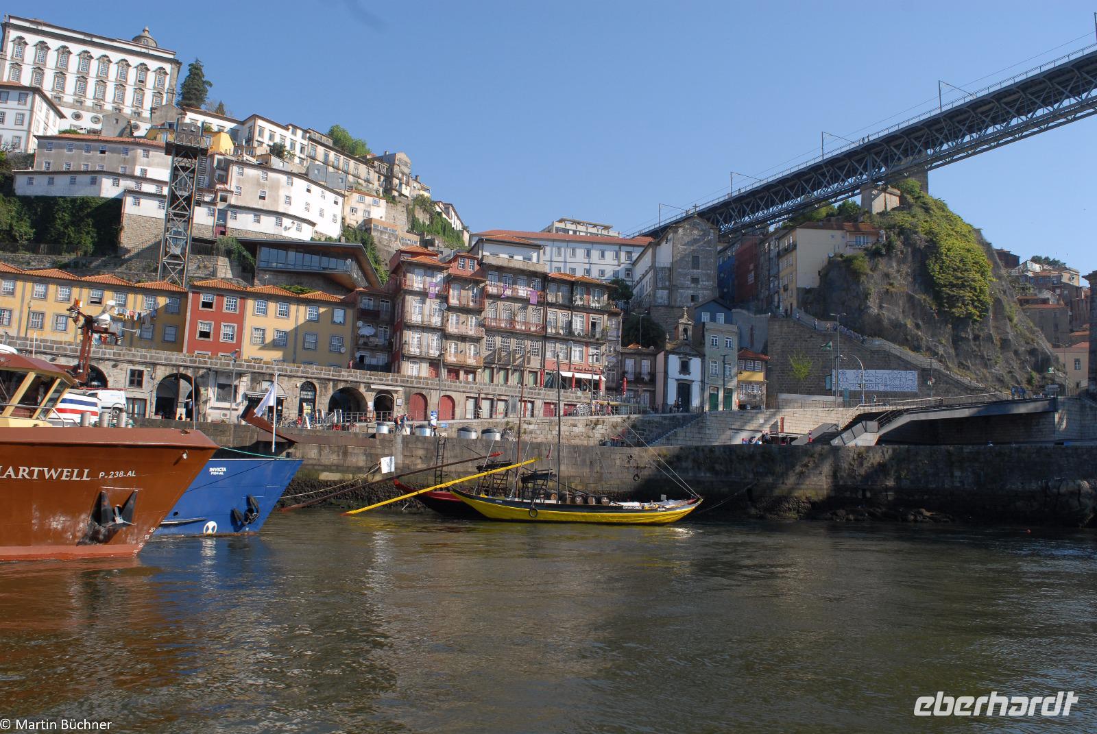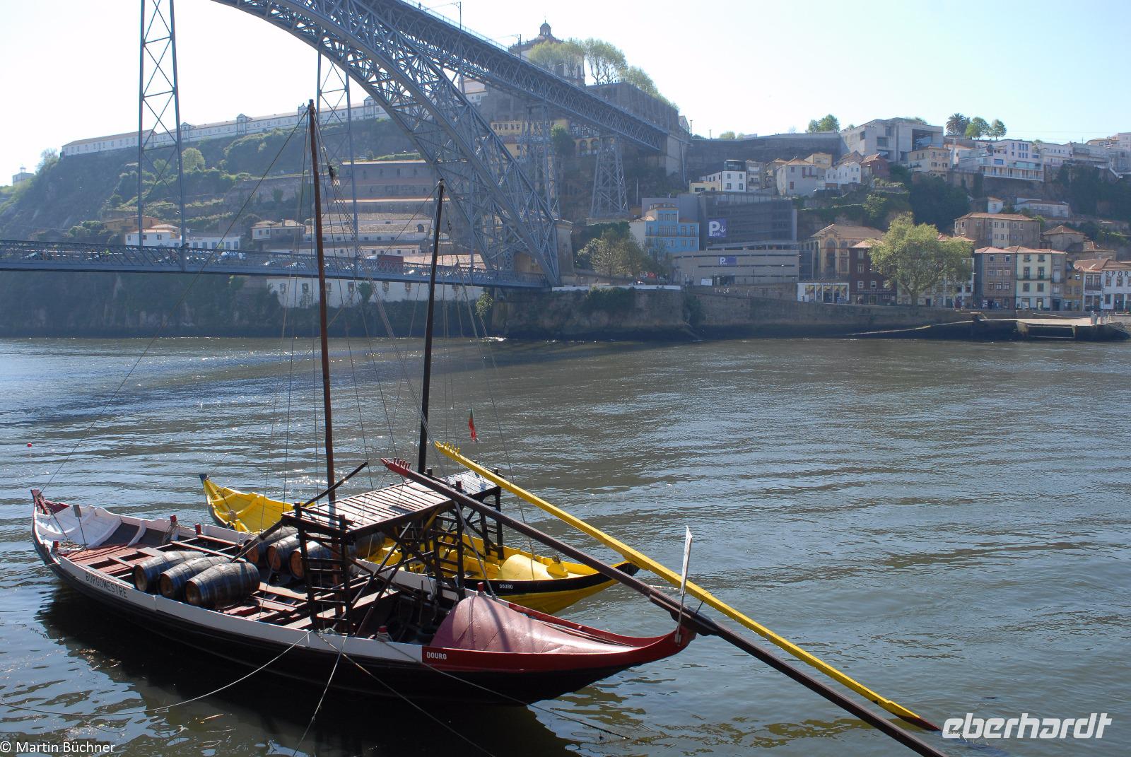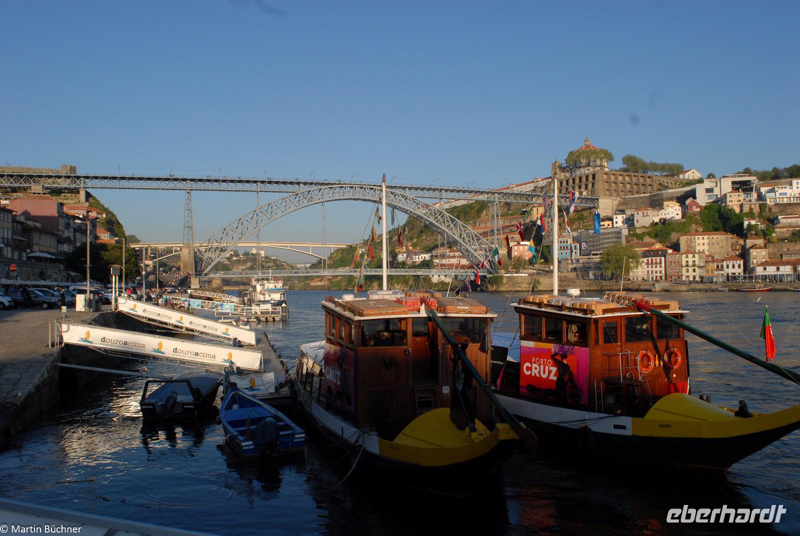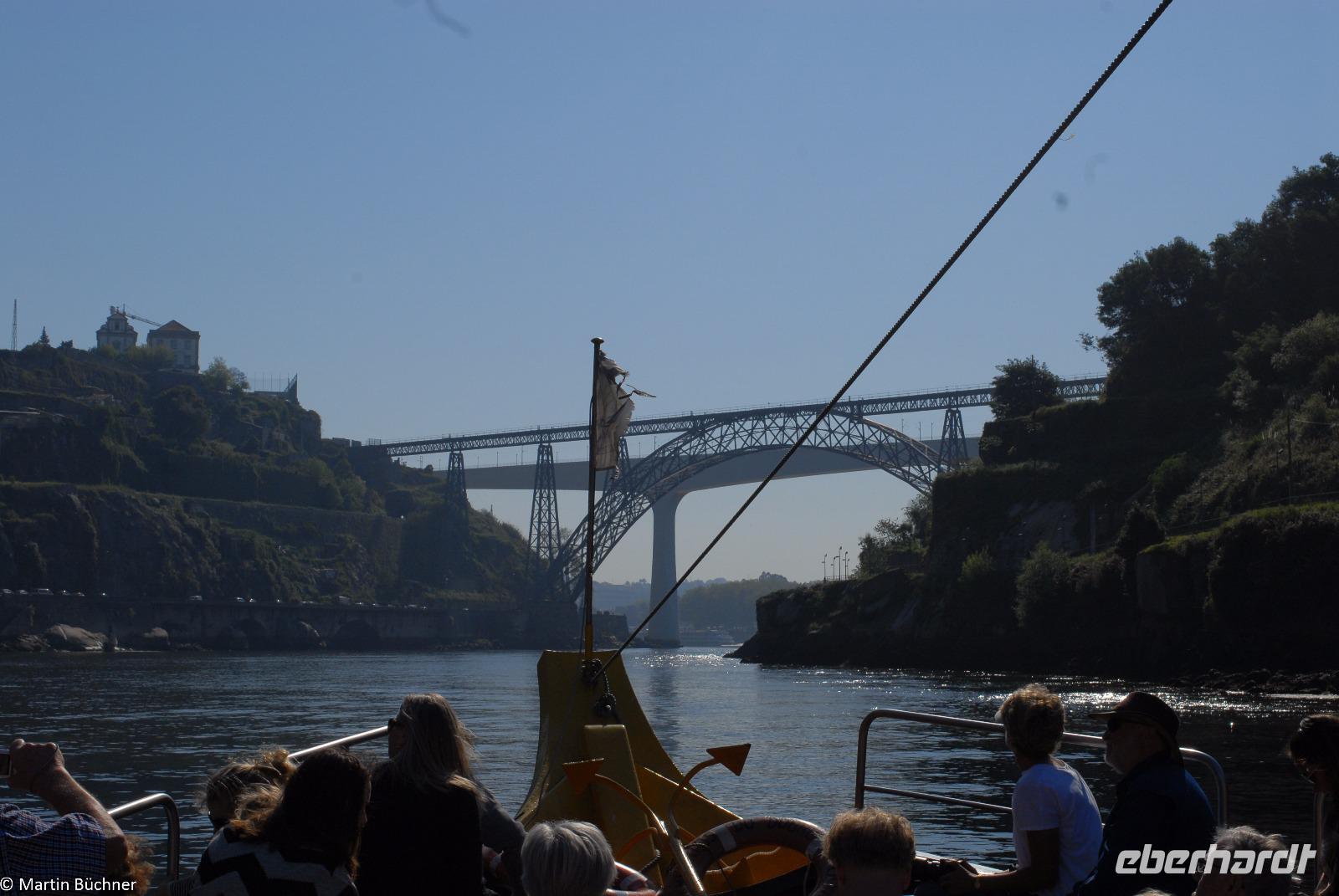 Wir möchten uns die Szenerie heute von der Flussseite her anschauen. Mit einem, den traditionellen Portwein-Booten nachempfundenen Schiff fahren wir zunächst ein Stück flussaufwärts. Dann bewegen uns wir uns unter den fünf riesigen Brücken hindurch bis fast zur Mündung des Flusses.