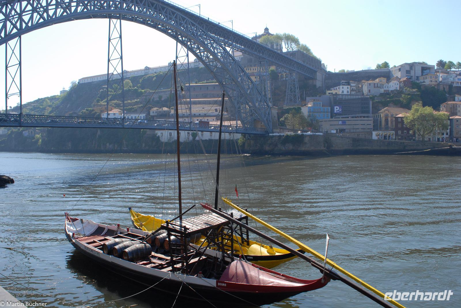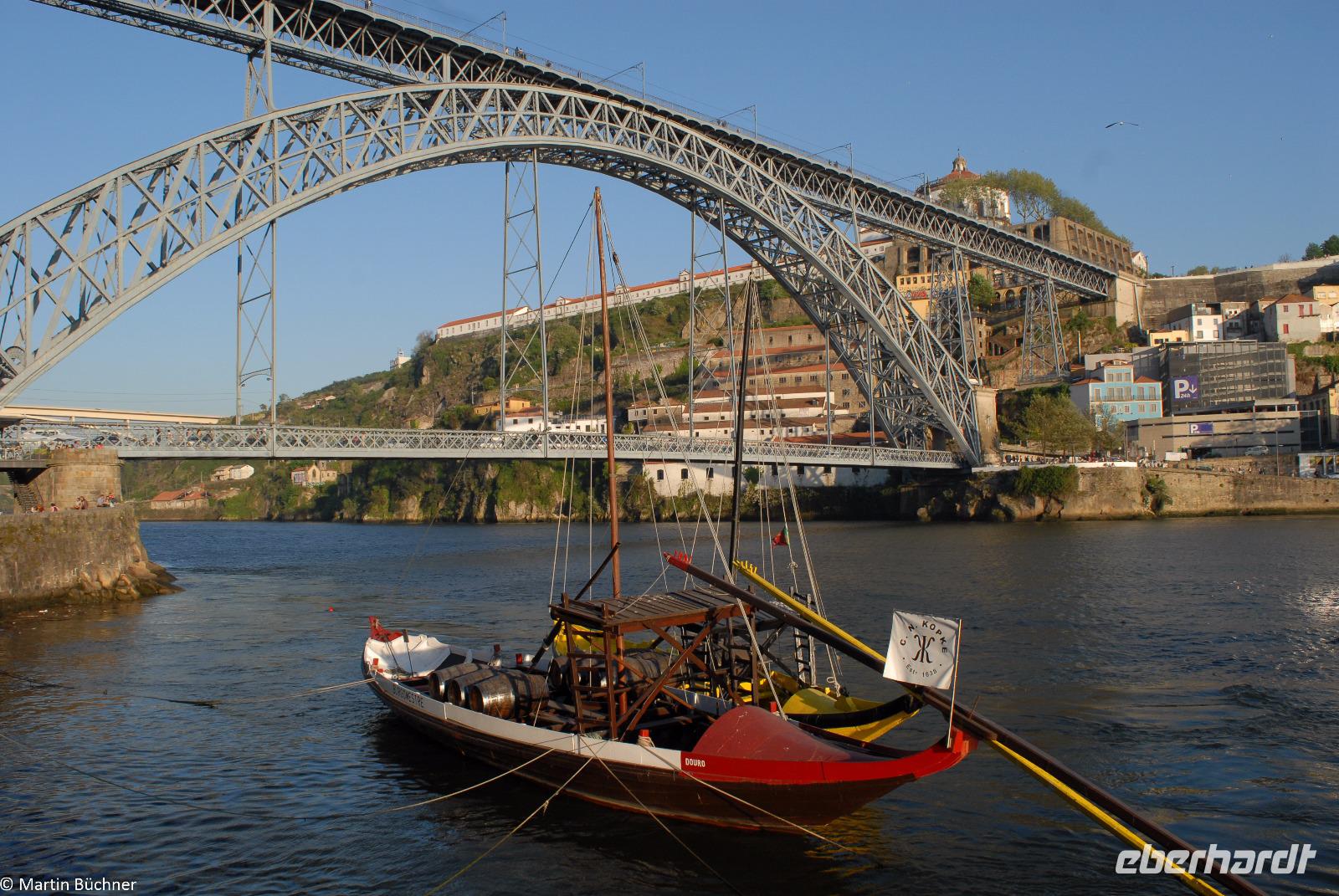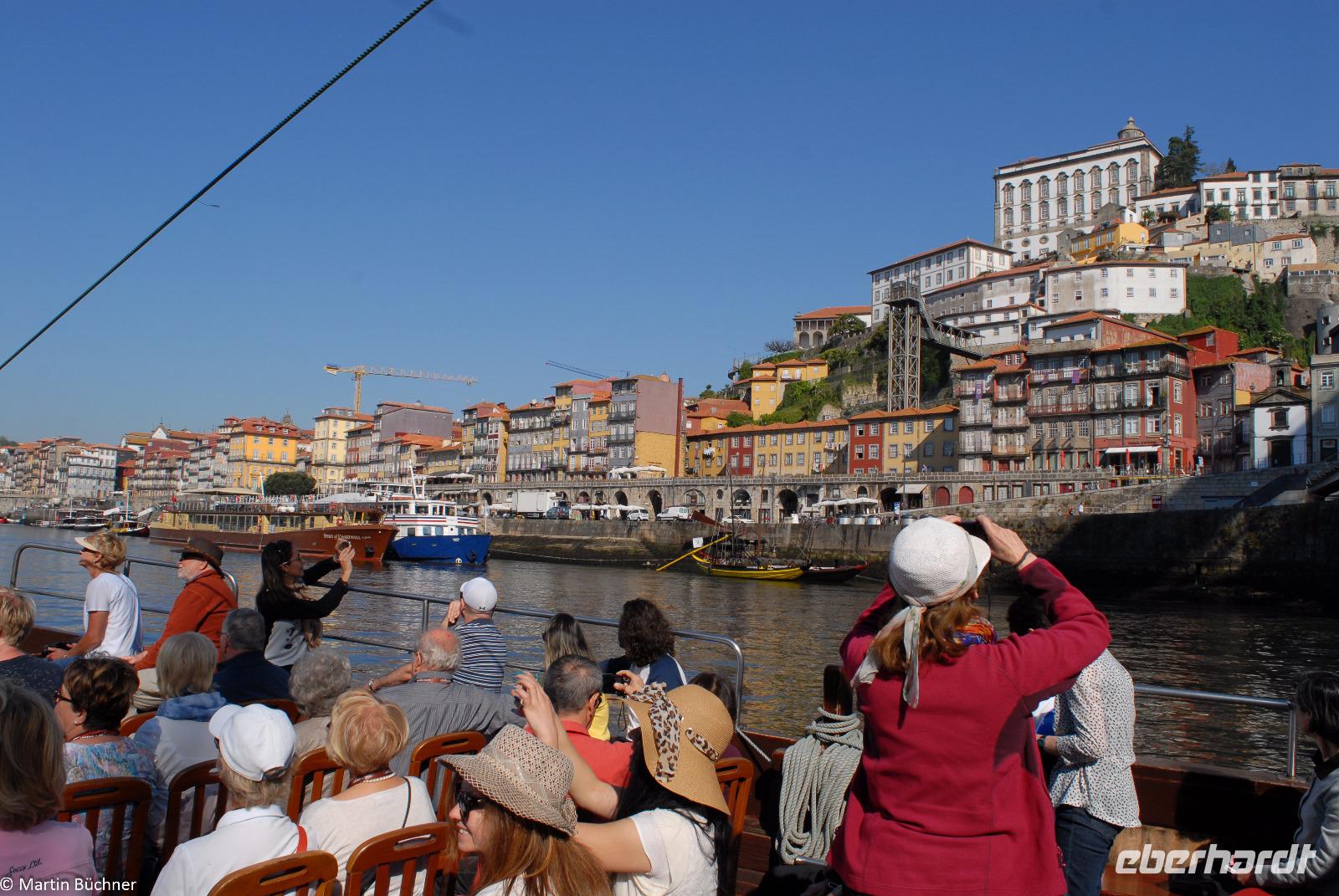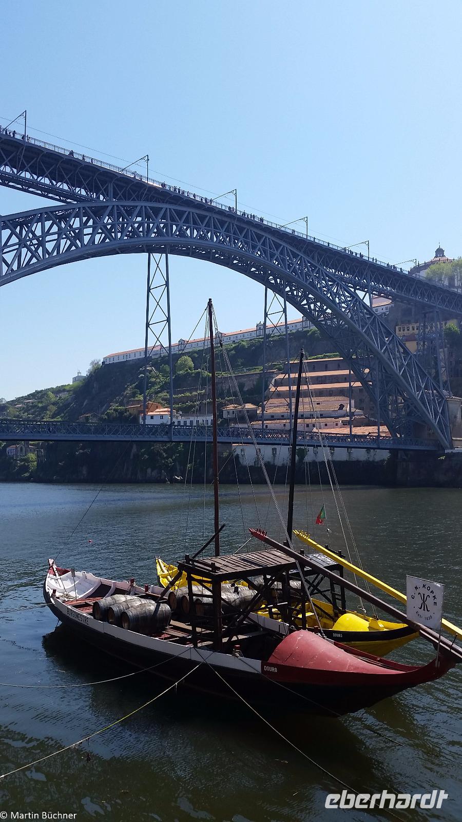Wir möchten uns die Szenerie heute von der Flussseite her anschauen. Mit einem, den traditionellen Portwein-Booten nachempfundenen Schiff fahren wir zunächst ein Stück flussaufwärts. Dann bewegen uns wir uns unter den fünf riesigen Brücken hindurch bis fast zur Mündung des Flusses.