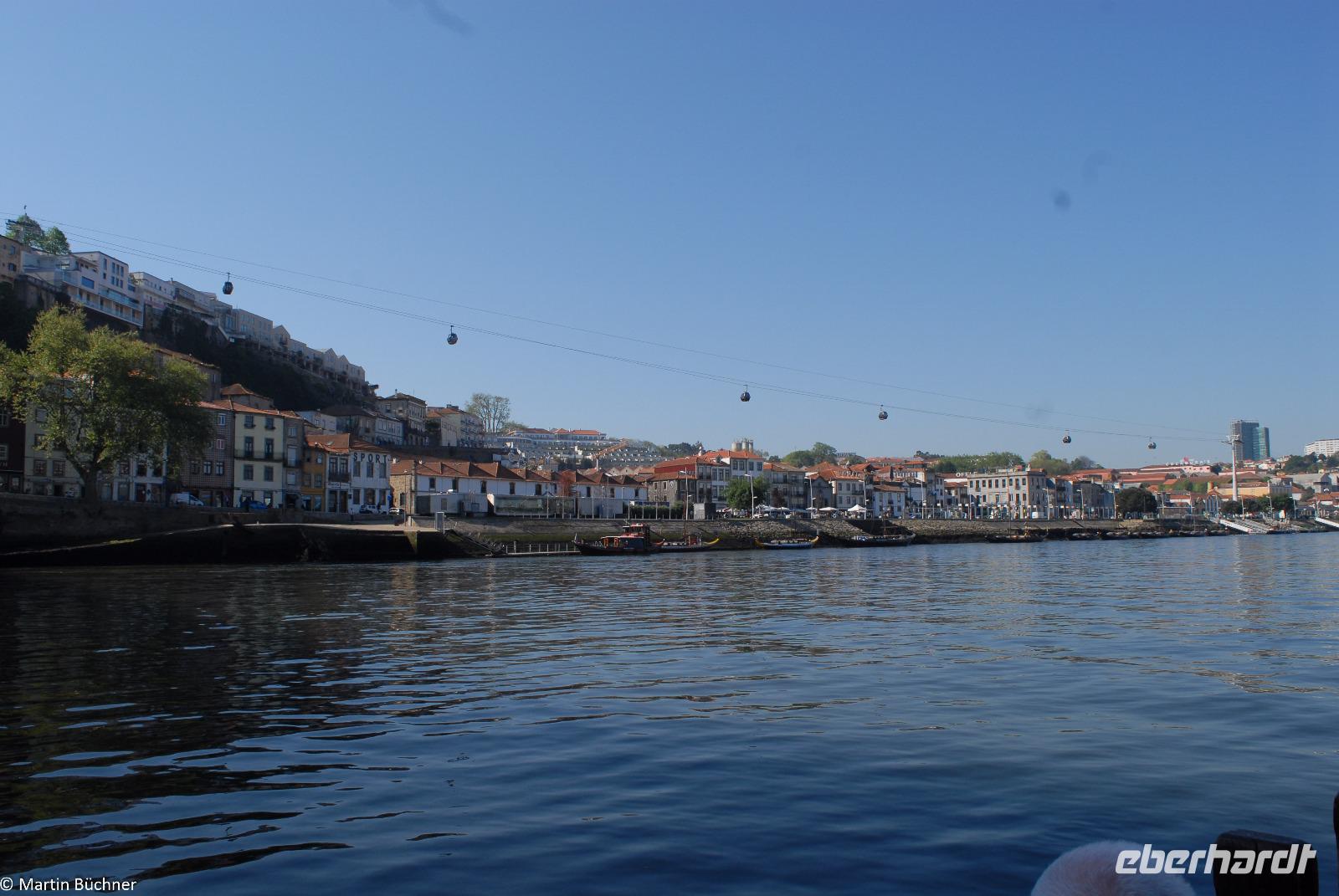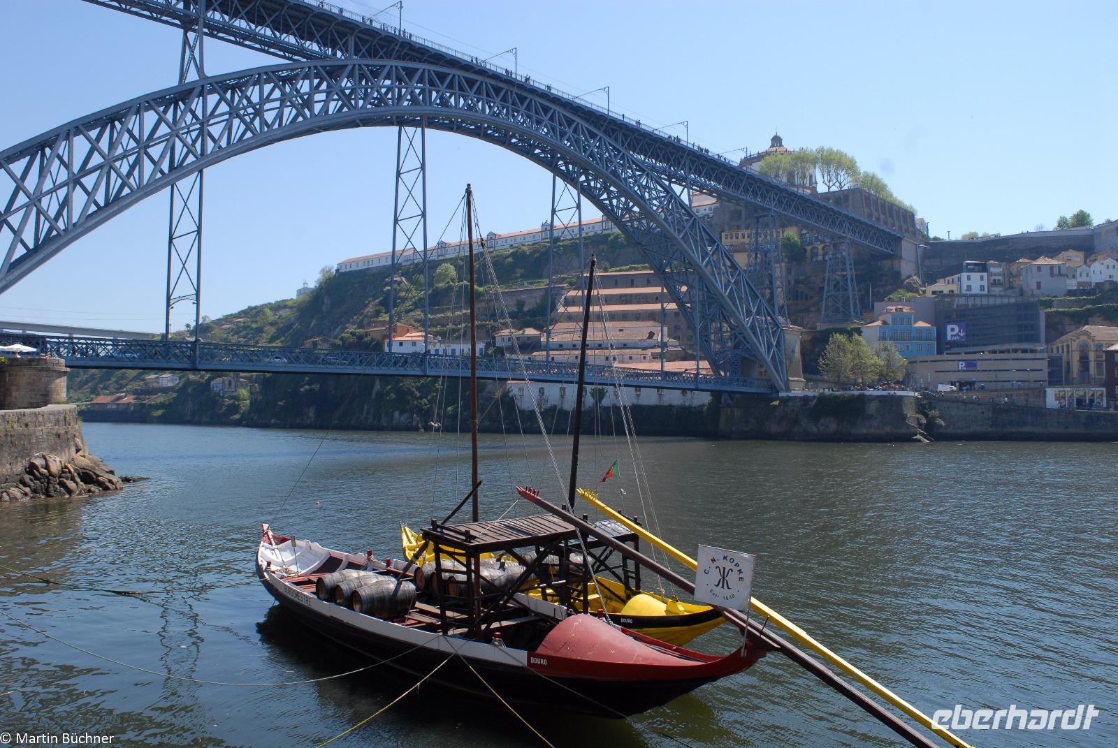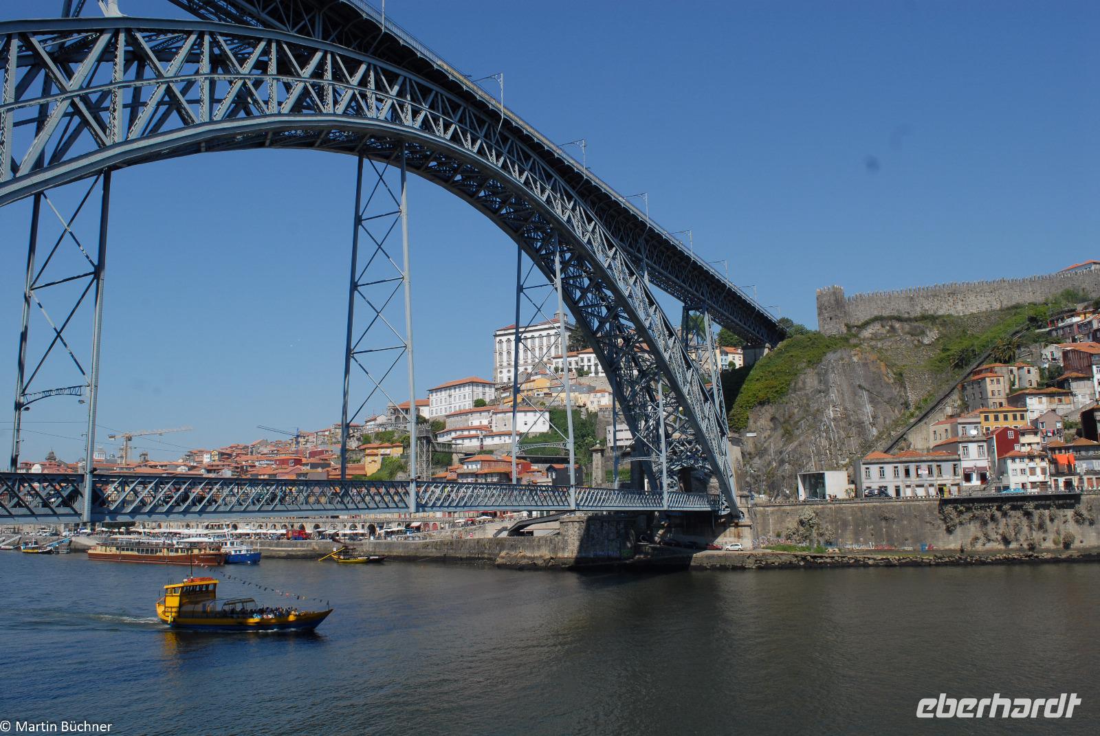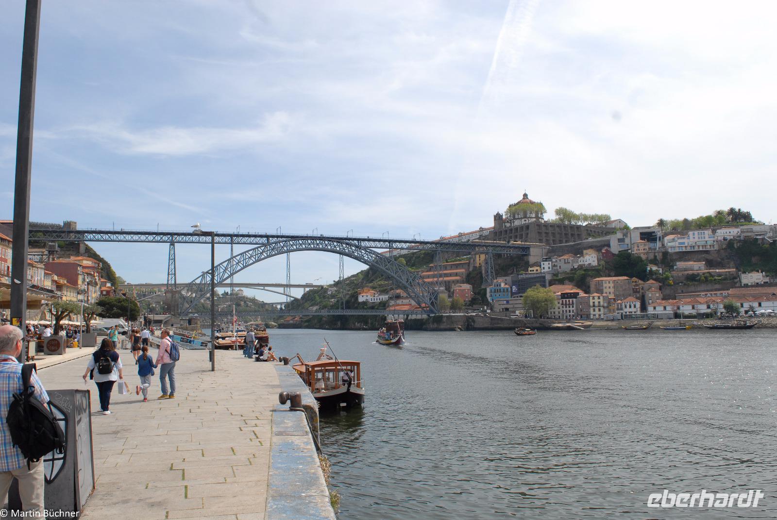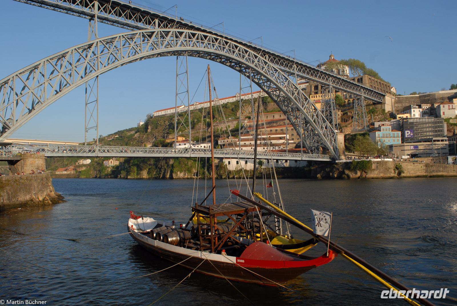 Wir möchten uns die Szenerie heute von der Flussseite her anschauen. Mit einem, den traditionellen Portwein-Booten nachempfundenen Schiff fahren wir zunächst ein Stück flussaufwärts. Dann bewegen uns wir uns unter den fünf riesigen Brücken hindurch bis fast zur Mündung des Flusses.