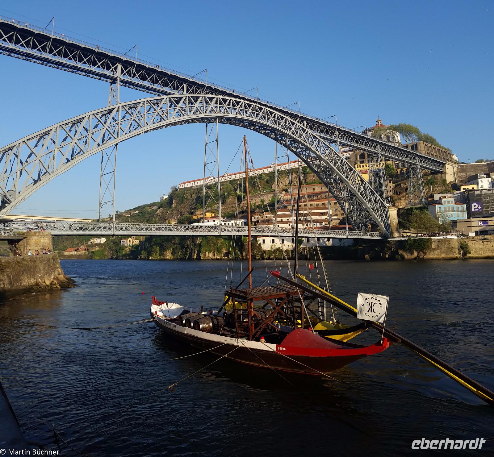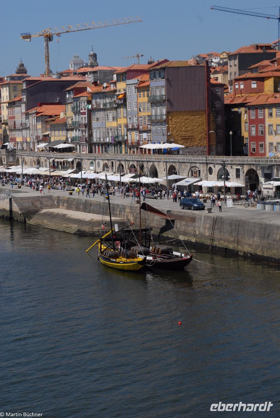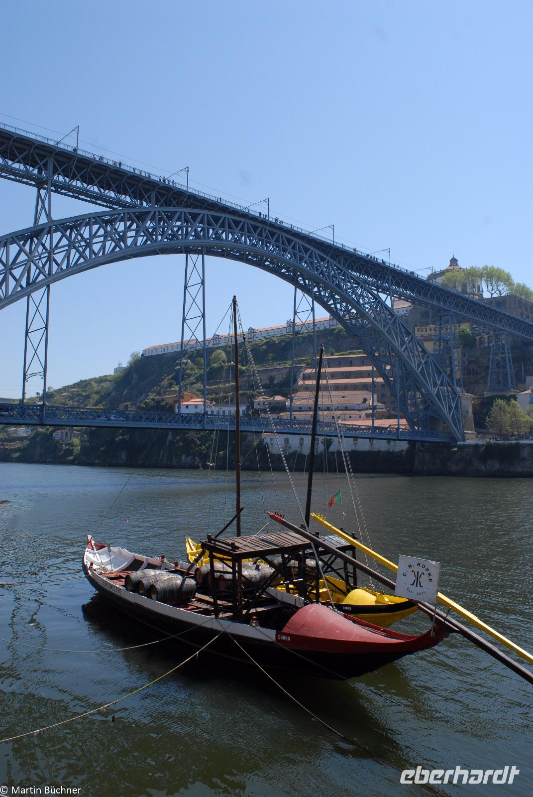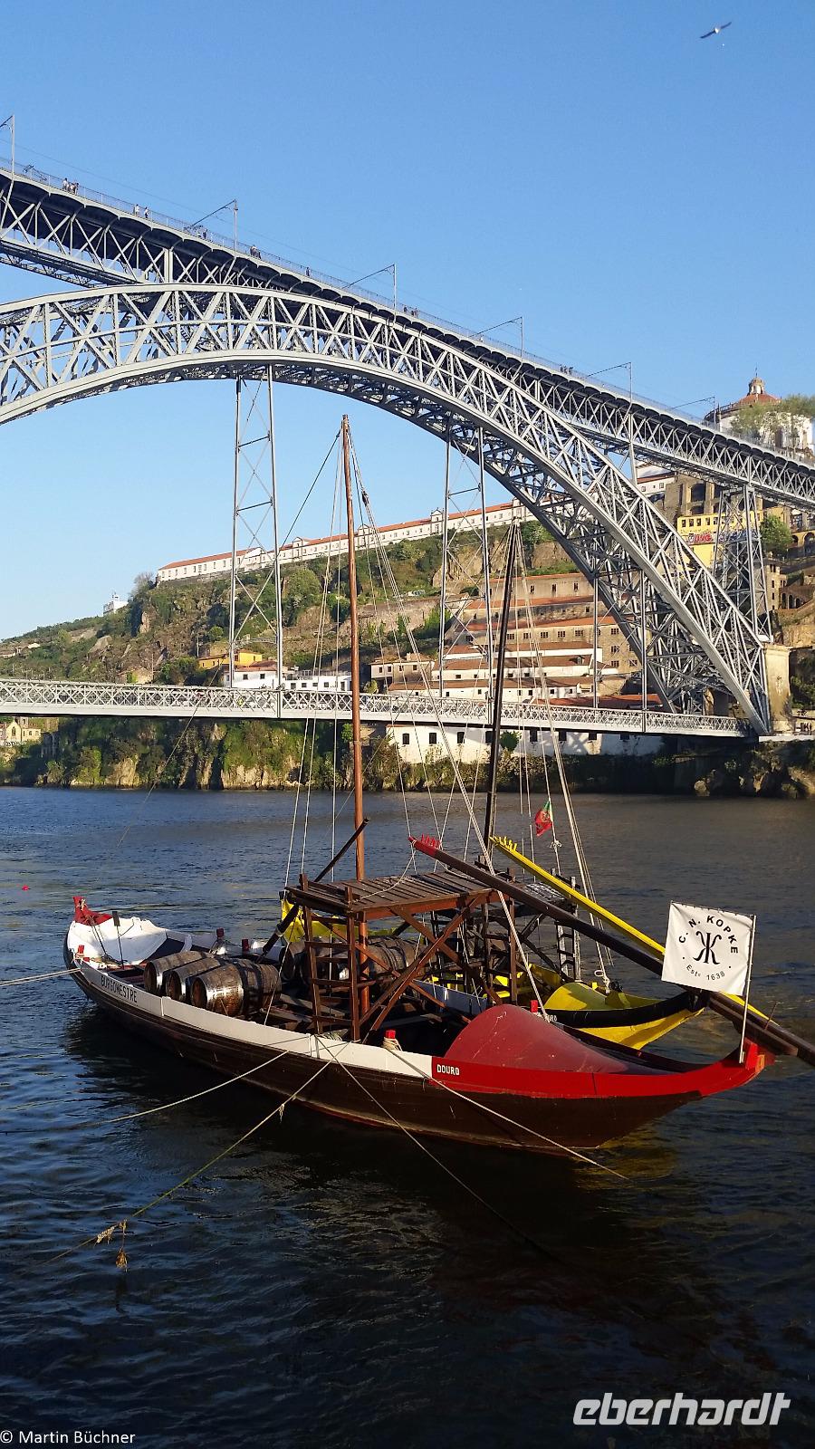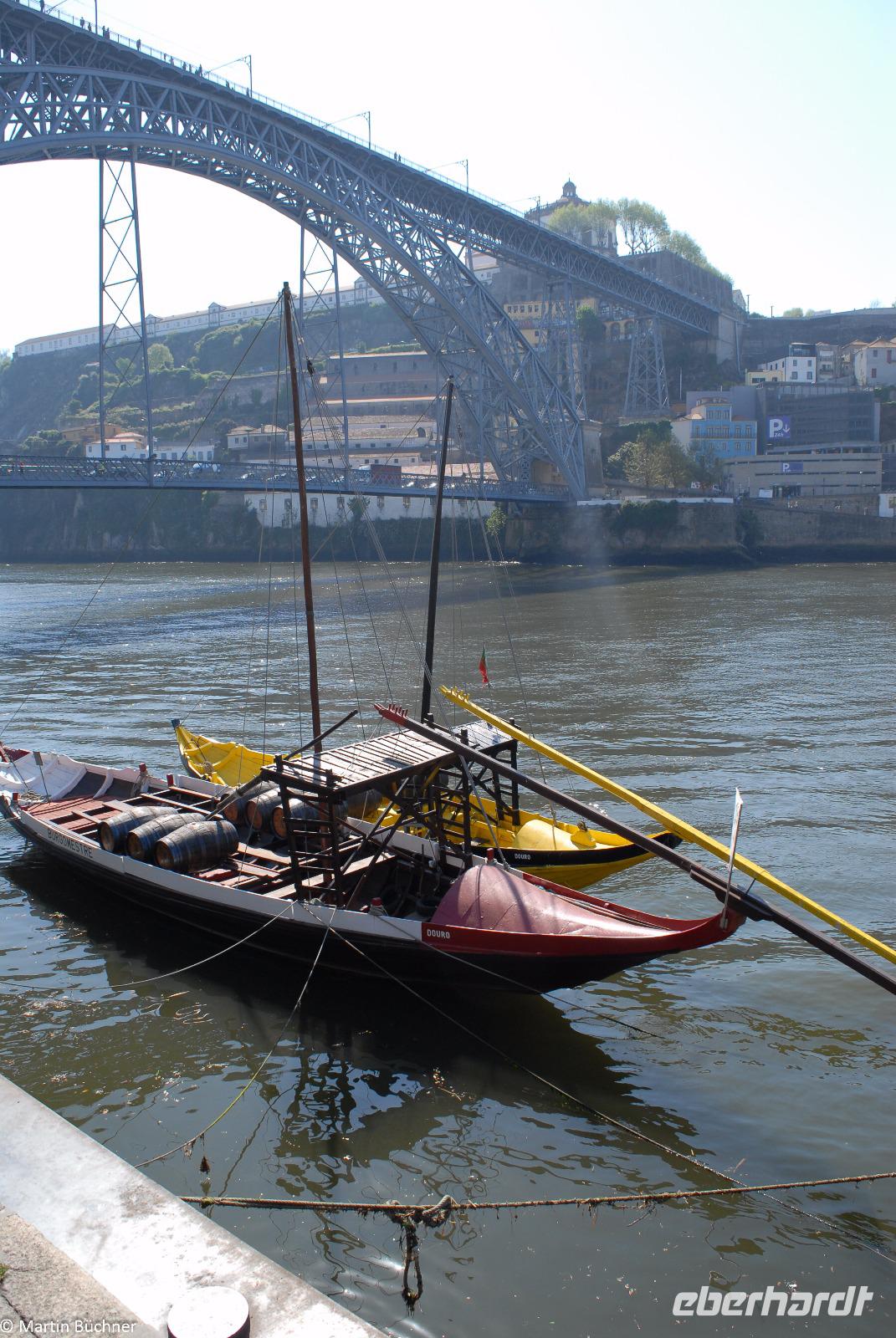 Wir möchten uns die Szenerie heute von der Flussseite her anschauen. Mit einem, den traditionellen Portwein-Booten nachempfundenen Schiff fahren wir zunächst ein Stück flussaufwärts. Dann bewegen uns wir uns unter den fünf riesigen Brücken hindurch bis fast zur Mündung des Flusses.
