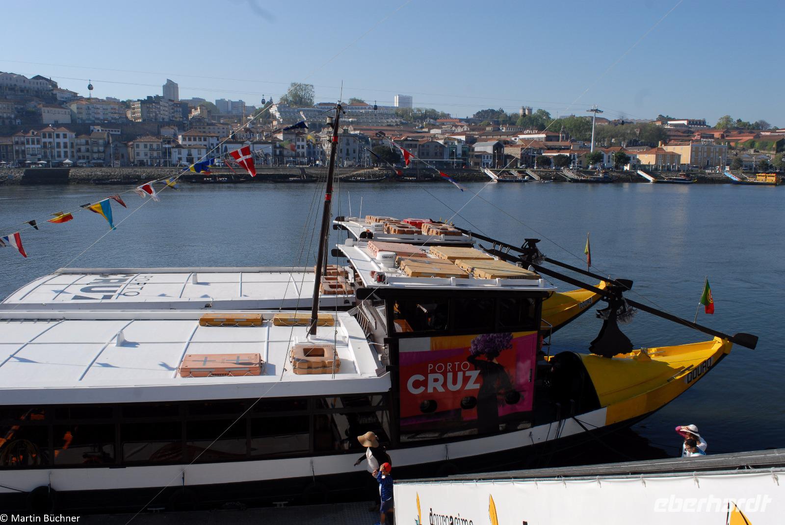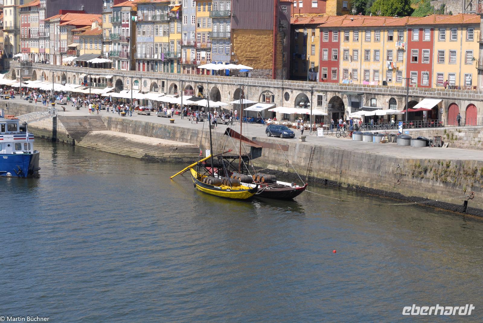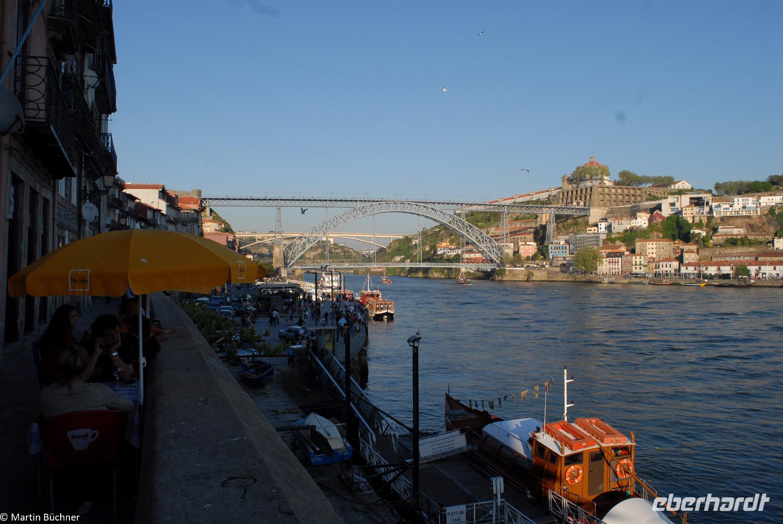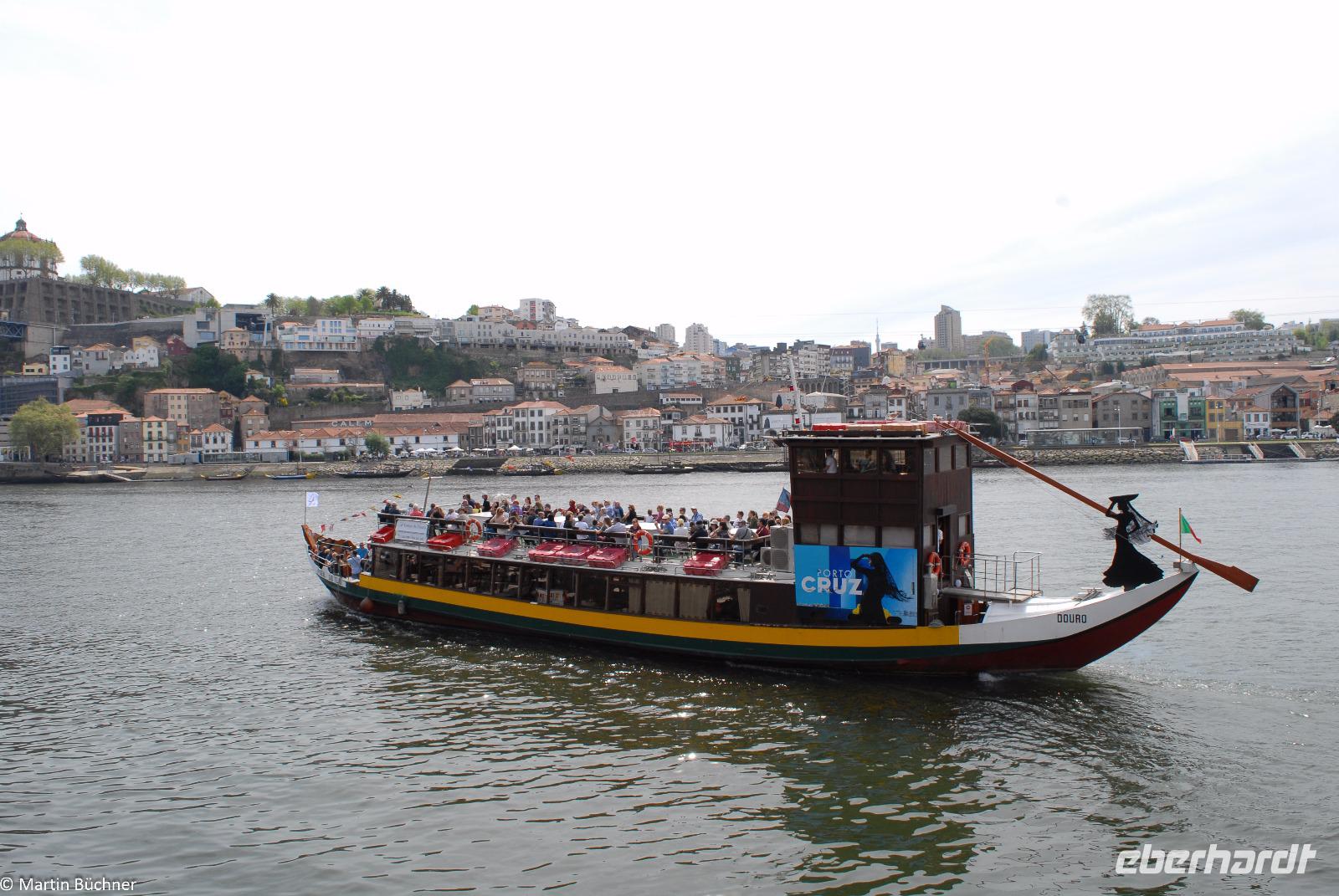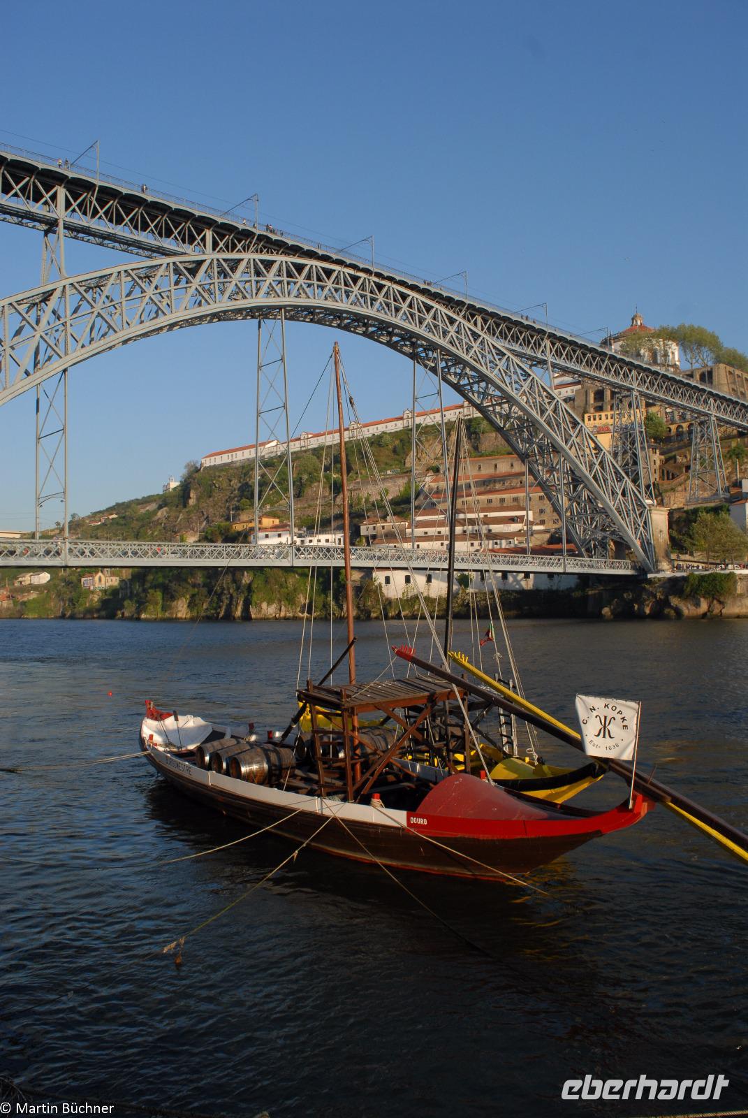 Wir möchten uns die Szenerie heute von der Flussseite her anschauen. Mit einem, den traditionellen Portwein-Booten nachempfundenen Schiff fahren wir zunächst ein Stück flussaufwärts. Dann bewegen uns wir uns unter den fünf riesigen Brücken hindurch bis fast zur Mündung des Flusses.