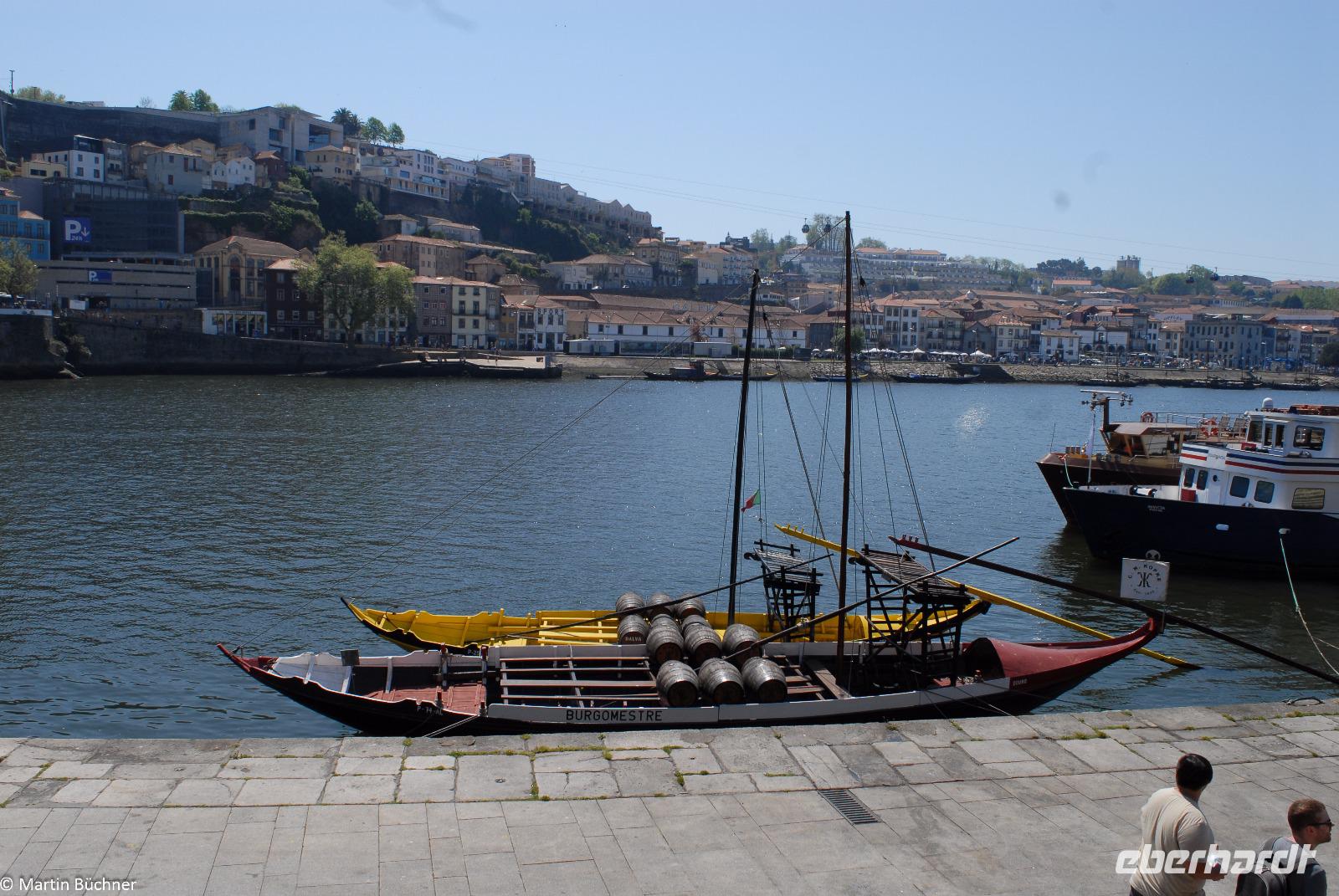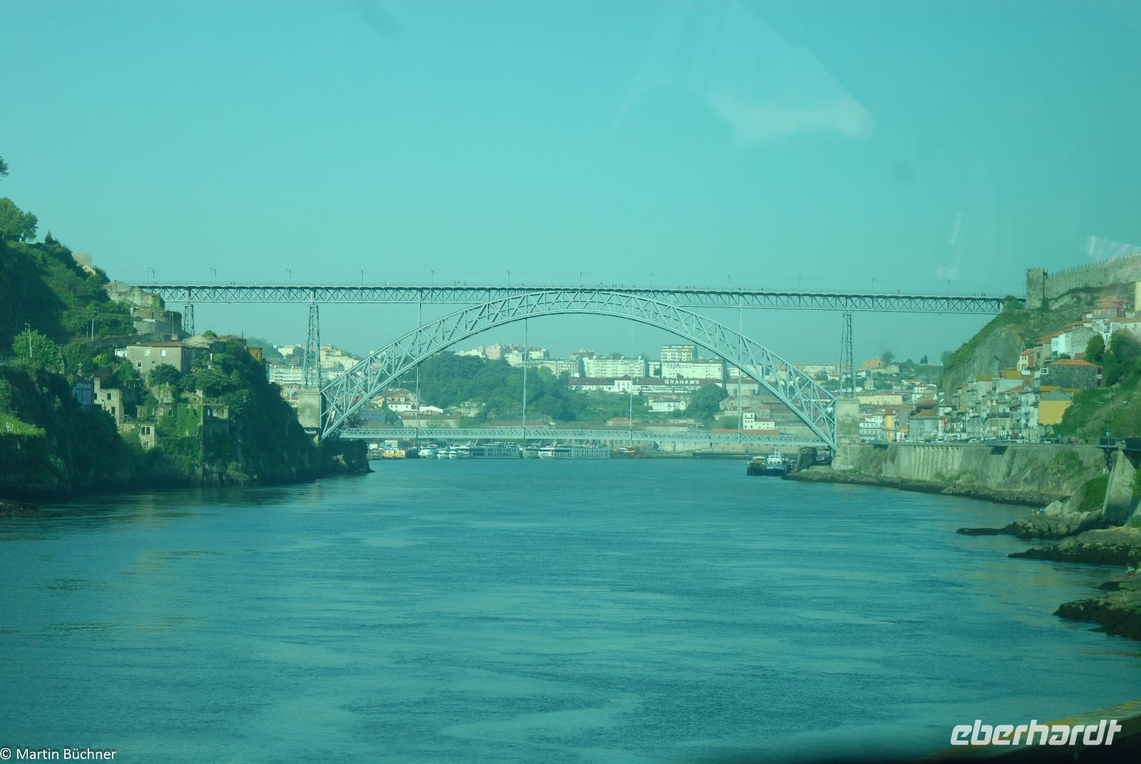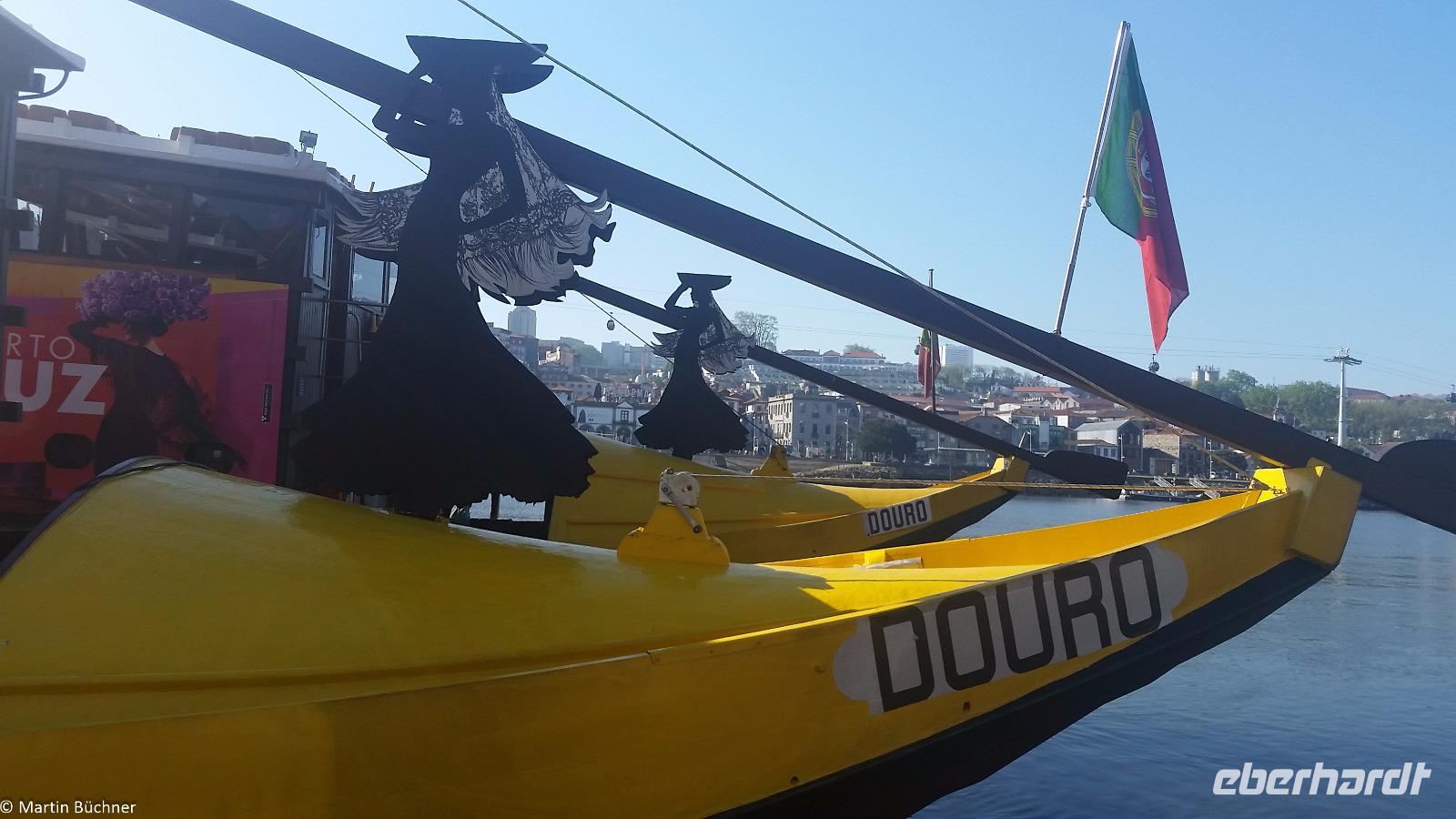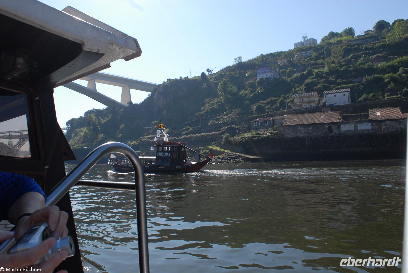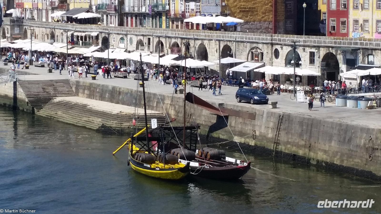 Wir möchten uns die Szenerie heute von der Flussseite her anschauen. Mit einem, den traditionellen Portwein-Booten nachempfundenen Schiff fahren wir zunächst ein Stück flussaufwärts. Dann bewegen uns wir uns unter den fünf riesigen Brücken hindurch bis fast zur Mündung des Flusses.