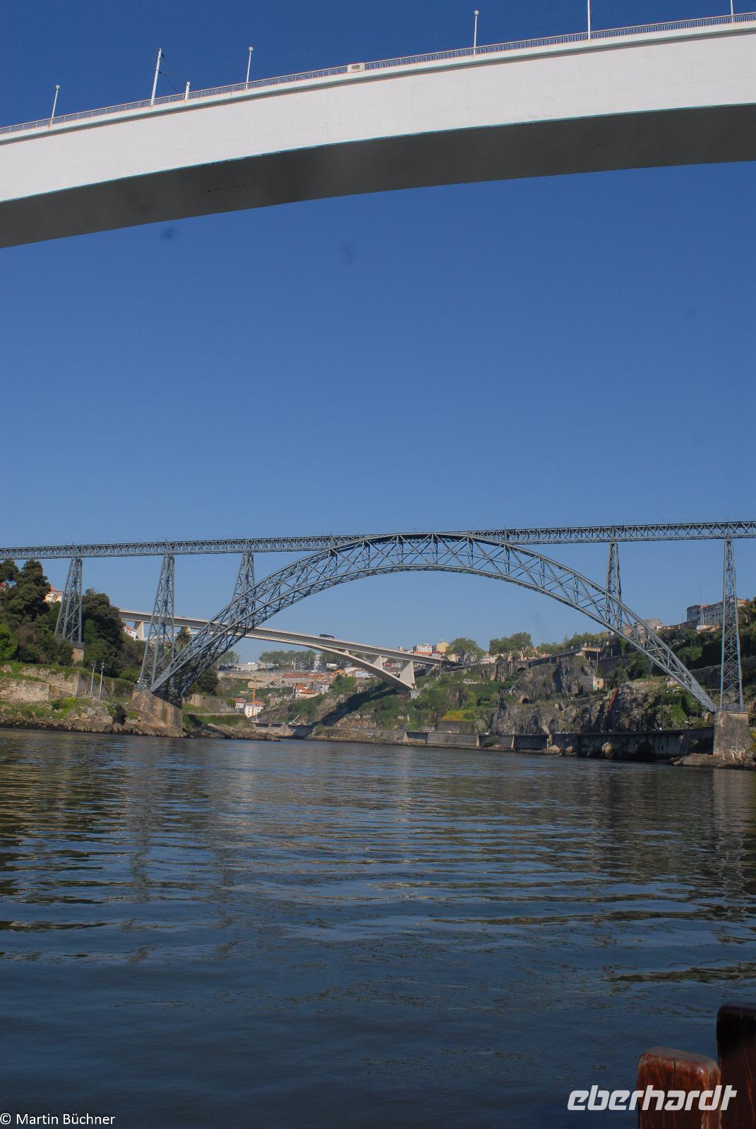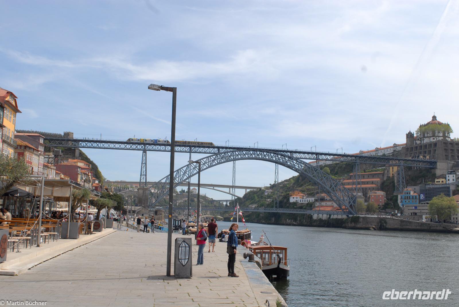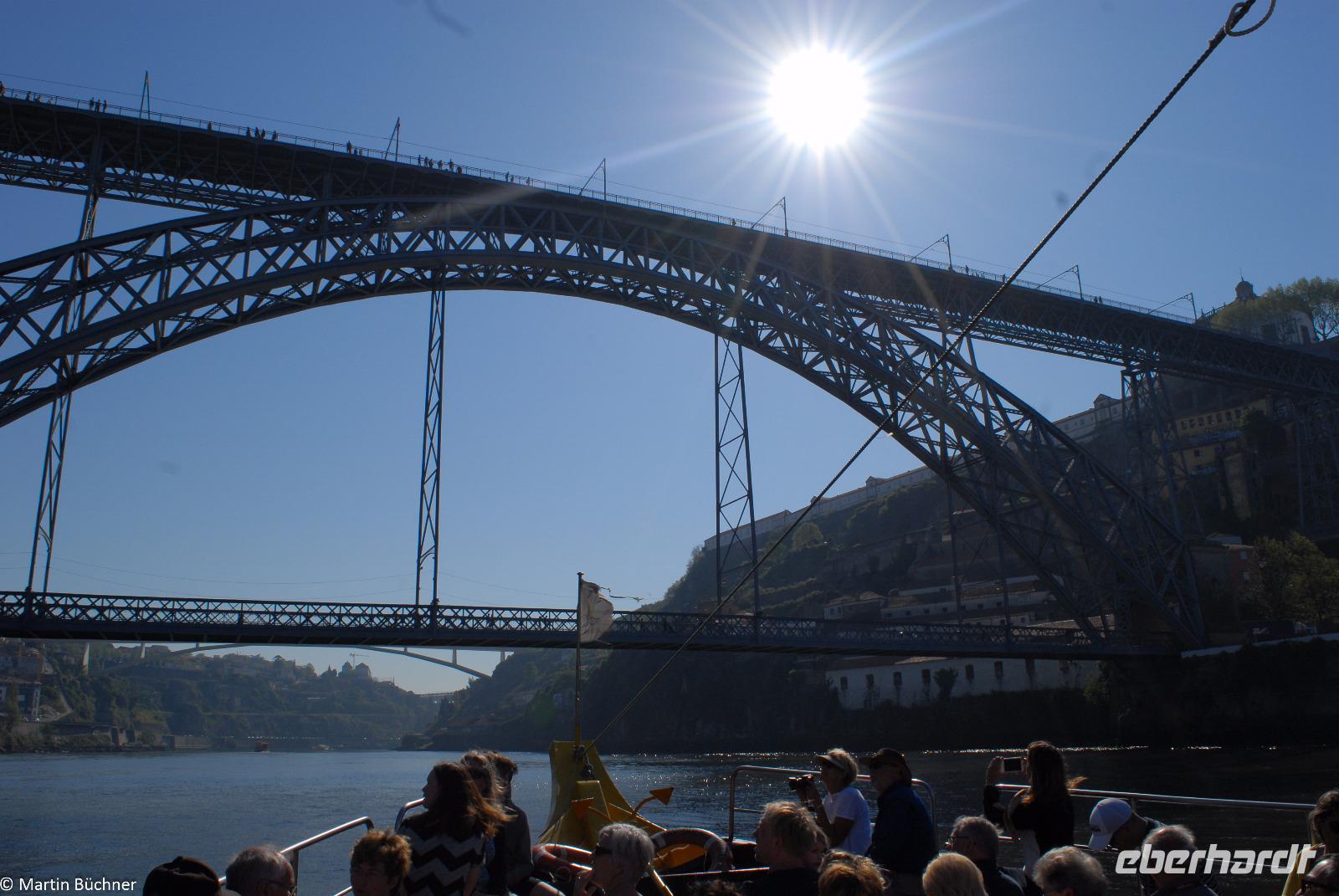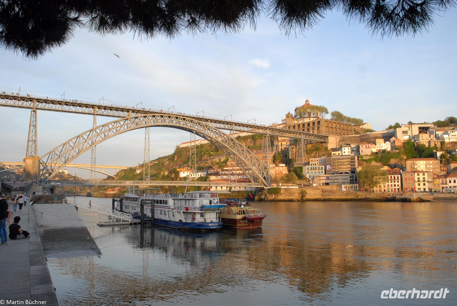 Wir möchten uns die Szenerie heute von der Flussseite her anschauen. Mit einem, den traditionellen Portwein-Booten nachempfundenen Schiff fahren wir zunächst ein Stück flussaufwärts. Dann bewegen uns wir uns unter den fünf riesigen Brücken hindurch bis fast zur Mündung des Flusses.