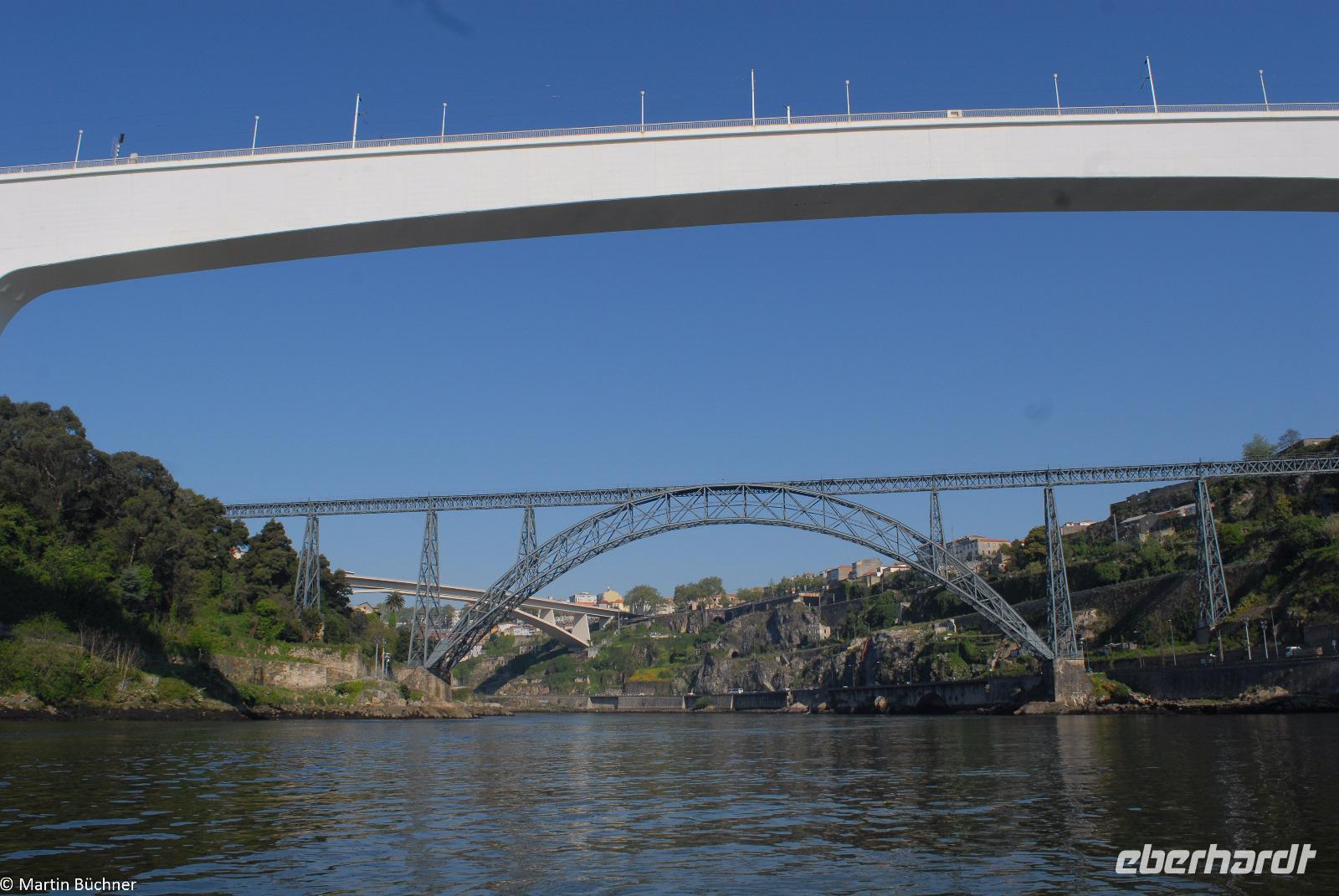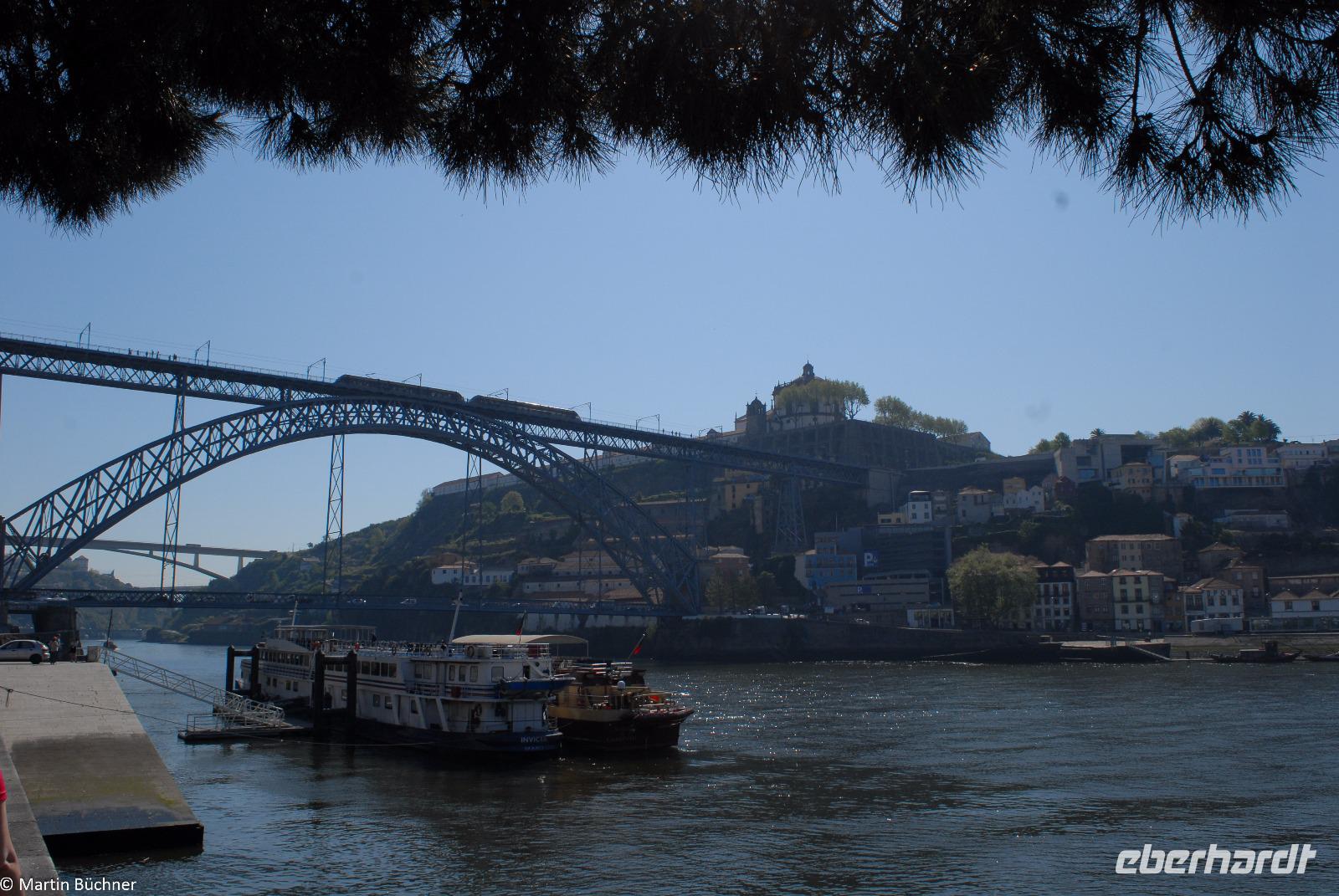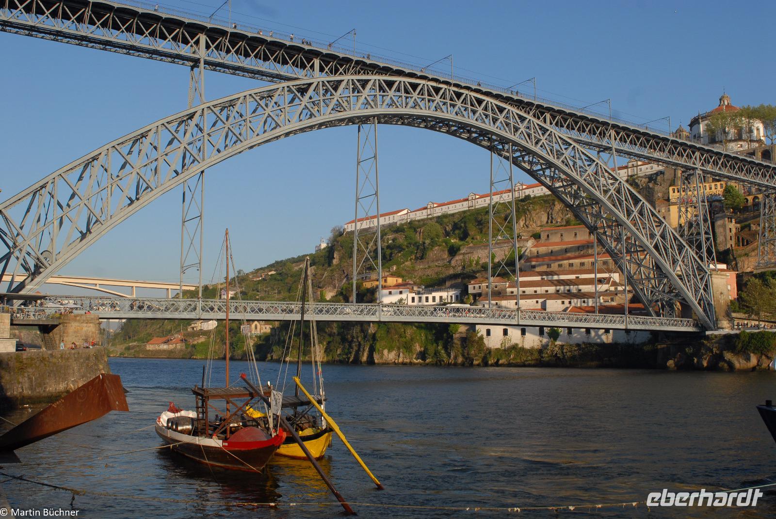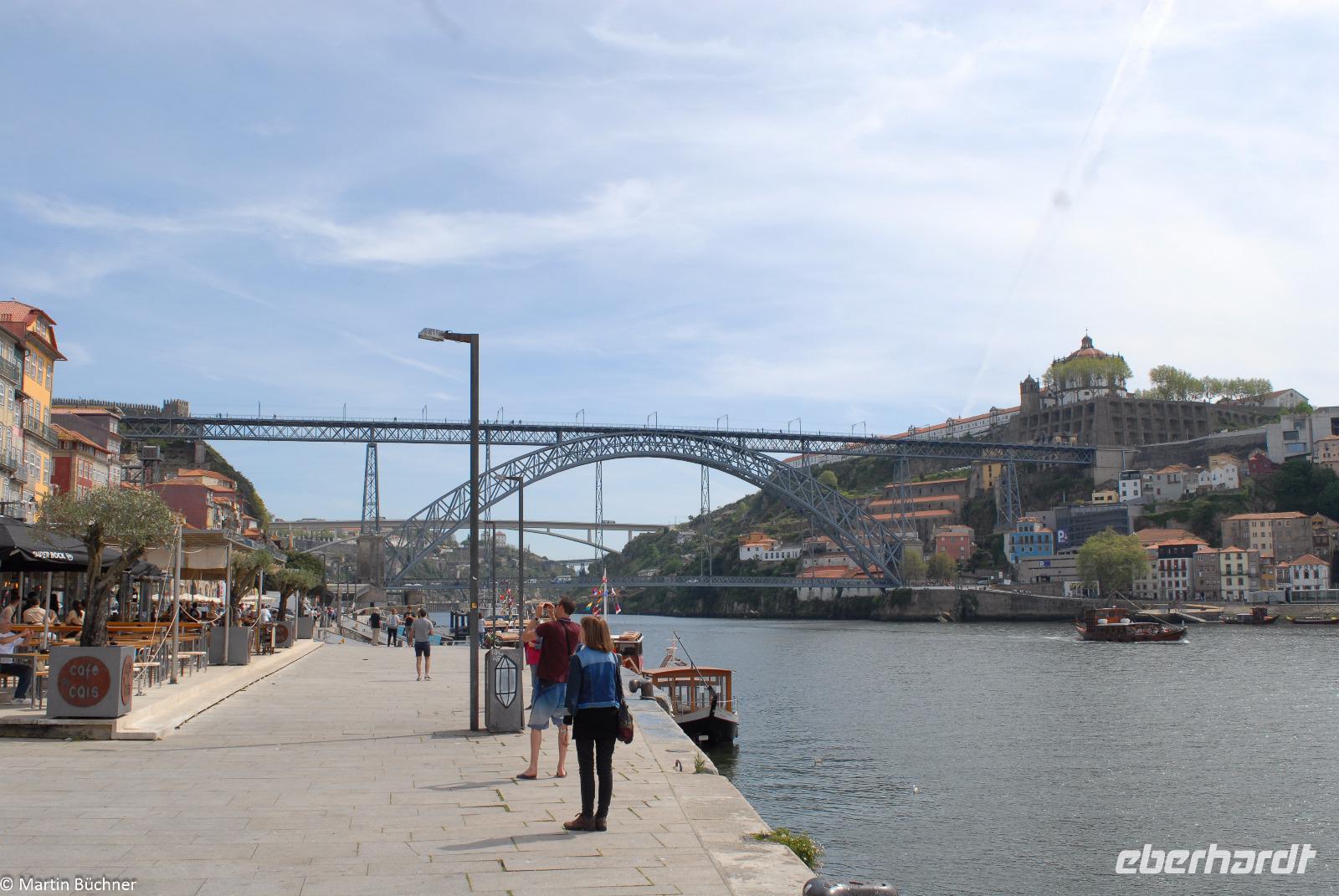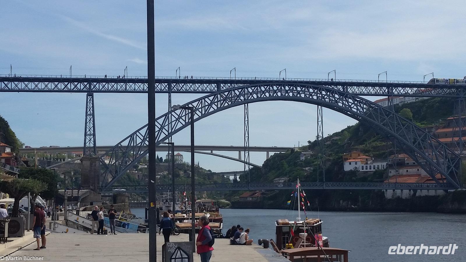 Wir möchten uns die Szenerie heute von der Flussseite her anschauen. Mit einem, den traditionellen Portwein-Booten nachempfundenen Schiff fahren wir zunächst ein Stück flussaufwärts. Dann bewegen uns wir uns unter den fünf riesigen Brücken hindurch bis fast zur Mündung des Flusses.