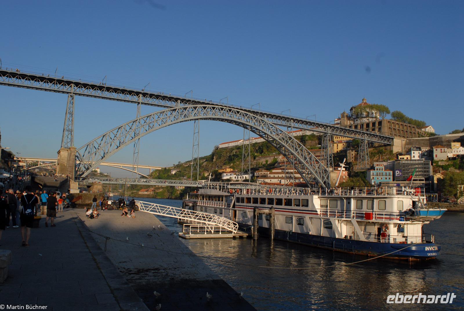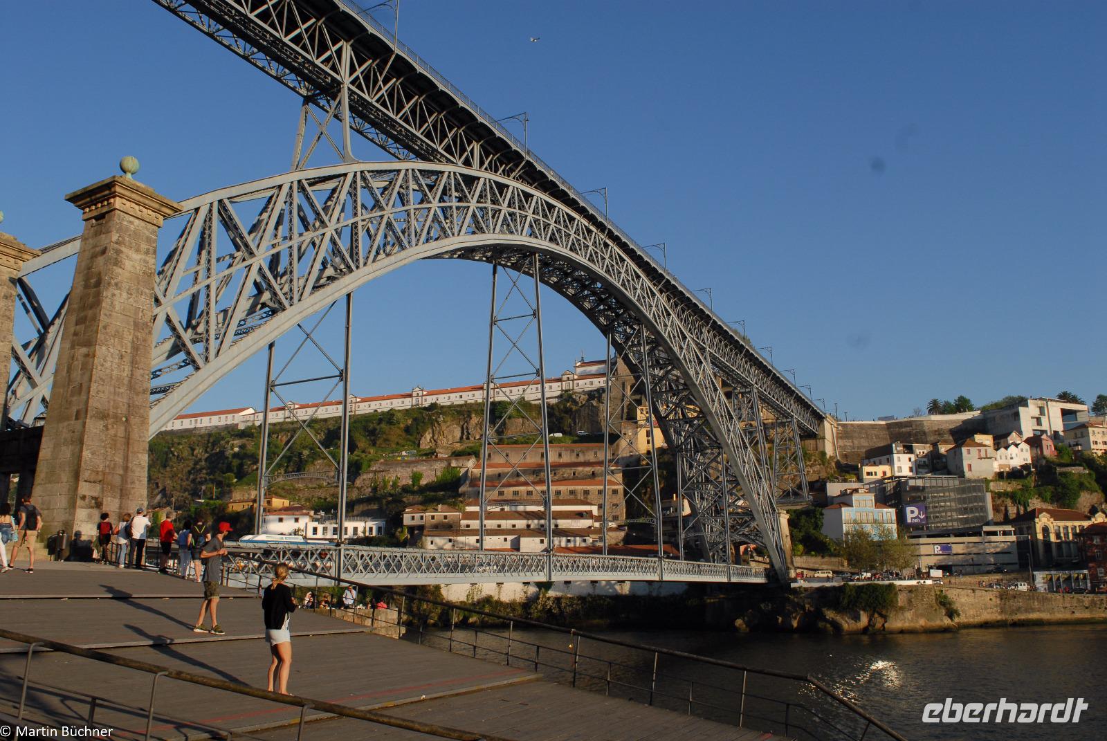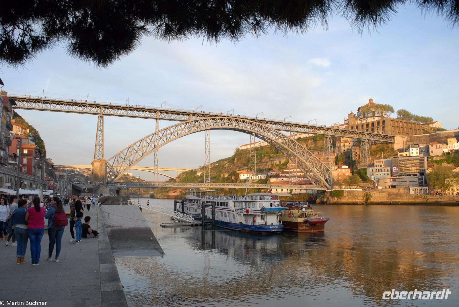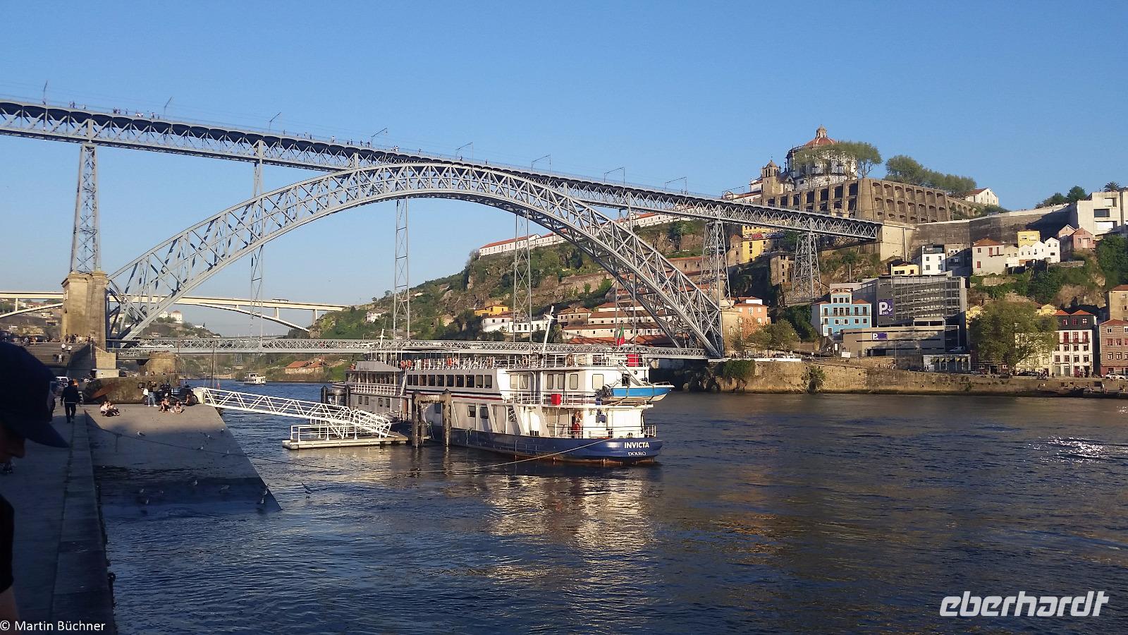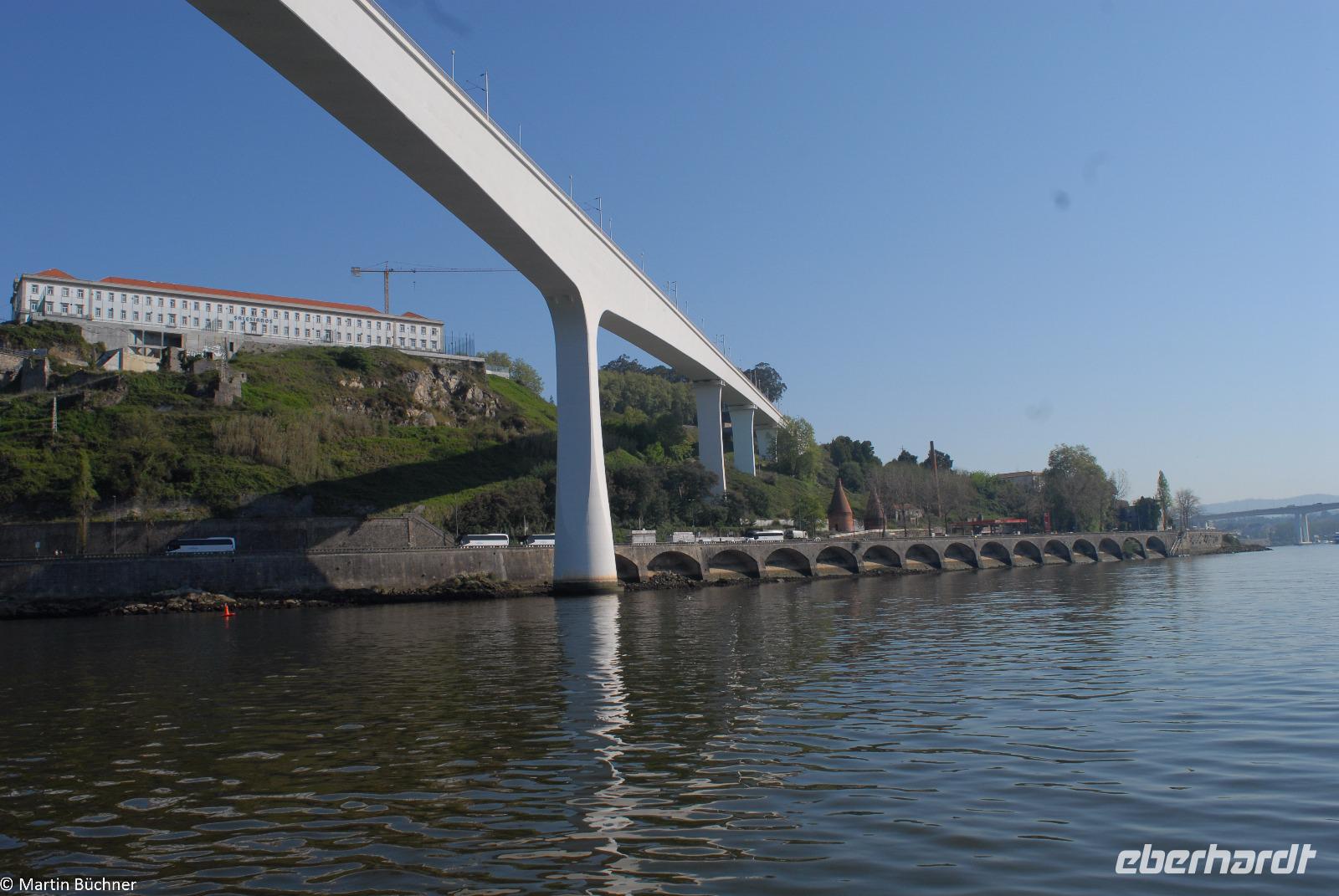 Wir möchten uns die Szenerie heute von der Flussseite her anschauen. Mit einem, den traditionellen Portwein-Booten nachempfundenen Schiff fahren wir zunächst ein Stück flussaufwärts. Dann bewegen uns wir uns unter den fünf riesigen Brücken hindurch bis fast zur Mündung des Flusses.